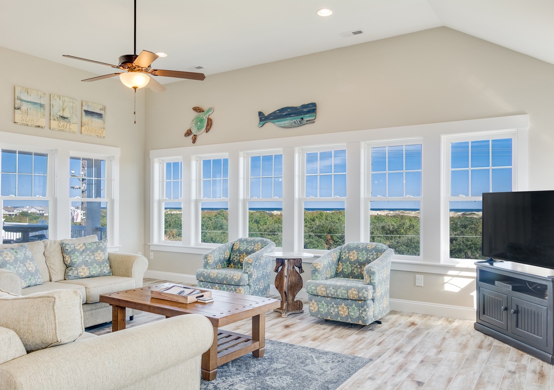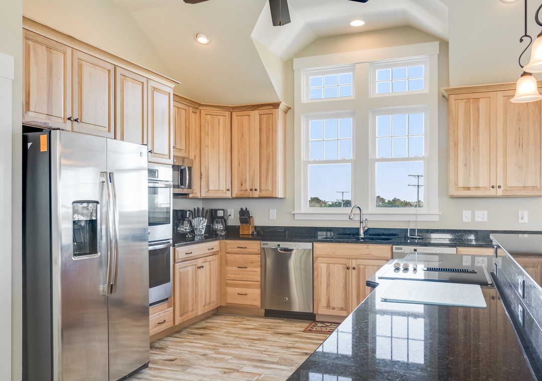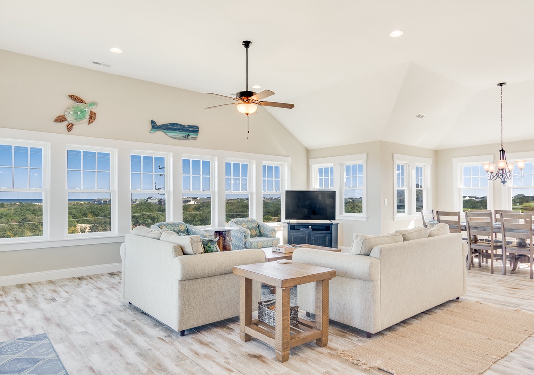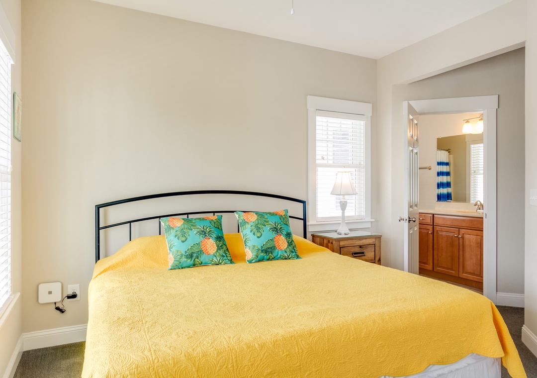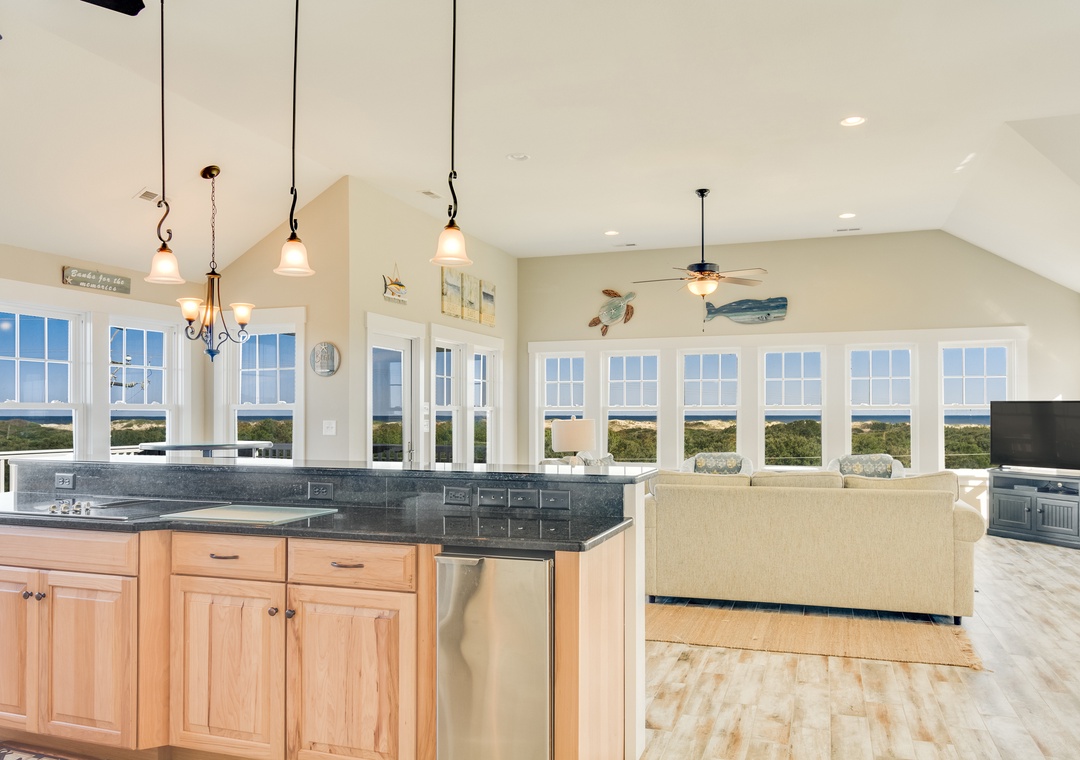 One floor above is the primary living area in this reverse floor plan. This top floor includes owner's master suite with king bed and a spacious ensuite with large walk-in shower. This room offers direct view of sunrises and sunsets. The gourmet equipped kitchen features stainless steel appliances, granite countertops and additional seating at the bar for family time. There is plenty of space for everyone to gather in the great room with vaulted ceilings and did we mention those ocean views?!?