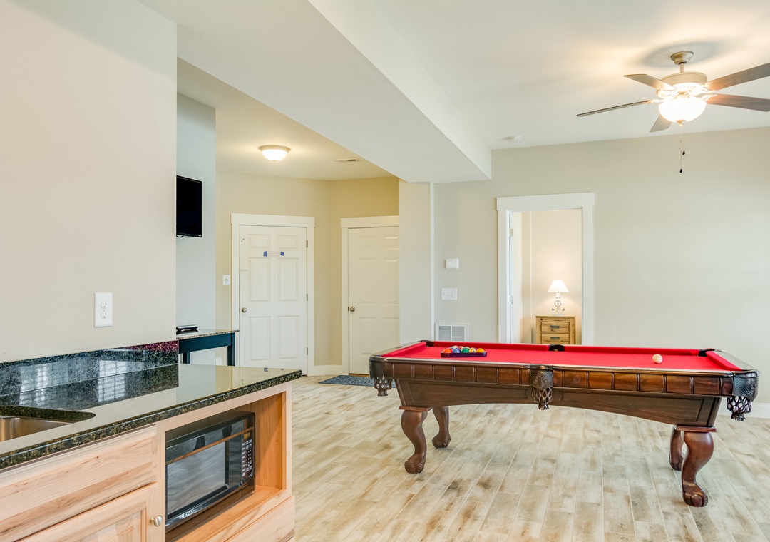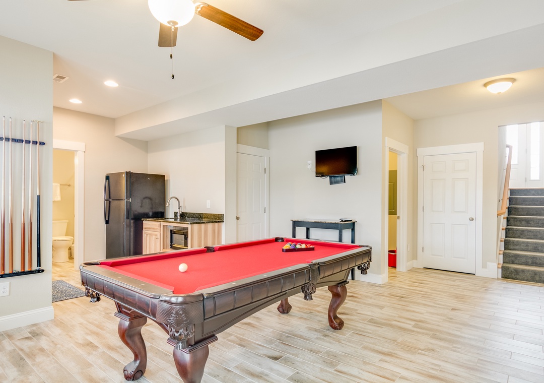 Upon entering the home, you will find an elevator which is just the cure for hauling luggage, groceries and other items to the multiple floors. The ground floor offers a carpeted game room complete with ping pong and foosball tables; a pool table to shark your fellow quests; and a separate room for those teens to game at their leisure. This first level includes a queen bedroom with pool deck access and a full bath with shower. This bathroom is also convenient for swimmers and their wet suits just inside the home. Feel free to also try out the outdoor private shower (with hot and cold water) on the pool deck. The ground level game room with wet bar connects to the pool area for seamless indoor-outdoor living.