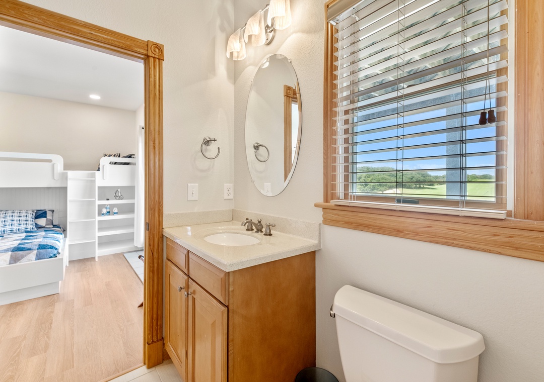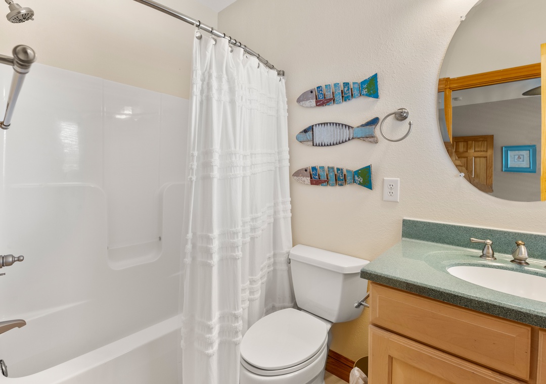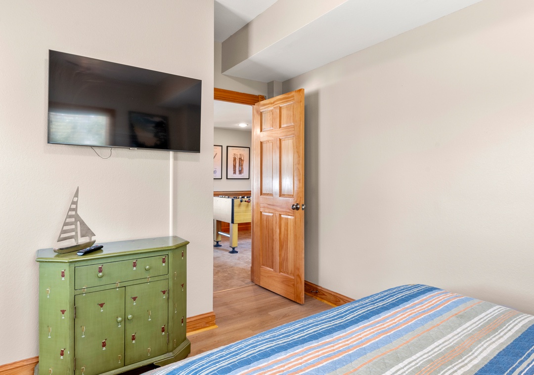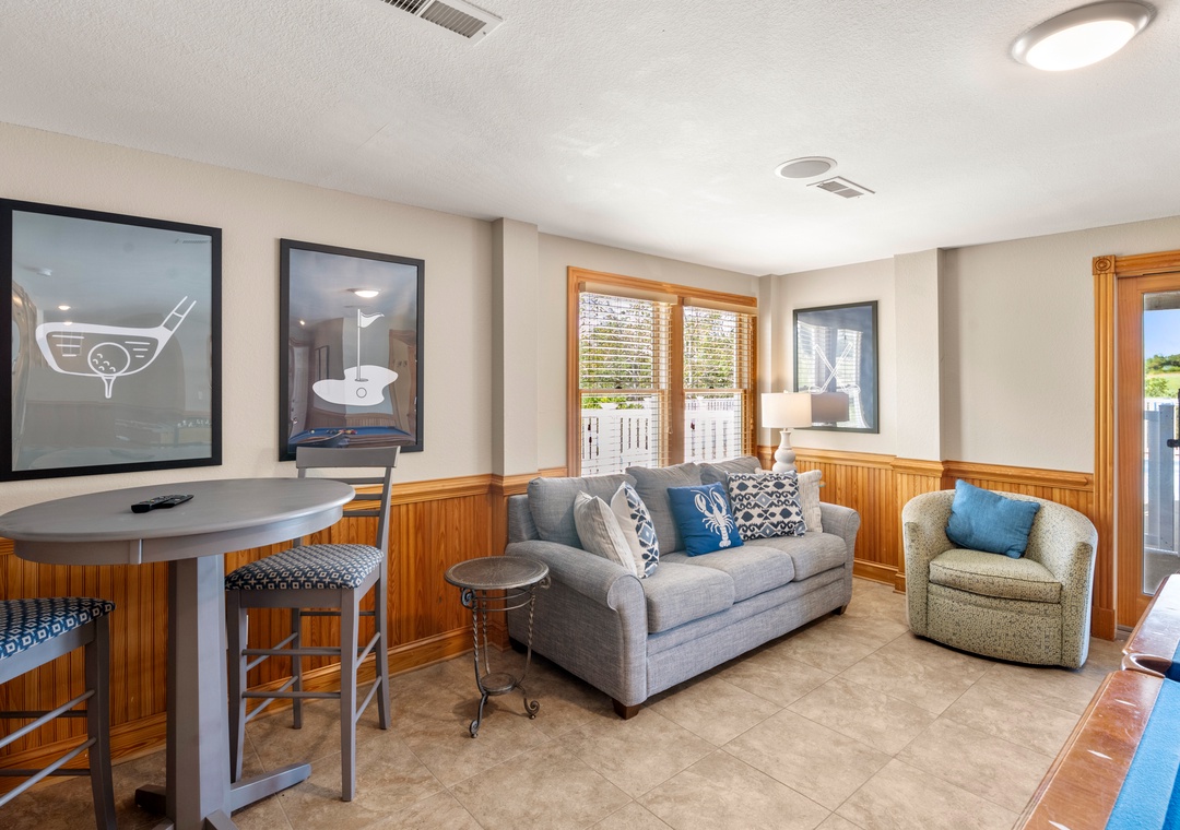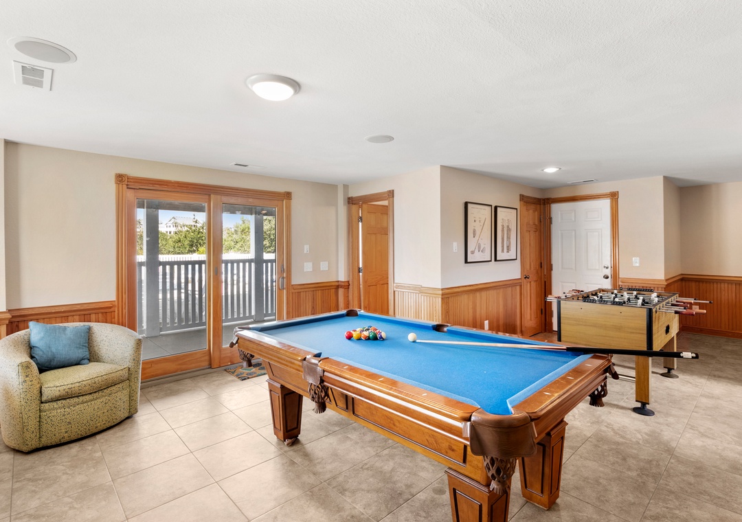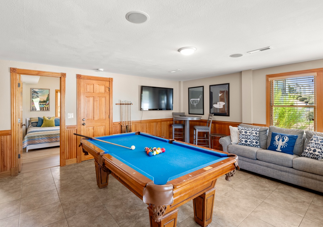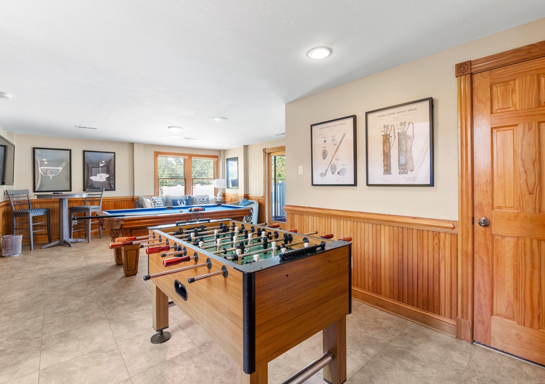 Four more bedrooms are located on the mid-level, two of which are additional ensuites, along with a second deck overlooking the fairway and pool. Downstairs, you'll find the sixth bedroom plus a large rec space that will be everyone's favorite room of the house. Challenge family and friends to a game of pool or a round of foosball. A ping pong table and pop-a-shot basketball game in the garage provide even more options for indoor entertainment. A pull-out sofa provides alternative options for sleeping arrangements if needed. The rec room leads directly to the backyard with a large private pool and hot tub for soaking away the day.
