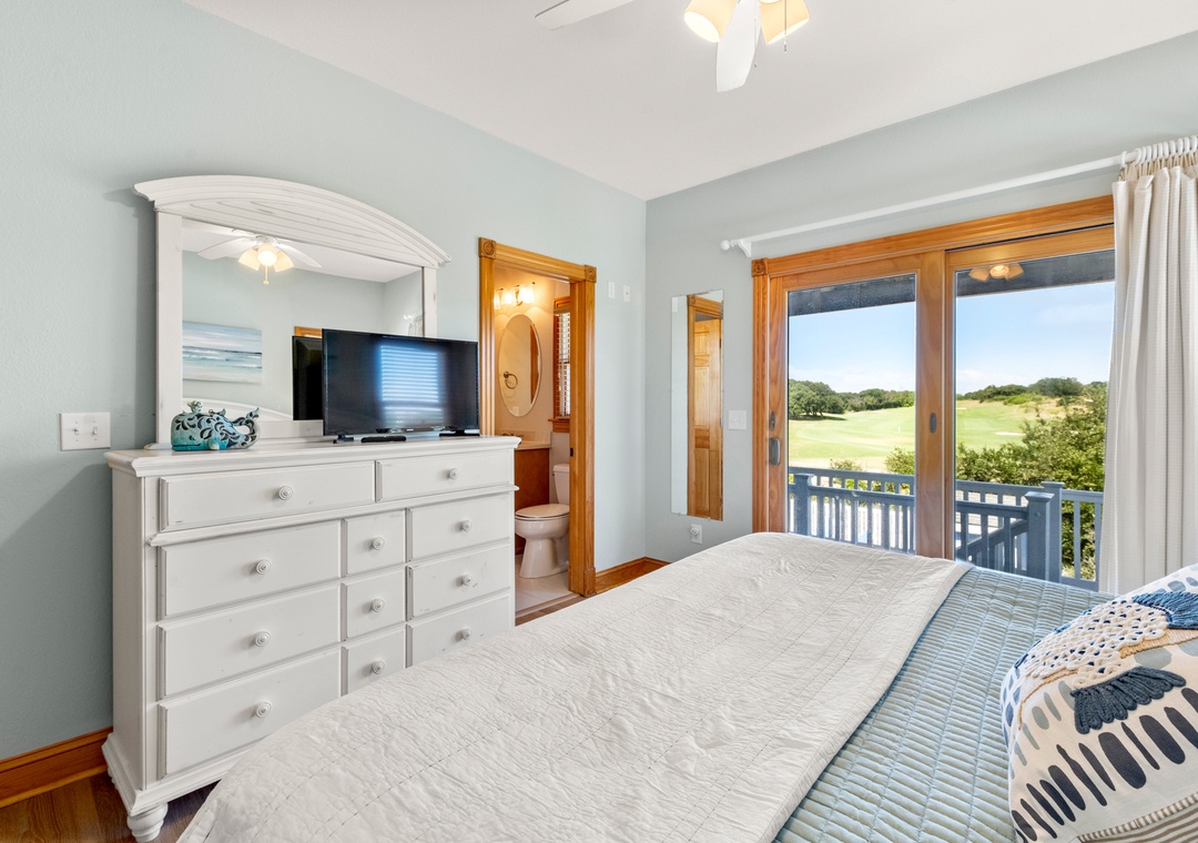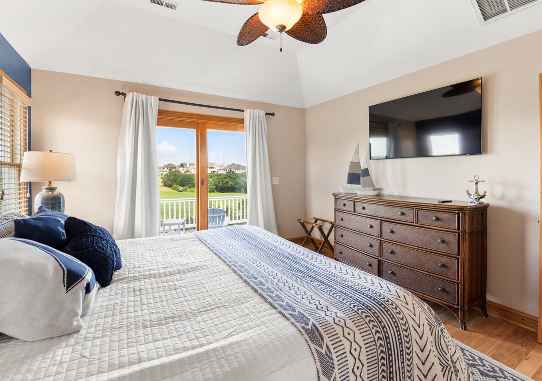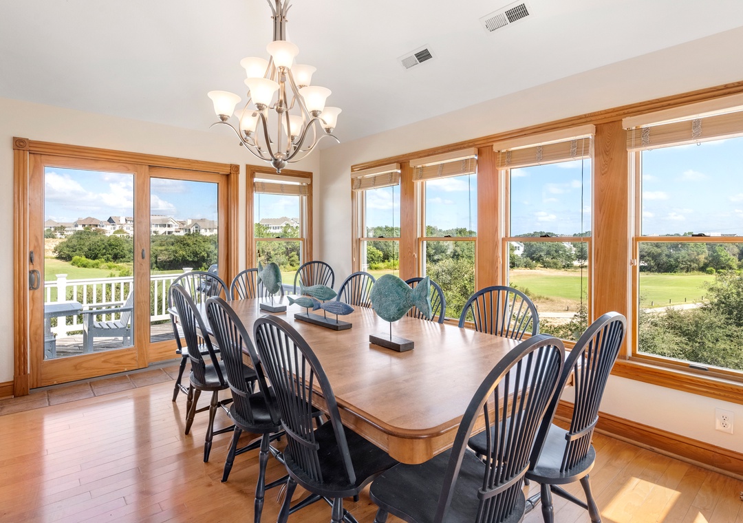 With a change in latitude comes Changes in Attitude! This newly remodeled soundside retreat in the Currituck Club is just what your family needs to reset and recharge. Changes in Attitude is situated on a quiet cul-de-sac right on the golf course with incredible views of the 12th fairway. With over 3,500 square feet of indoor living space plus 1,100 square feet of decking, this expansive home can easily accommodate multiple or extended families. Changes in Attitude is equipped with an elevator, ideal for guests with mobility issues. Skip the stairs and use it to send luggage and groceries to the upper floors. The top-level great room features vaulted ceilings, hardwood floors and an open-concept layout ideal for gathering. Floor-to-ceiling windows take full advantage of the magnificent view and bring in an abundance of natural light. Two sets of sliding doors open up onto the expansive sun deck overlooking the pool below. When you're not dining out, prepare meals in the well-equipped kitchen with double wall oven and center island with bar seating. The primary bedroom is conveniently located on the top level and also provides golf course views and deck access. A spacious ensuite bath includes dual vanities, a large walk-in shower and a separate jetted tub.