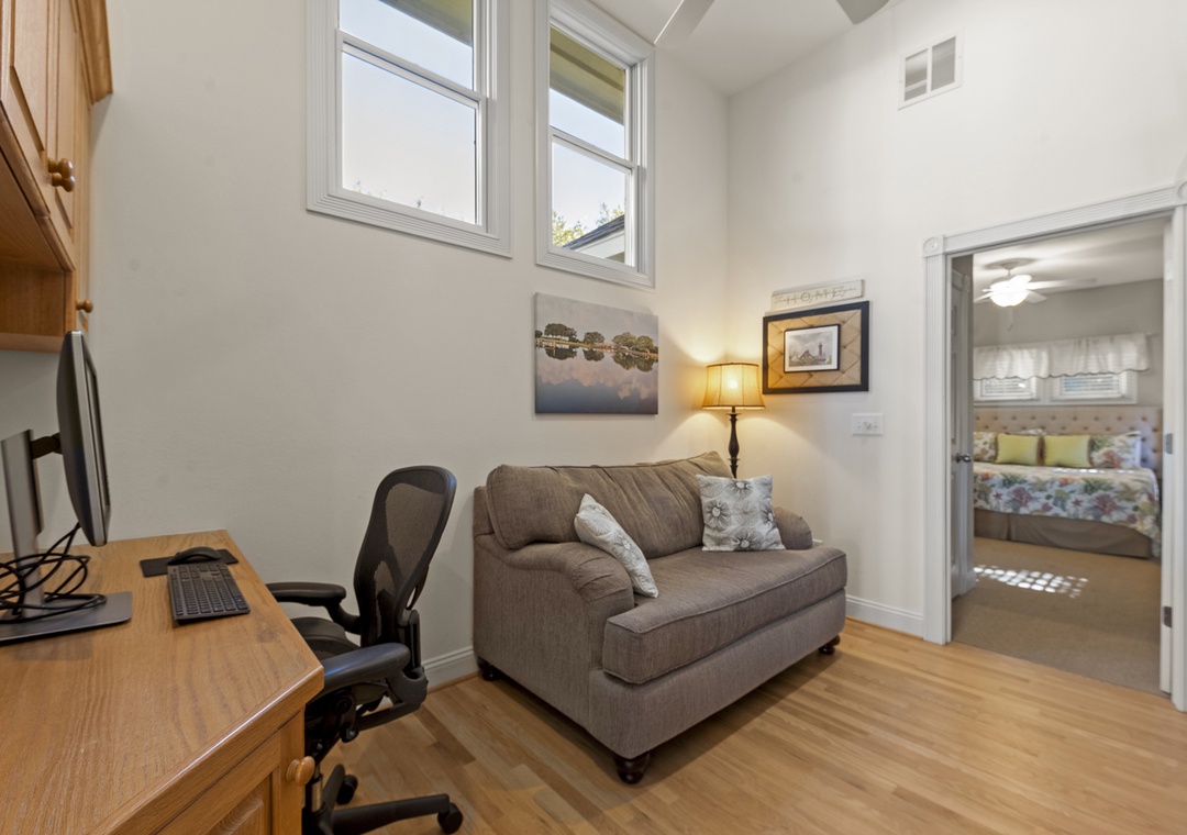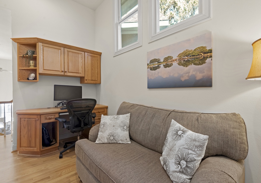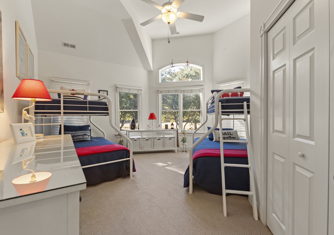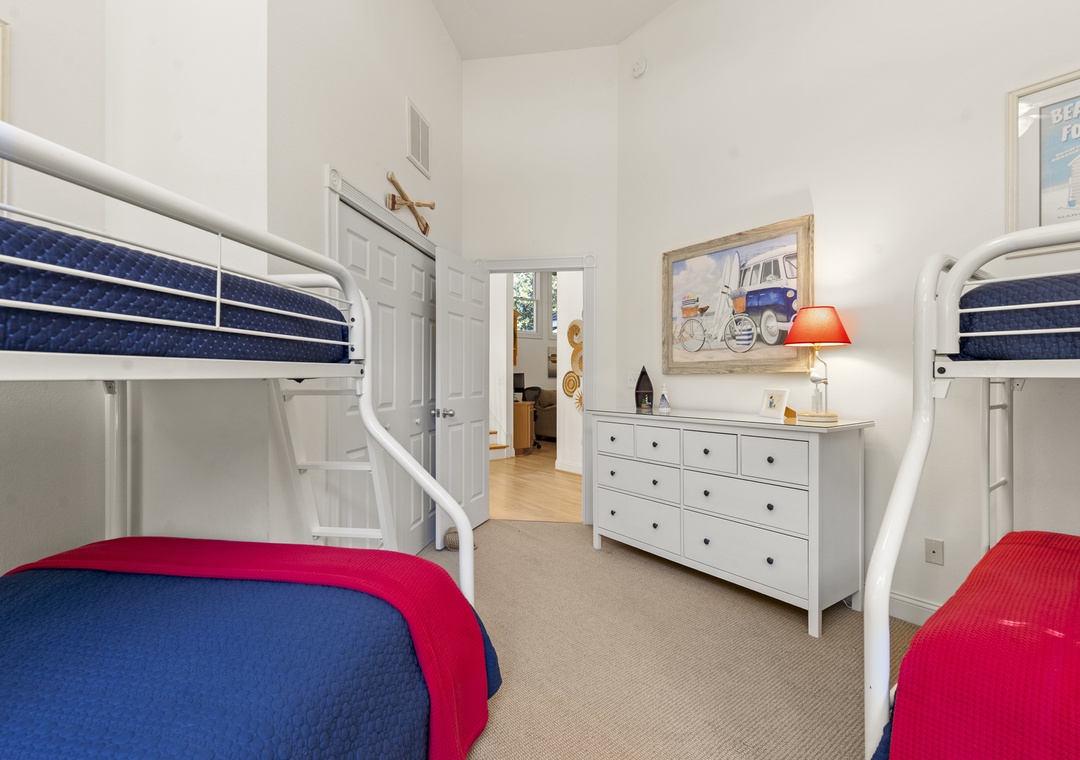 Ascend to the second level, where two luxurious ensuite bedrooms await, each with its own private bathroom for ultimate comfort and privacy. This floor also includes another bedroom with two charming pyramid bunk beds, making it a great spot for all the kids or extra guests. A quiet home office is tucked away here as well, offering a peaceful space for work or study.