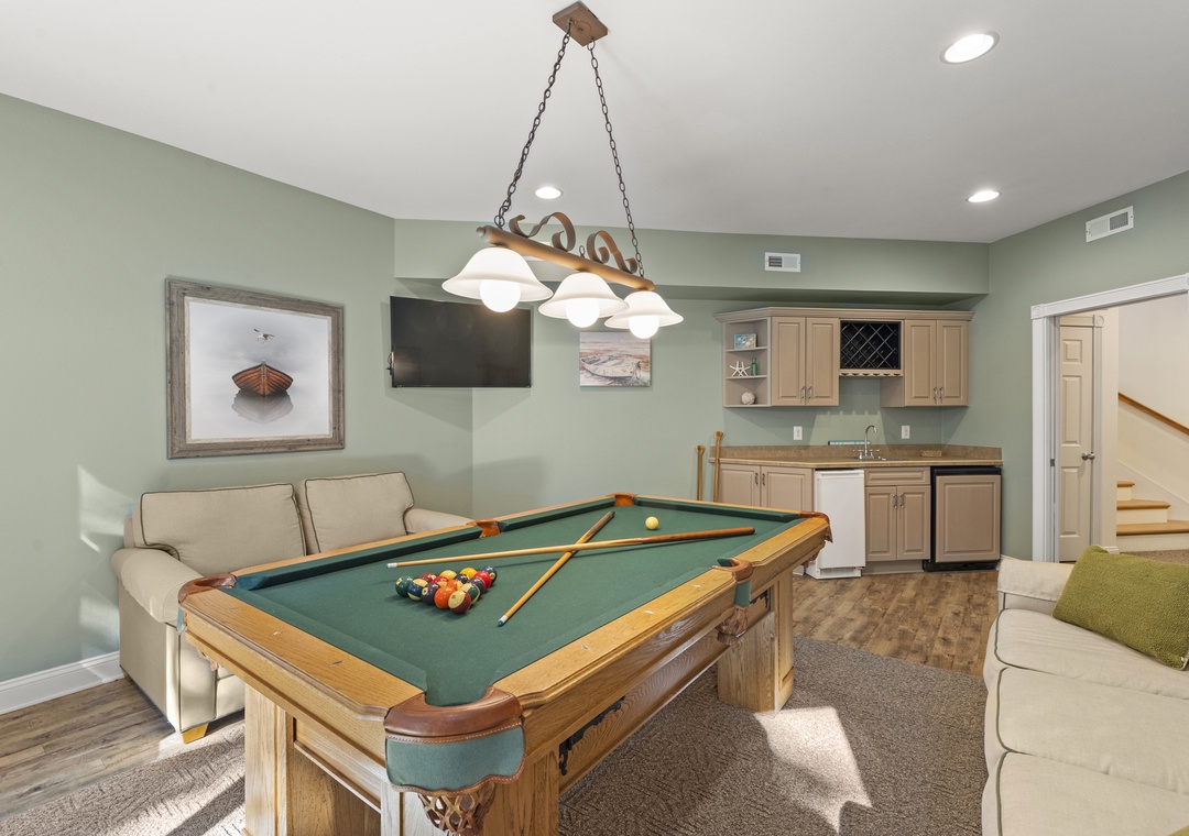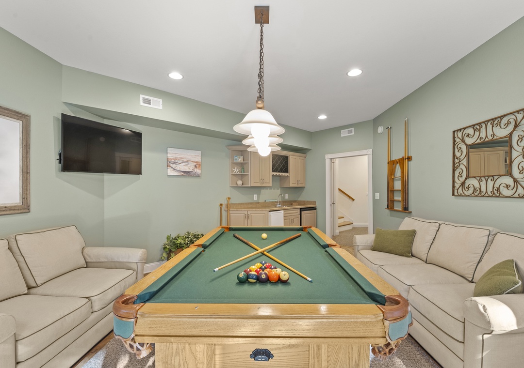 Step inside to the main level, where an expansive open concept living area greets you with a cozy stone fireplace and flows seamlessly into the dining area and gourmet kitchen, creating the ideal space for gathering and entertaining. On this level includes a ½ bath. On the lower level, you’ll find a queen bedroom with a shared bath, a convenient laundry room, and a fun-filled rec room complete with a pool table, large tv and bar area, perfect for evenings of laughter and games.