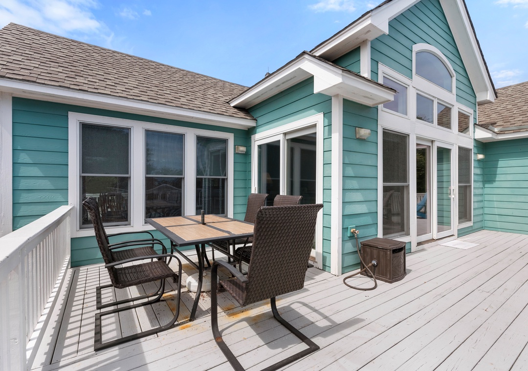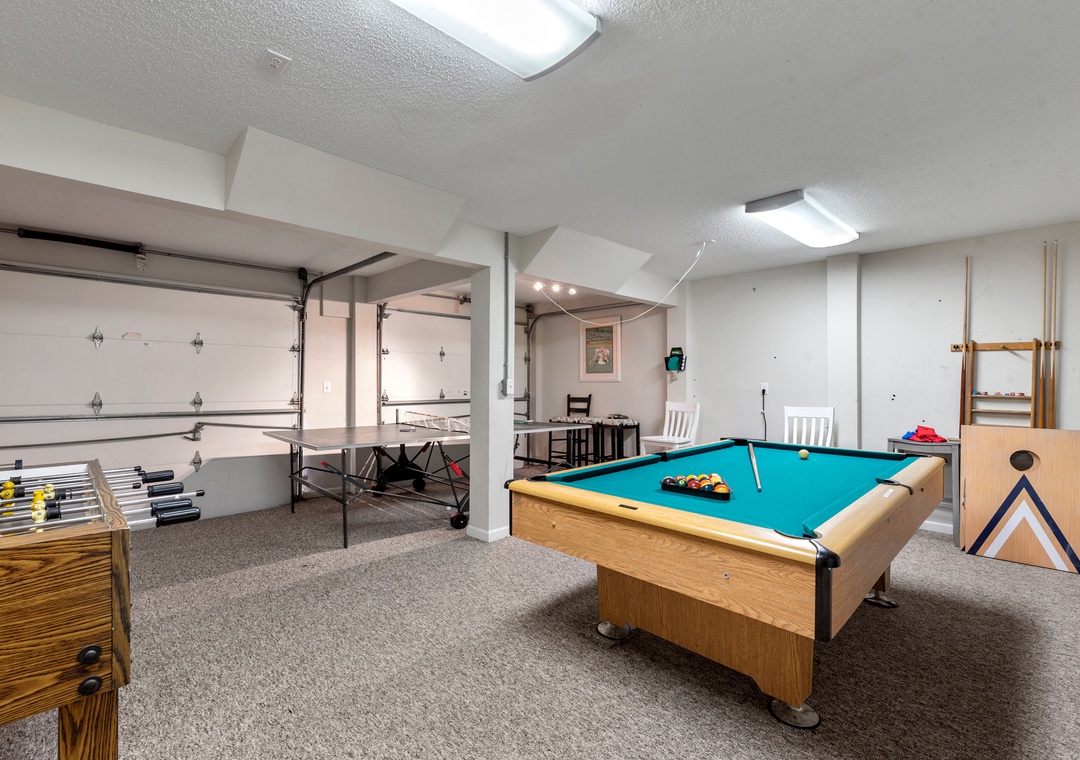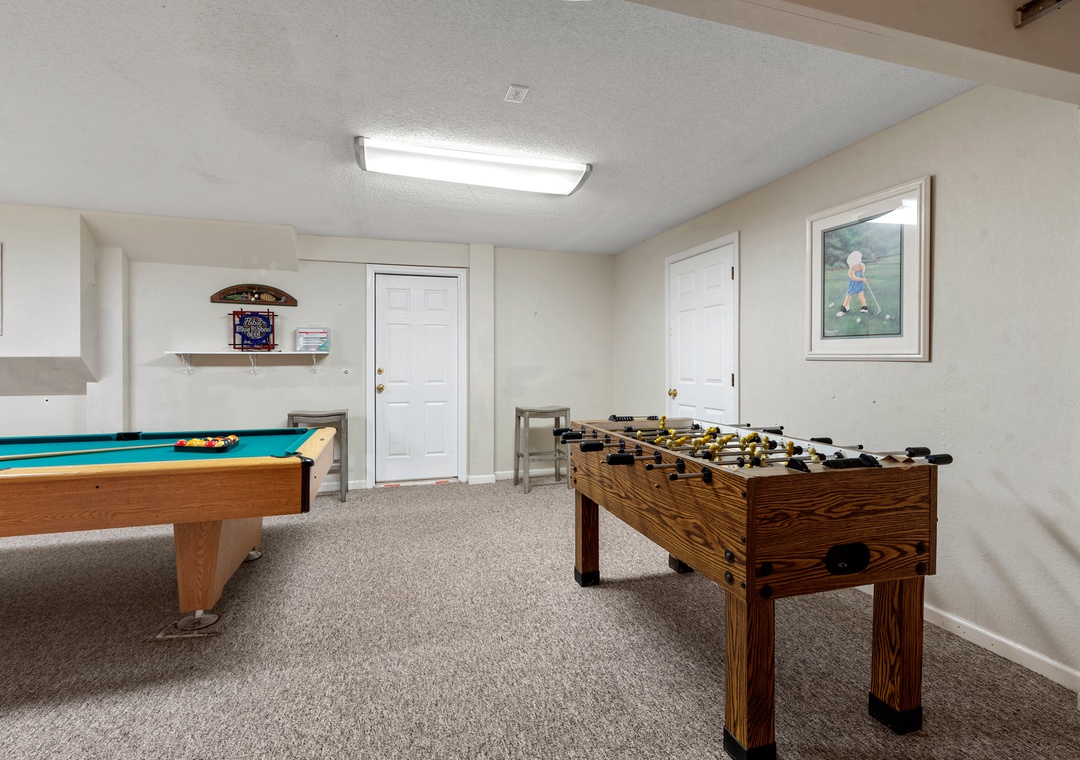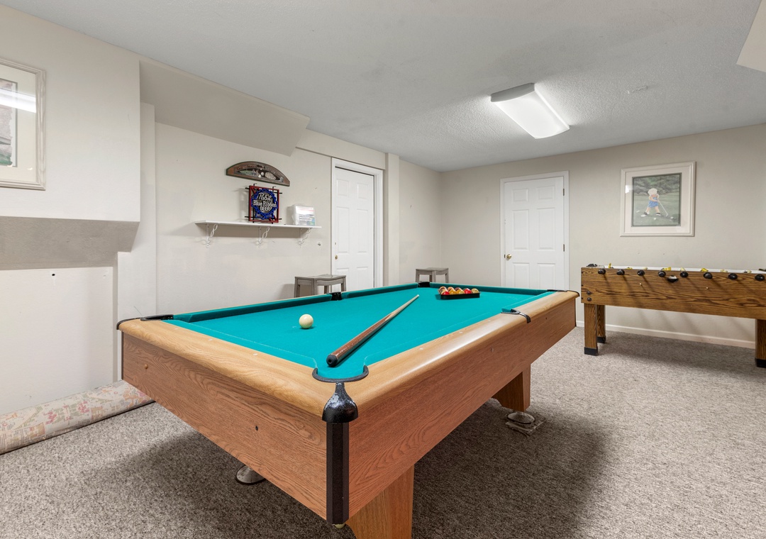 At the end of the night, retreat to the primary suite on the main level, which includes a private bath with dual vanities, jetted tub and large walk-in shower. Four additional bedrooms are located downstairs, two of which include ensuite baths. The mid-level den can serve as an additional living space, with a comfortable sleeper sofa and TV. The ground level is dedicated to fun and relaxation. Between the billiard table, foosball and ping-pong, Heron Haven's game room offers a variety of indoor recreation options. Outside, splash in the private pool or soak in the hot tub. There's also a grill and outdoor dining set for poolside cookouts.
