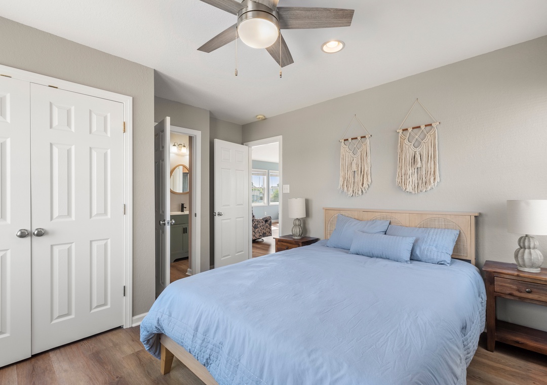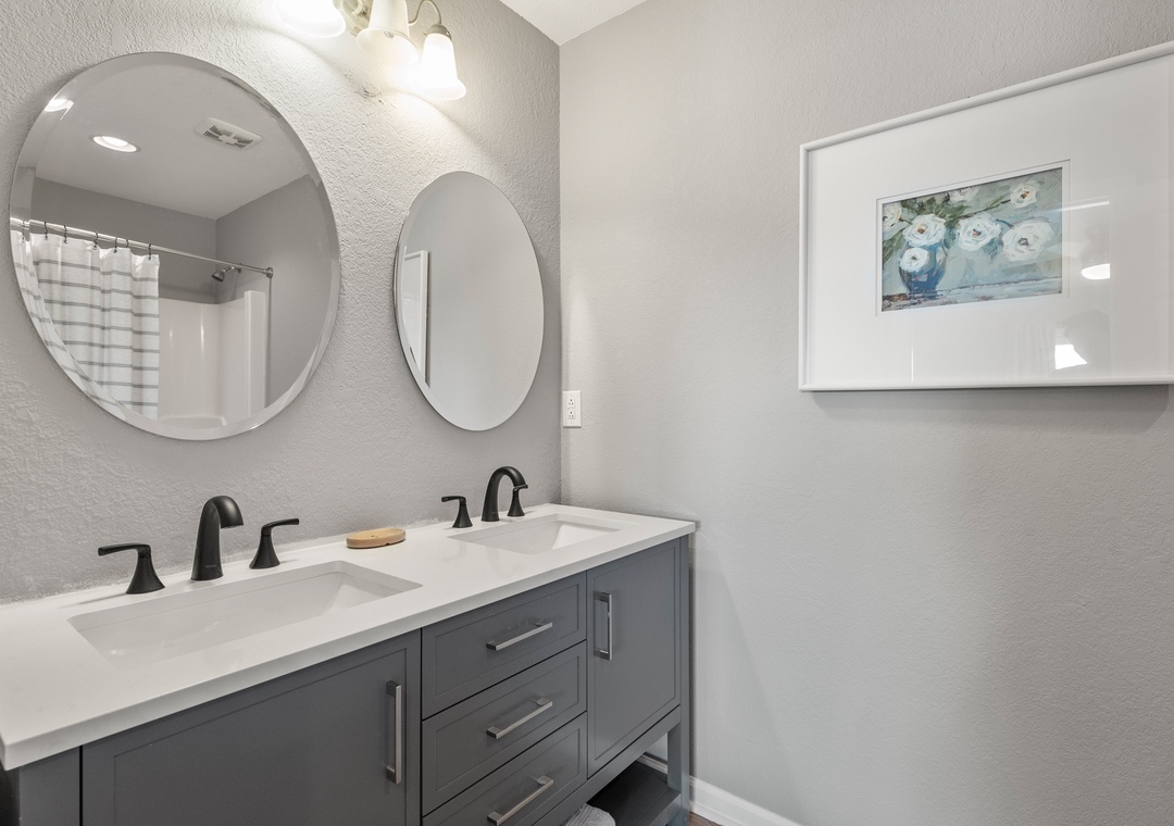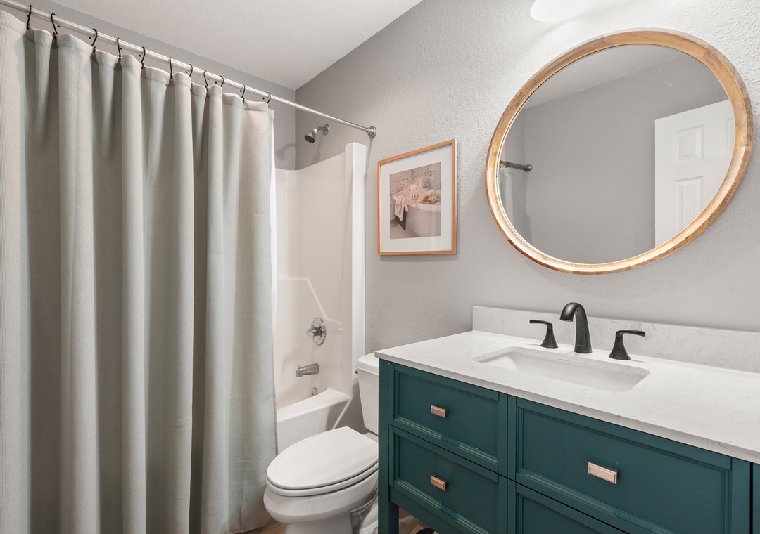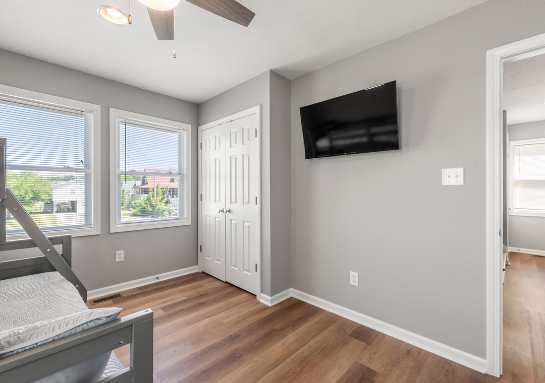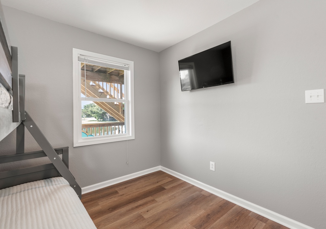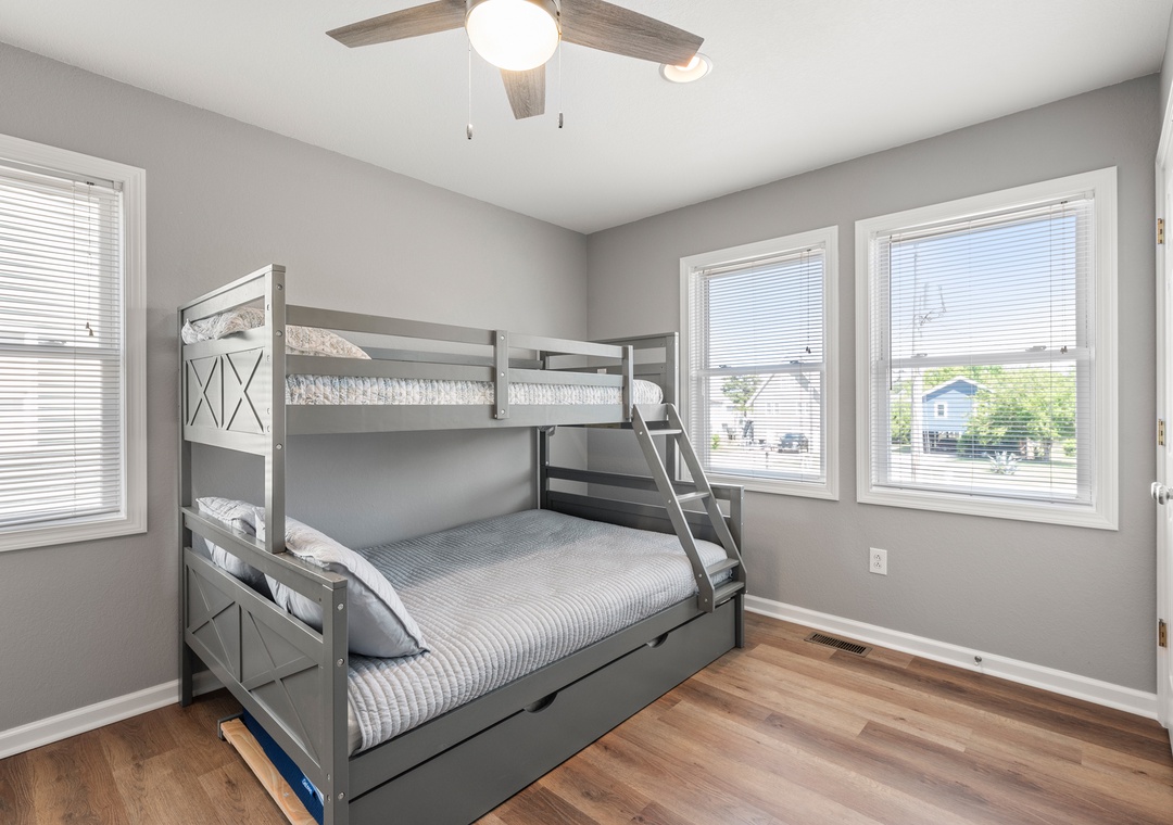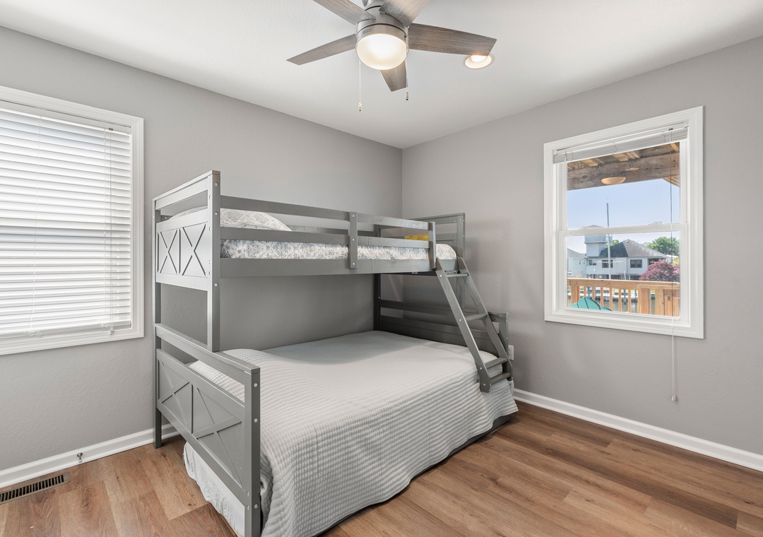 Down into the middle level you will find 3 bedrooms, two of which have a pyramid bunk bed and trundles for all ages! Nestle into the queen bedroom with an ensuite bathroom (two sinks) and deck access.