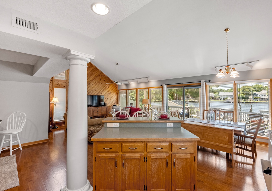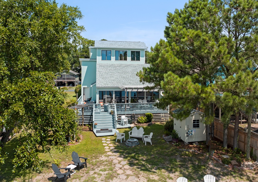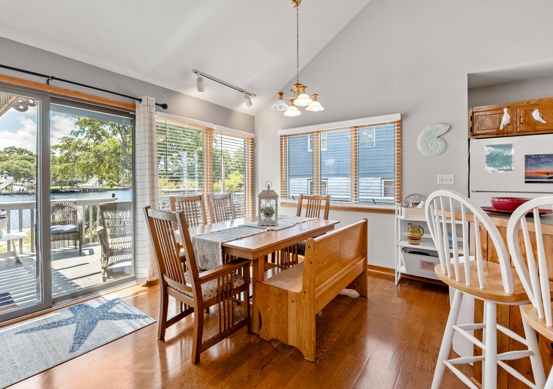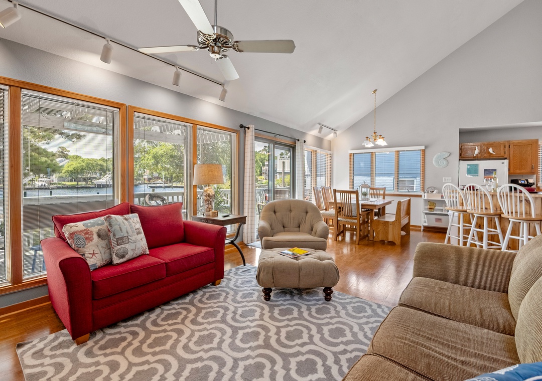 In addition to the private boat dock, the waterfront backyard oasis at Come Sail Away includes a fire pit and plenty of Adirondack seating for spending the evenings with loved ones and admiring the gorgeous sunsets. A spacious deck spans the entire width of the house, creating an expansive outdoor living and dining area that leads directly to the backyard and dock. Inside, the open-concept great room boasts soaring ceilings and a wall of oversized windows and doors for a fabulous canal view and effortless indoor/outdoor flow. Original pine paneling in the living area adds to the coastal appeal, and well-maintained hardwood floors flow throughout the common areas. Get dinner started in the fully stocked kitchen with double wall oven and bar seating for three. Two bedrooms and a full bath are also located on the main level. Upstairs, you'll find two more bedrooms that share a beautifully remodeled full bath. A loft space on the third floor is furnished with a king bed and private half bath.