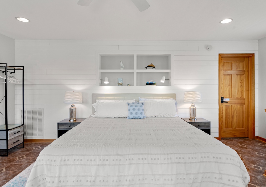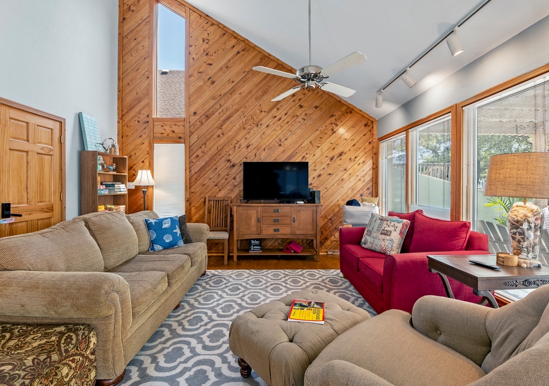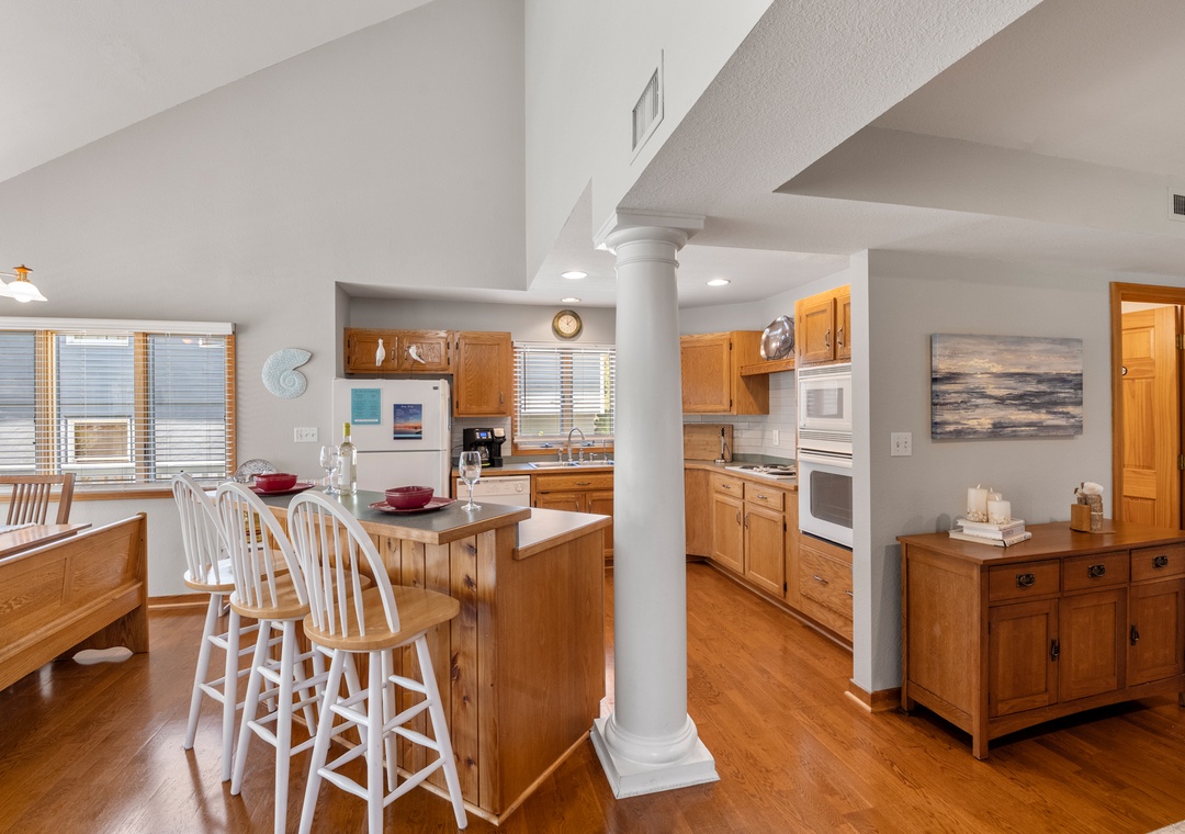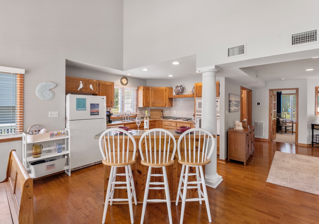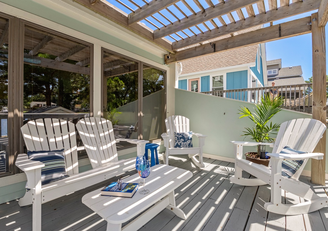 In addition to the private boat dock, the waterfront backyard oasis at Come Sail Away includes a fire pit and plenty of Adirondack seating for spending the evenings with loved ones and admiring the gorgeous sunsets. A spacious deck spans the entire width of the house, creating an expansive outdoor living and dining area that leads directly to the backyard and dock. Inside, the open-concept great room boasts soaring ceilings and a wall of oversized windows and doors for a fabulous canal view and effortless indoor/outdoor flow. Original pine paneling in the living area adds to the coastal appeal, and well-maintained hardwood floors flow throughout the common areas. Get dinner started in the fully stocked kitchen with double wall oven and bar seating for three. Two bedrooms and a full bath are also located on the main level. Upstairs, you'll find two more bedrooms that share a beautifully remodeled full bath. A loft space on the third floor is furnished with a king bed and private half bath.