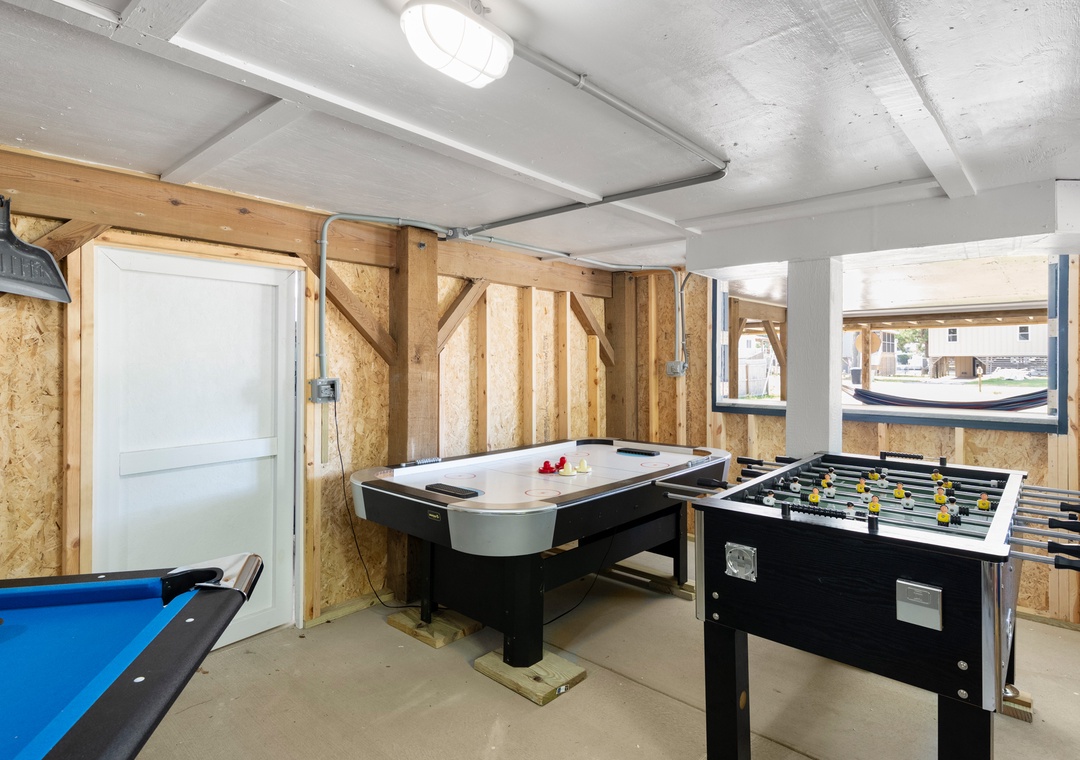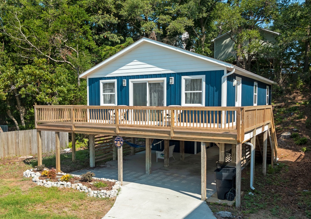 Escape to the island life at Blue Harbour Haven, a recently updated beach cottage in Kill Devil Hills with family-friendly community amenities. Both the interior and the exterior have been completely renovated, making Blue Harbour Haven look and feel like new construction. Outdoor living will be a delight with a main level sun deck and a covered ground level complete with tiki bar and rec room. This fabulous entertainment space includes a pool table, air hockey table and foosball table for friendly competition with loved ones. Upstairs, upgrades include a brand new kitchen with granite countertops, stainless steel appliances, and a gorgeous ocean-inspired glass backsplash. You'll also find renovated bathrooms with custom ceramic tile work, including an ensuite bath with luxurious walk-in shower. Luxury Vinyl Plank flooring runs throughout the entirety of this pet-friendly home - ideal for sandy feet and paws returning from the beach. The open-concept layout in the great room allows for socializing and quality time spent together, even while preparing meals in the kitchen. This comfortably furnished gathering space boasts vaulted ceilings and custom wainscoting for an elevated aesthetic and traditional coastal charm.