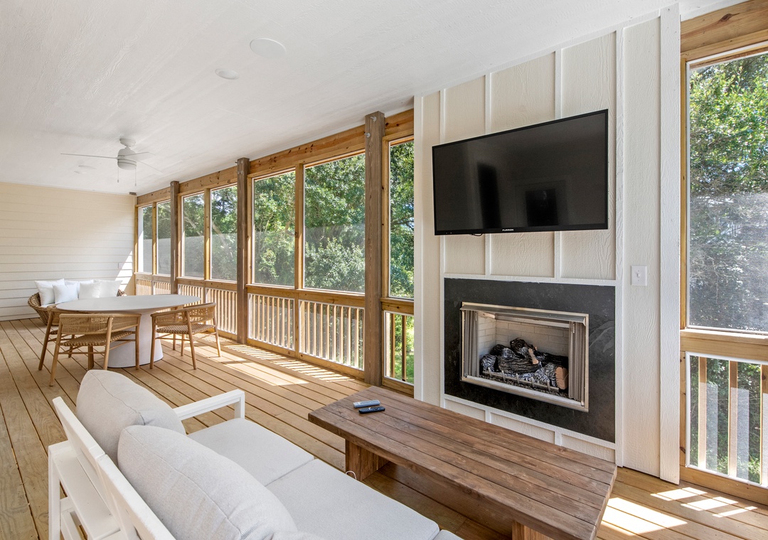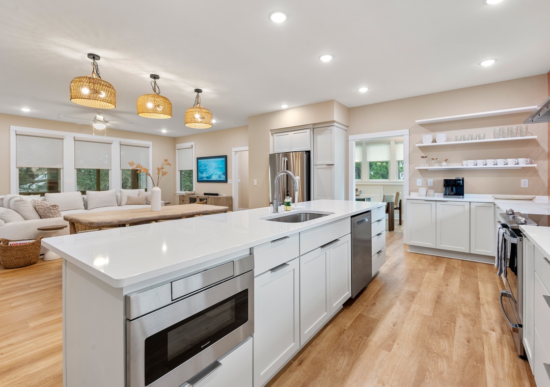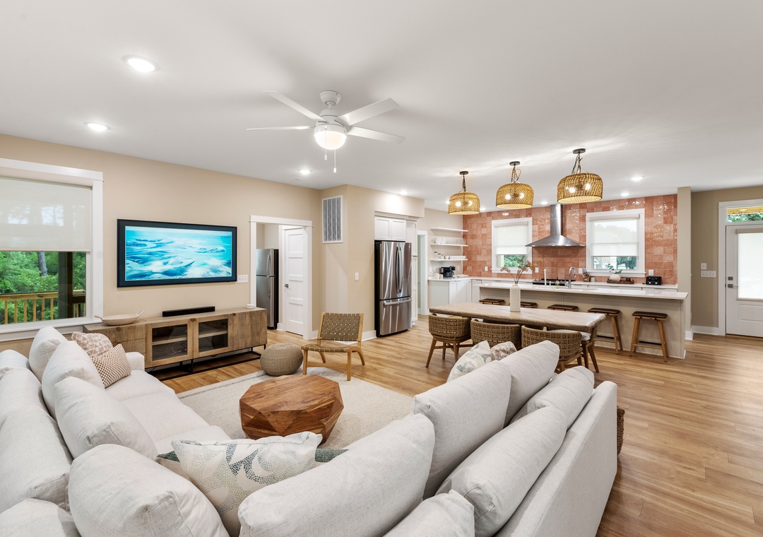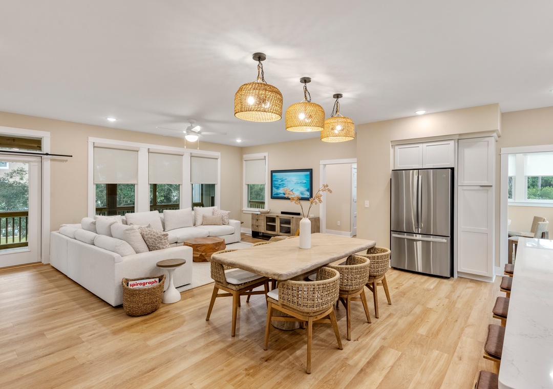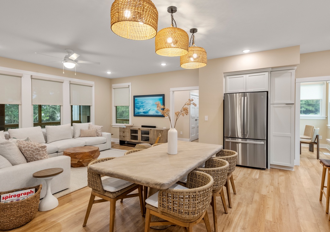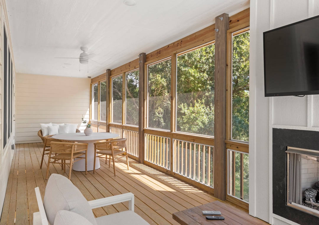 When it's time to relax and spend quality time together, gather the family in the beautifully furnished open-concept great room. The chef in your group will be delighted with the spacious kitchen that boasts top-of-the-line stainless steel appliances and an expansive island with bar seating. Sit down and enjoy meals together at the stunning dining table that's truly a work of art, or in the cozy breakfast nook with banquette seating. You can even dine al fresco on the screened porch, a fabulous outdoor space that also includes lounge furniture, a fireplace and even a TV. Back inside, the laundry room provides a second full-size fridge for storing extra groceries or the catch of the day.