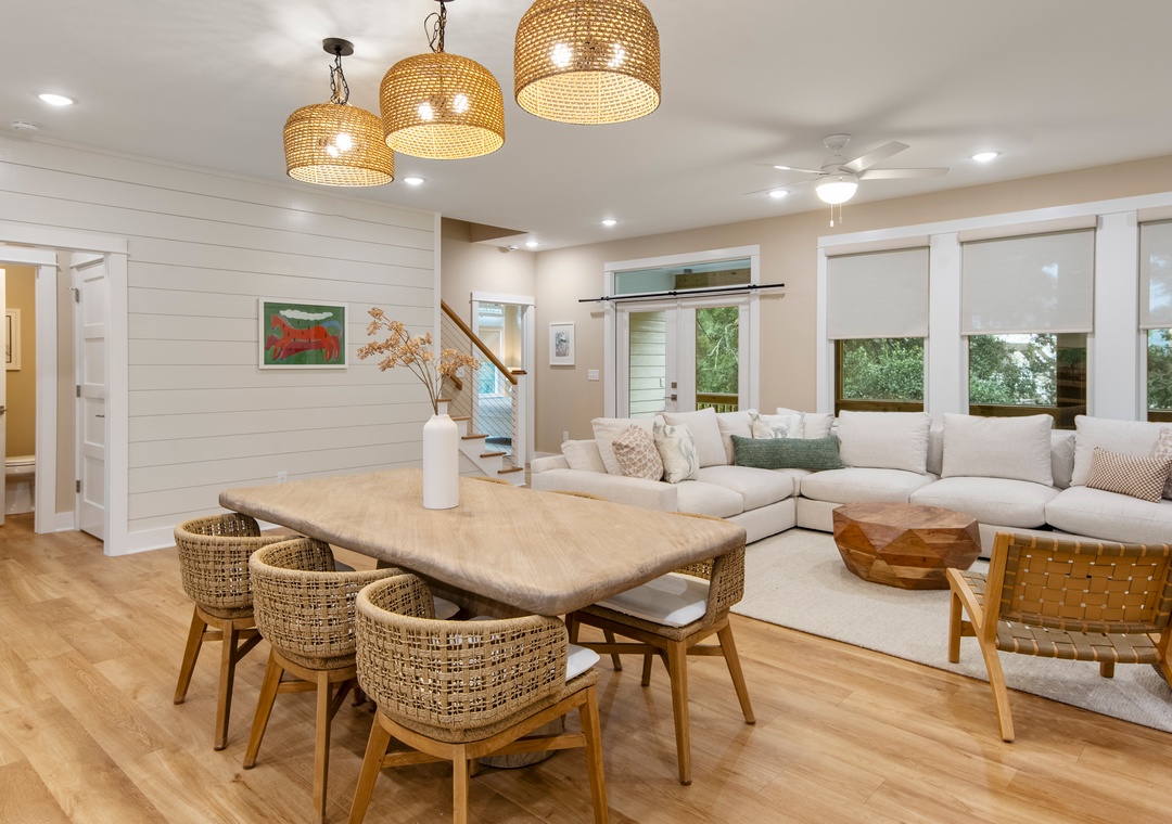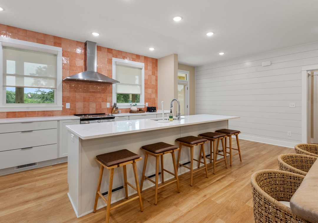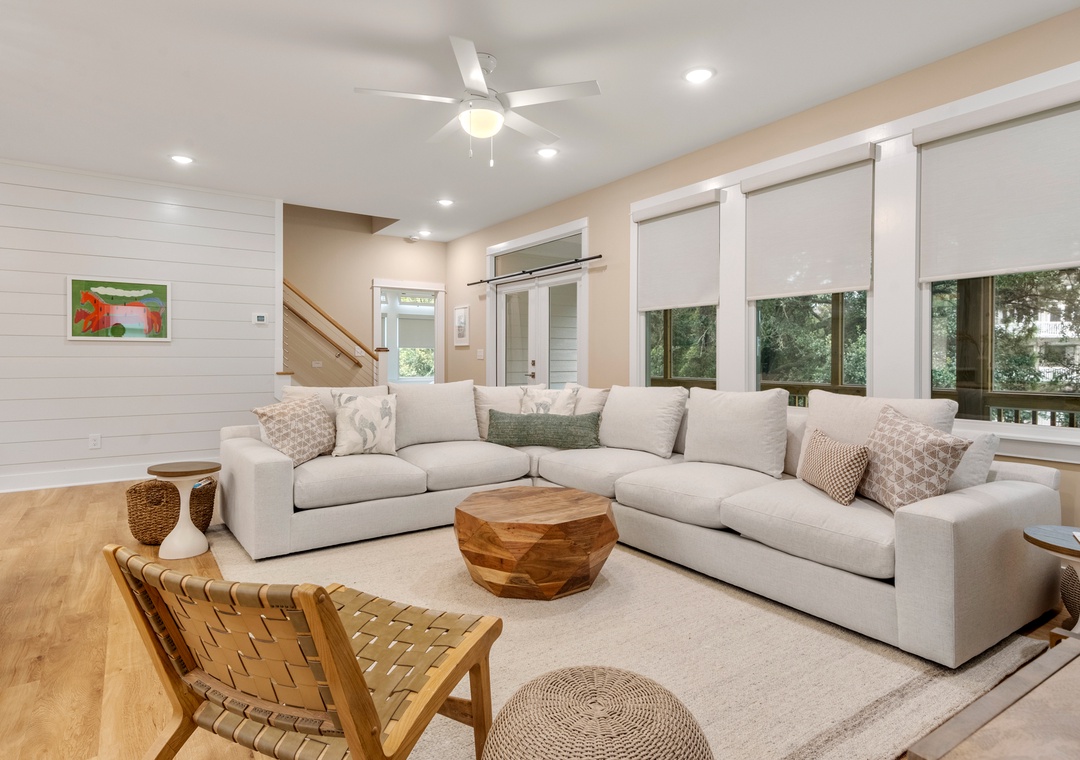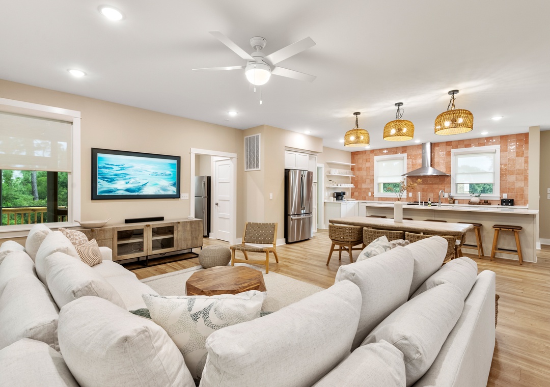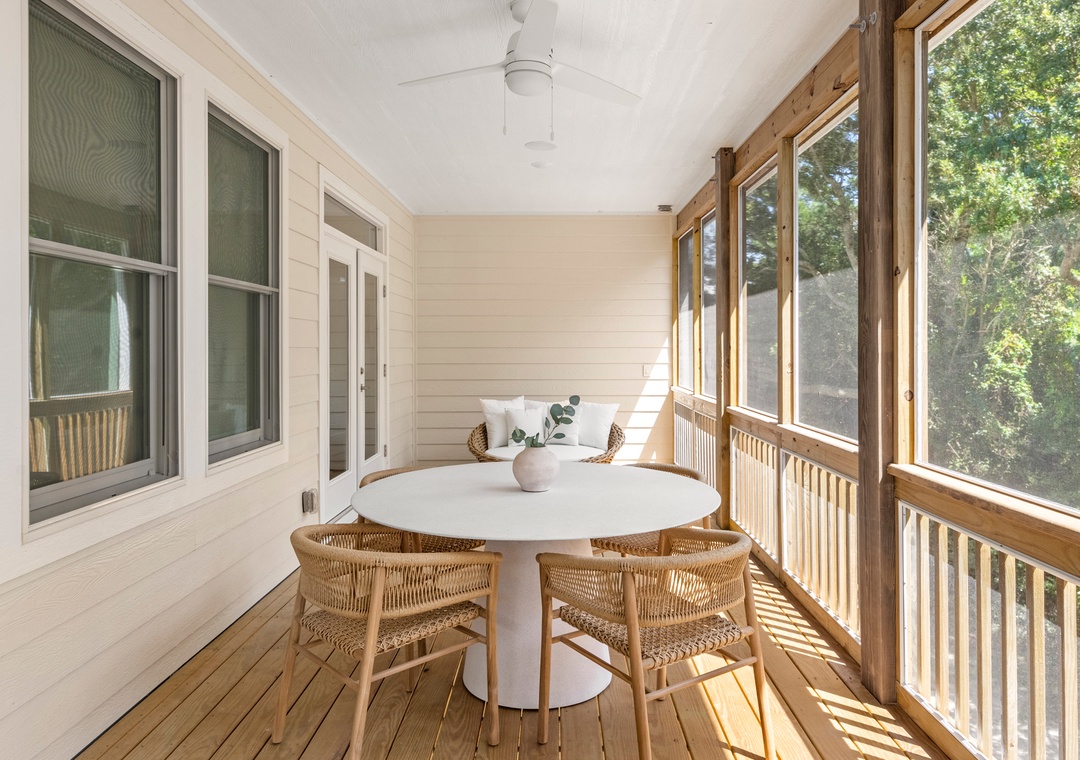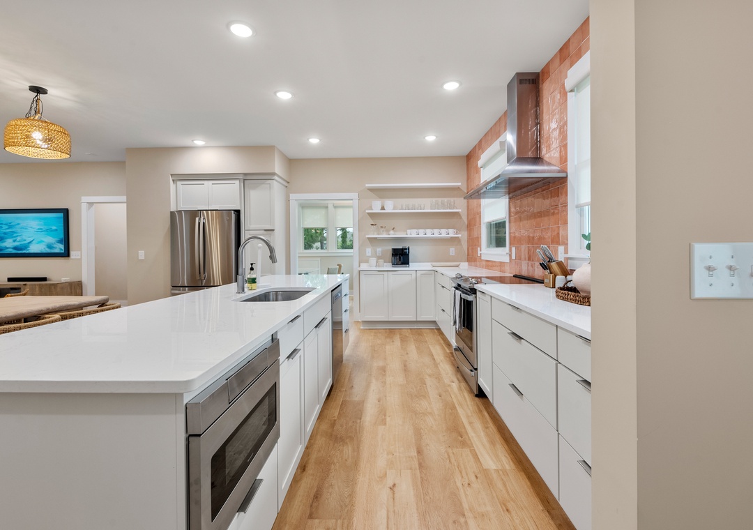 When it's time to relax and spend quality time together, gather the family in the beautifully furnished open-concept great room. The chef in your group will be delighted with the spacious kitchen that boasts top-of-the-line stainless steel appliances and an expansive island with bar seating. Sit down and enjoy meals together at the stunning dining table that's truly a work of art, or in the cozy breakfast nook with banquette seating. You can even dine al fresco on the screened porch, a fabulous outdoor space that also includes lounge furniture, a fireplace and even a TV. Back inside, the laundry room provides a second full-size fridge for storing extra groceries or the catch of the day.