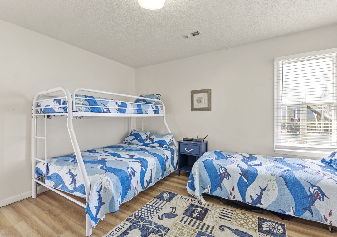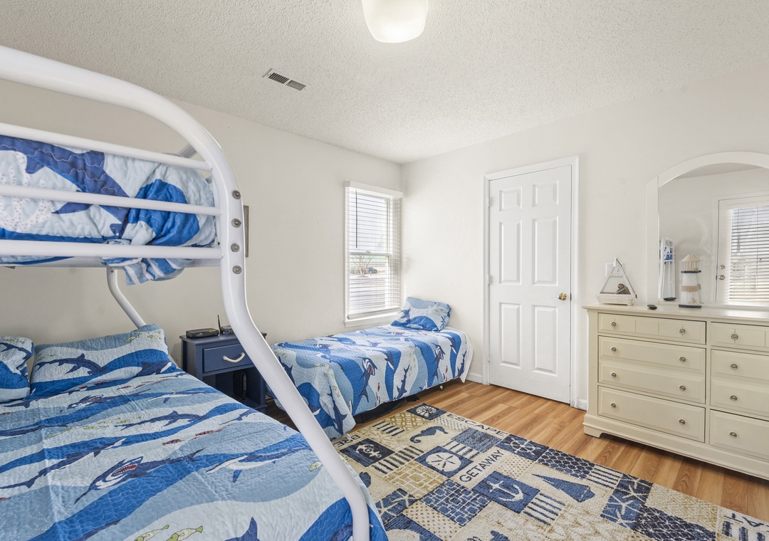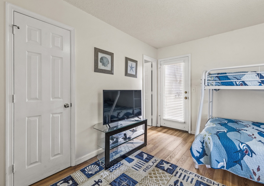 On the ground level, you’ll find a cozy ensuite bedroom with a pyramid bunkbed and bathroom, plus convenient laundry facilities. Step outside to the back patio with a picnic table and charcoal grill, perfect for evening cookouts under the stars.