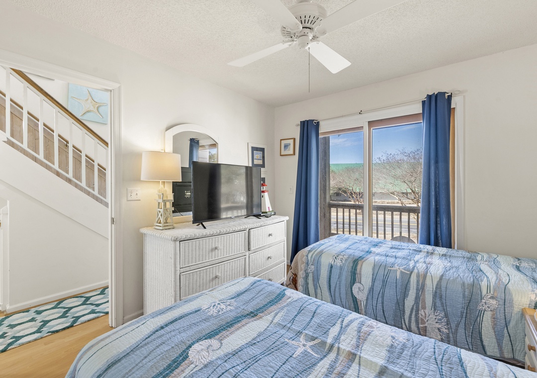 Back inside, going upstairs the middle level boasts a luxurious ensuite bedroom with a king bed and bathroom with a hot tub and shower, and deck access for serene mornings. A second bedroom ensuite with twin beds and a full bath ensures everyone has their own space.