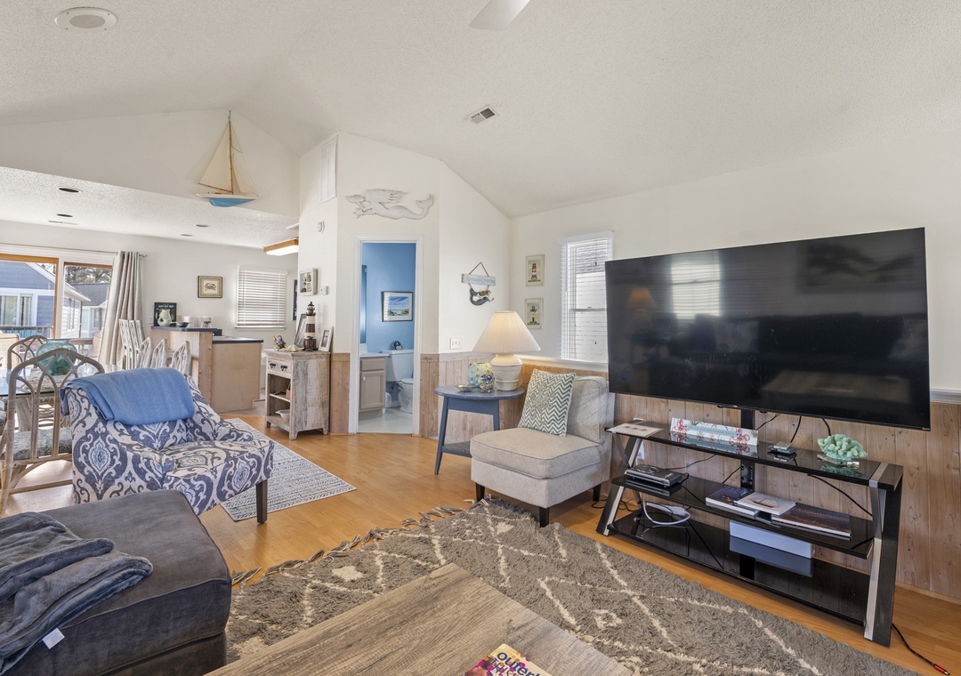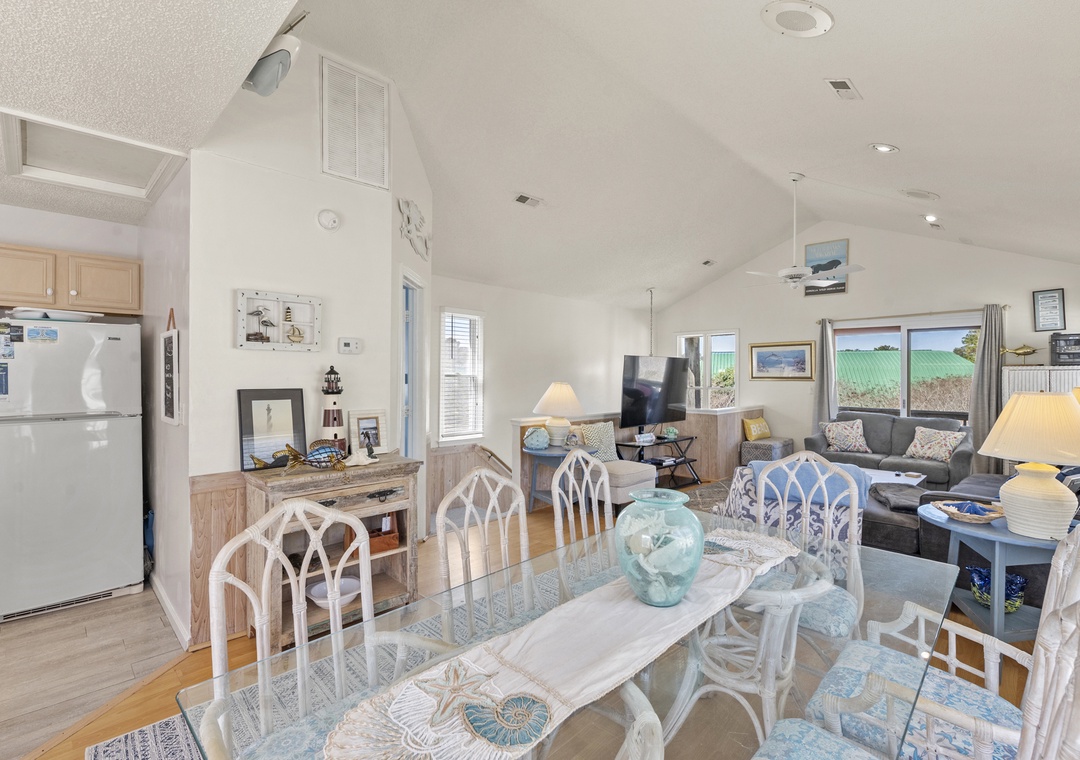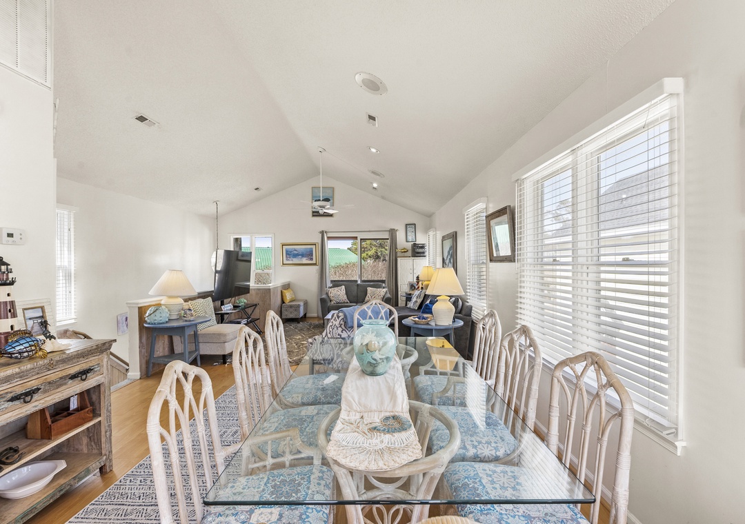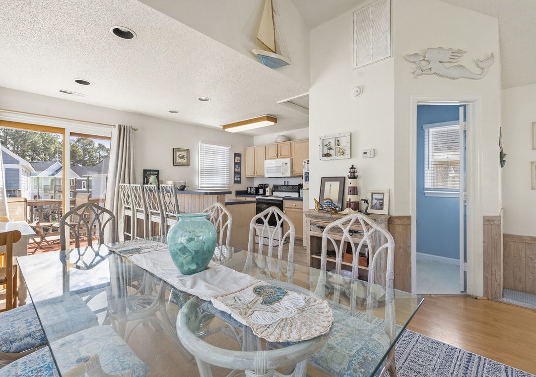 Stepping upstairs into an open-concept on the top level featuring a spacious living room, a fully equipped kitchen with a breakfast bar, and a dining table for eight, ideal for gathering with family and friends. Enjoy the fresh ocean breeze from the front covered deck or unwind on the back deck after a day of adventure.