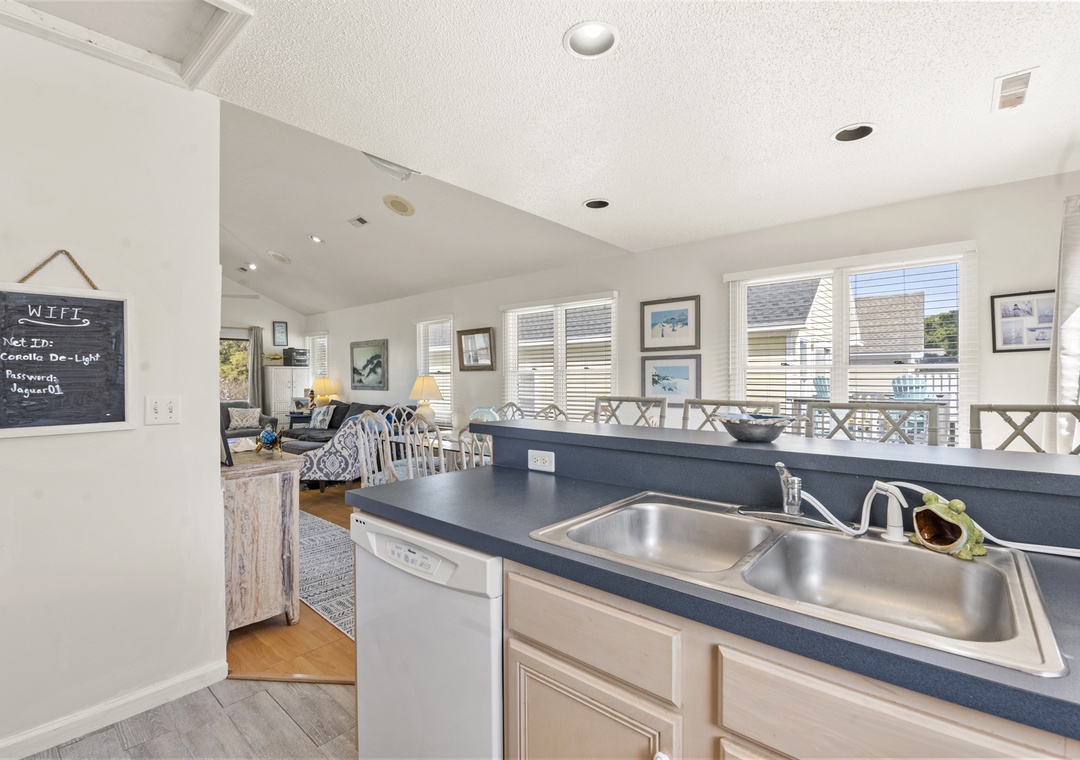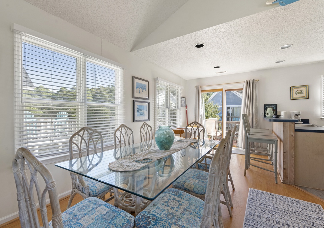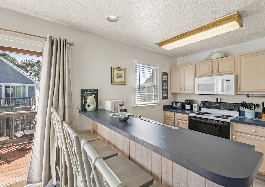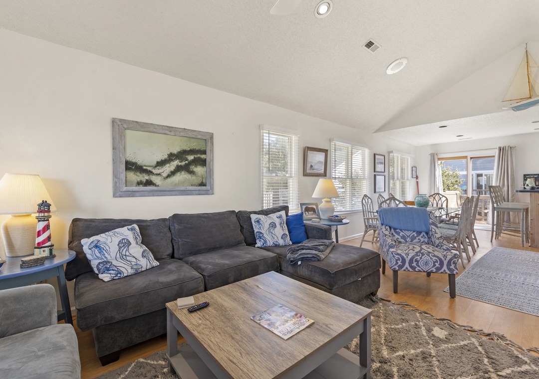Stepping upstairs into an open-concept on the top level featuring a spacious living room, a fully equipped kitchen with a breakfast bar, and a dining table for eight, ideal for gathering with family and friends. Enjoy the fresh ocean breeze from the front covered deck or unwind on the back deck after a day of adventure.