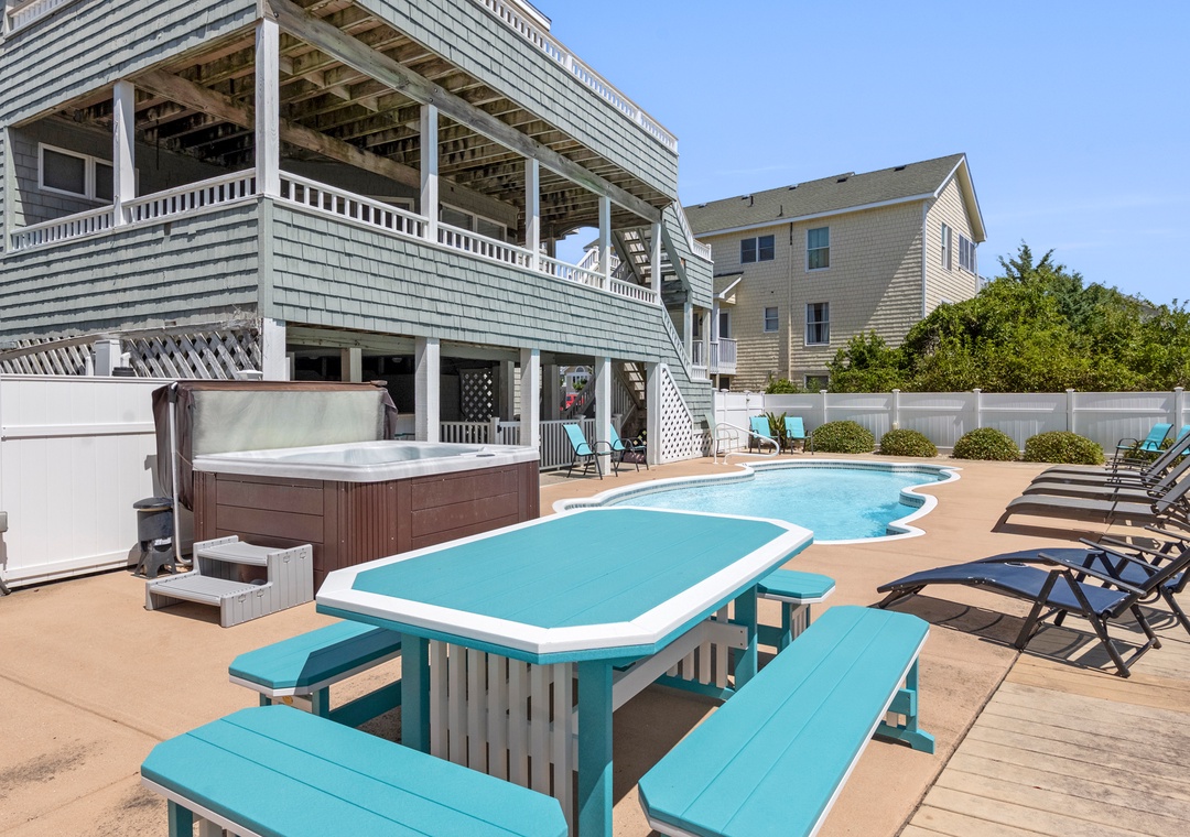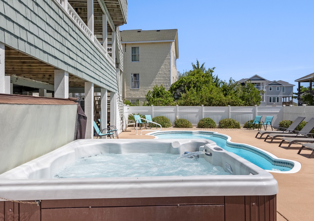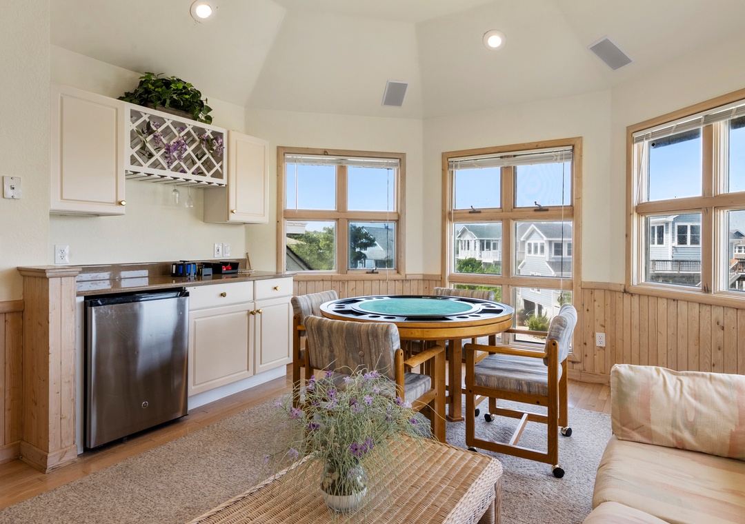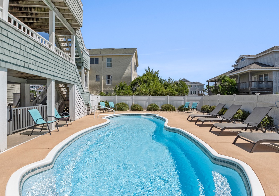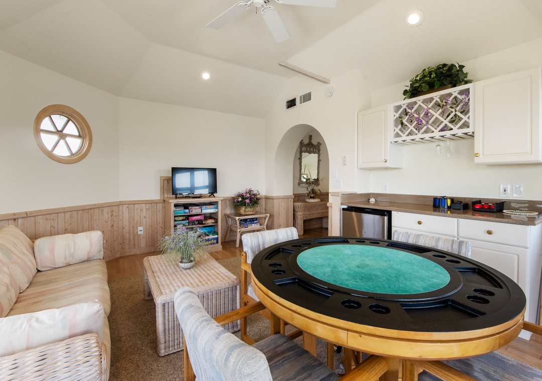 The private pool at Payson Place is 14'x32' and there is also a hot tub. The sunroom on the third floor offers a tiki bar and lighthouse views. Climb up another flight and you have a Ship's Watch with ocean views, a bumper pool table, and a wet bar with a mini-fridge.