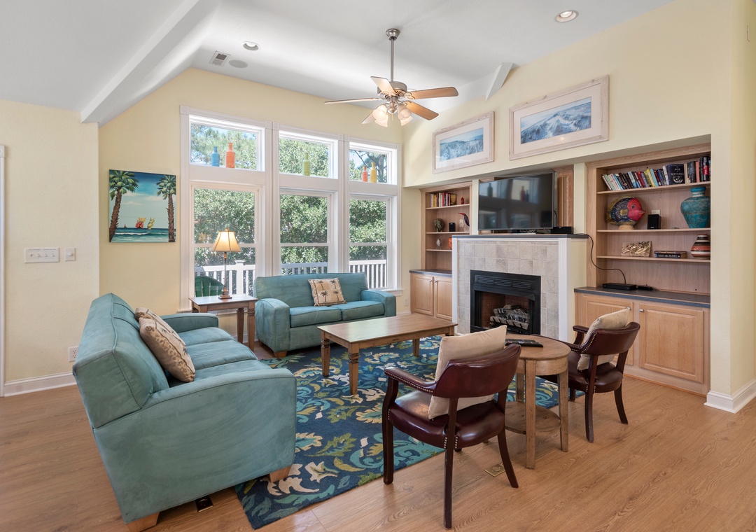 A true oasis for vacationers who are both beach lovers and watermen, Plum Paws offers a variety of amenities for endless outdoor activities and adventure. This spacious six-bedroom home is perfect for larger groups or multiple families vacationing together, featuring three master suites and two dens. An open-concept layout and vaulted ceilings in the main living area on the top level create an ideal space for entertaining and spending quality time with family and friends. A screened porch and decks on the west side of the house provide plenty of outdoor living space overlooking the private pool area.