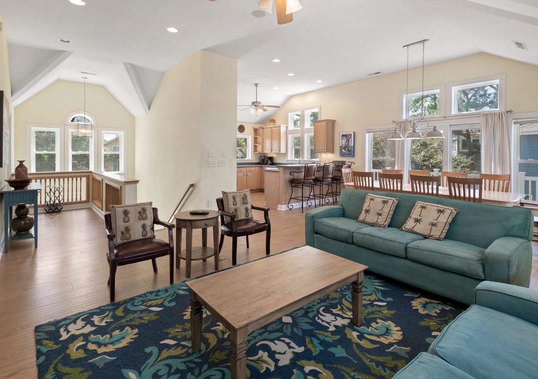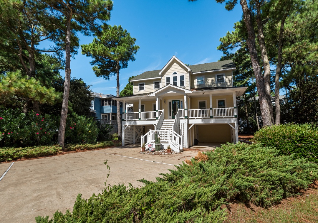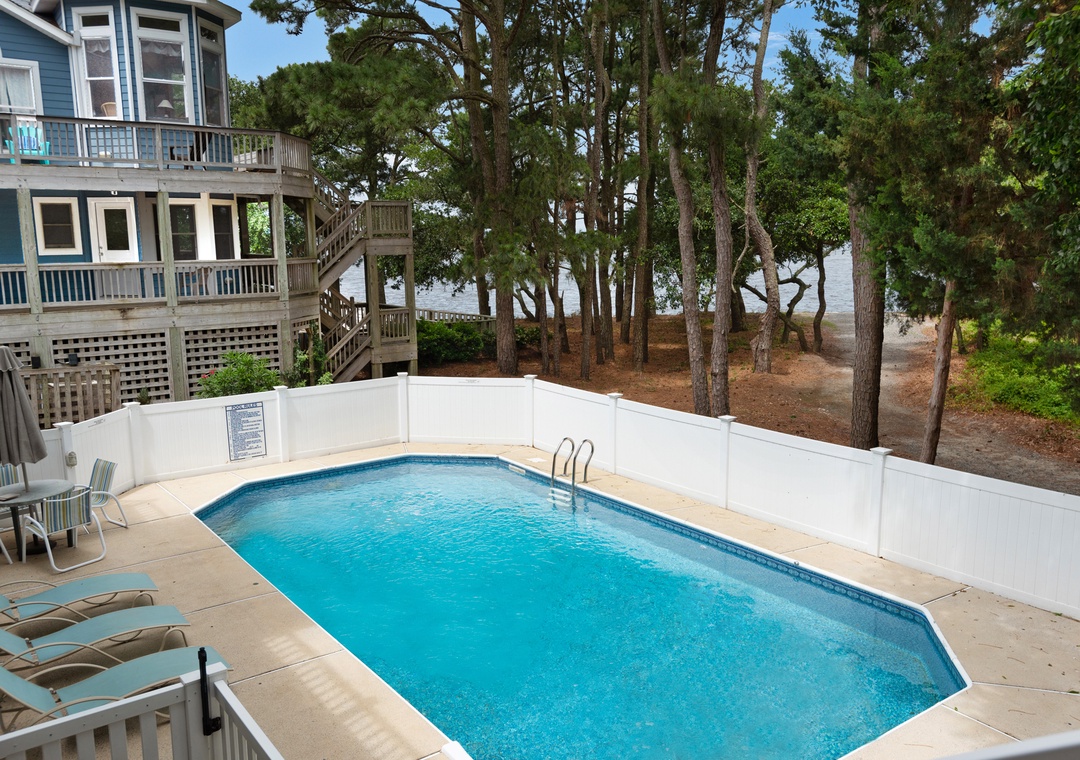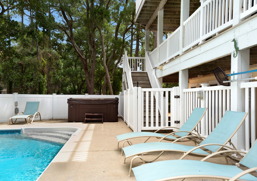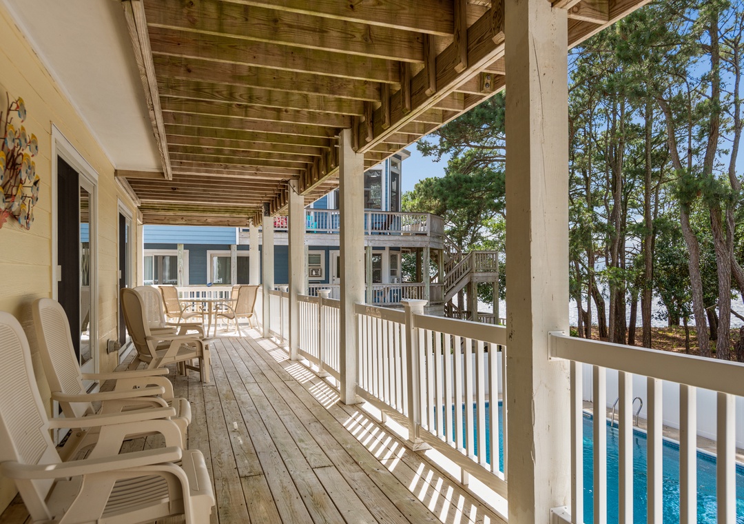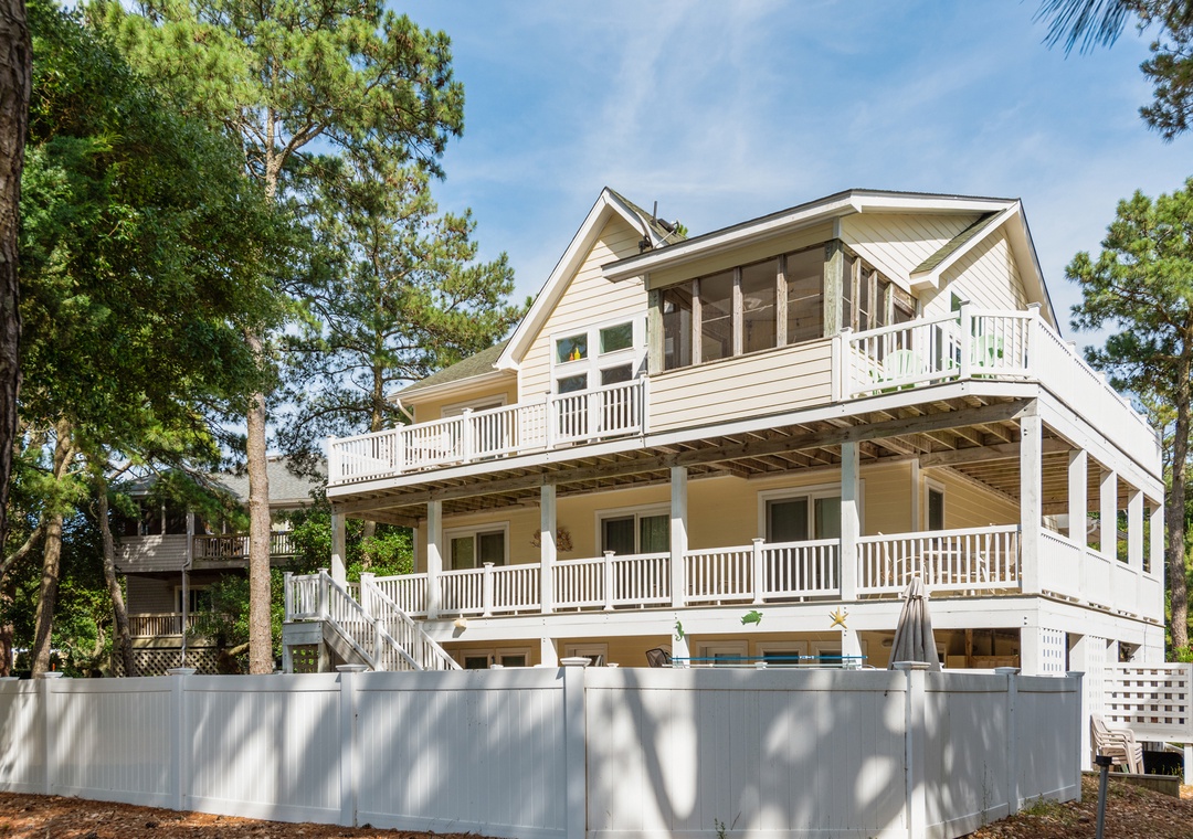 A true oasis for vacationers who are both beach lovers and watermen, Plum Paws offers a variety of amenities for endless outdoor activities and adventure. This spacious six-bedroom home is perfect for larger groups or multiple families vacationing together, featuring three master suites and two dens. An open-concept layout and vaulted ceilings in the main living area on the top level create an ideal space for entertaining and spending quality time with family and friends. A screened porch and decks on the west side of the house provide plenty of outdoor living space overlooking the private pool area.