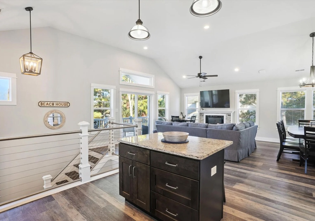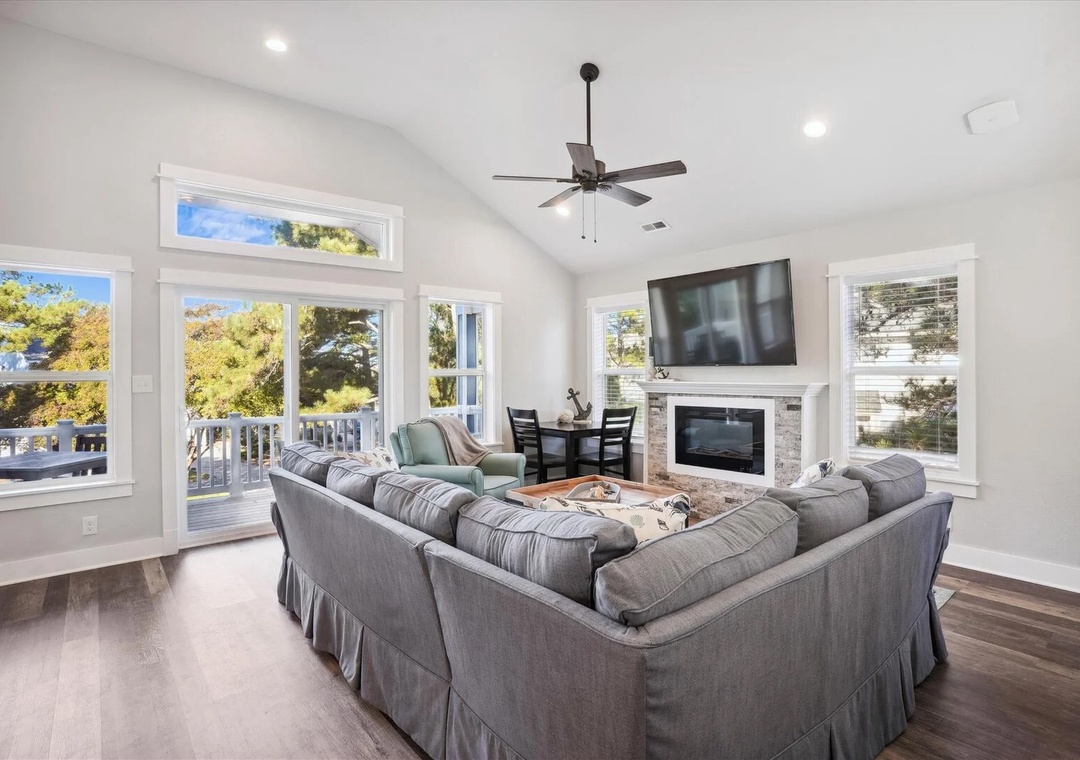 After a day at the beach or enjoying the resort, come home and unwind in the open-concept great room where you can kick back and relax in front of the electric fireplace. This comfortably furnished gathering space leads out to a west-facing deck for indoor/outdoor flow and dazzling sunset views. When you're not trying one of Corolla's fabulous restaurants, use the well-equipped kitchen to prepare meals at the house. The chef in your group will appreciate the stainless steel appliances and granite countertops. An island with bar seating provides additional seating and overlooks the living and dining areas.
