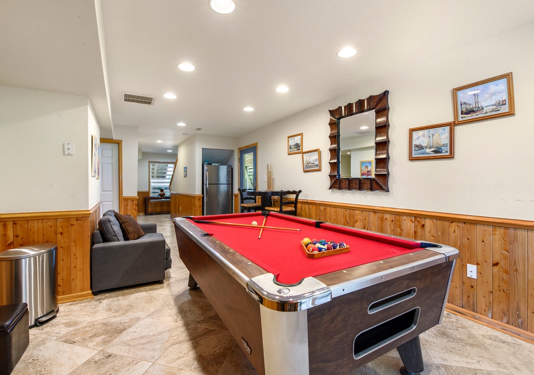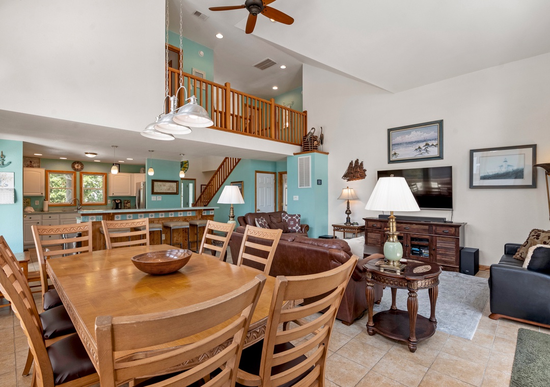 Every moment of your vacation will feel like a Sunshine Daydream when you stay at this lovely semi-soundfront home in the sought-after community of Corolla Light Resort. Designed by the architects Florez & Florez with their signature Outer Banks aesthetic, Sunshine Daydream is a coastal twist on classic southern tradition. Unwind with family and friends in the open-concept great room with soaring two-story ceilings for a bright and airy atmosphere. Windows galore bring the outdoors in and flood the space with natural light. This beautifully furnished gathering space leads out to an expansive wrap-around deck that overlooks the private pool area below. Back inside, get dinner started in the well-equipped kitchen where the chef in your group can still mingle during meal prep. The primary bedroom is also located on the main level, featuring deck access and an ensuite bath for plenty of privacy. Upstairs, you'll find three more king bedrooms including a second ensuite with deck access. The ground level is all about indoor entertainment, where you can flex your billiard skills on the pool table. Store extra groceries or the catch of the day in the additional full-sized fridge. It's also the perfect place to keep convenient drinks or snacks to enjoy poolside. After a day at the beach or exploring the resort, the outdoor fun continues in the backyard where you can take a refreshing dip in the pool or a relaxing soak in the bubbly hot tub.