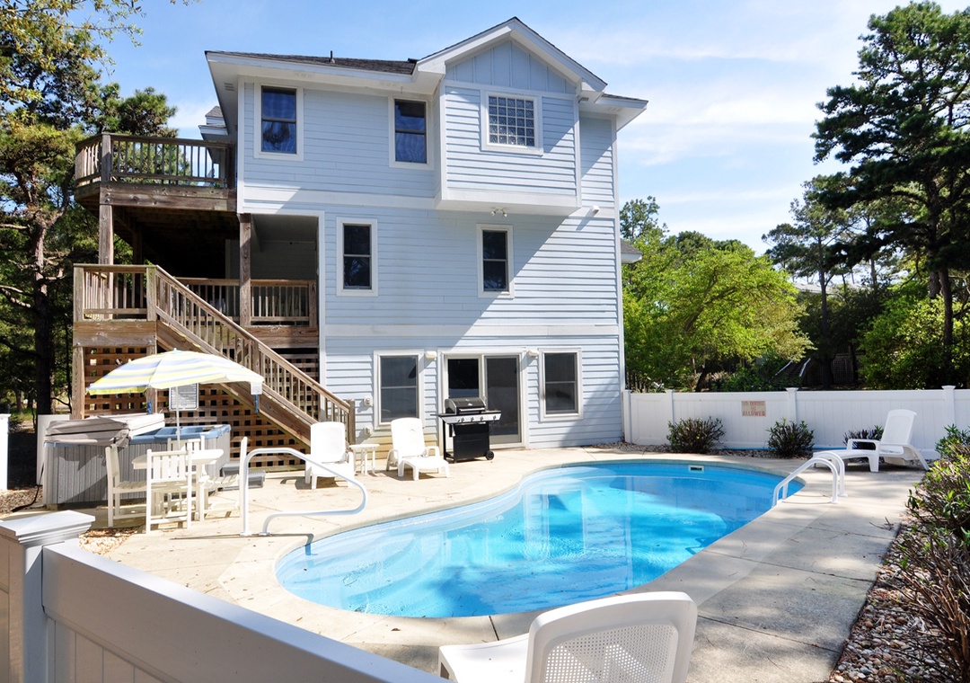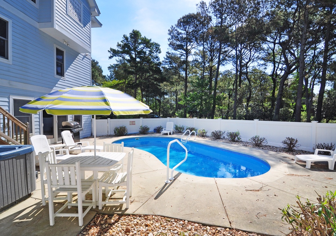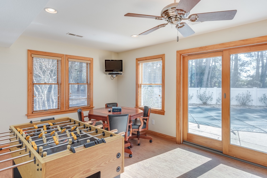 For traditional fun, the bottom floor has a rec room which includes a foosball table, poker table, kitchenette, TV and direct access to the private pool and hot tub.