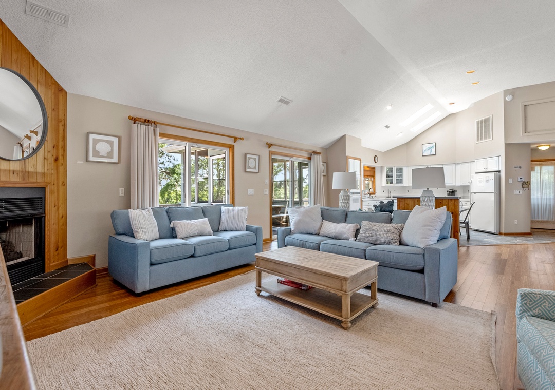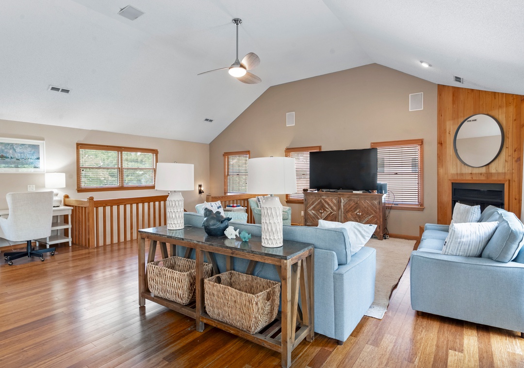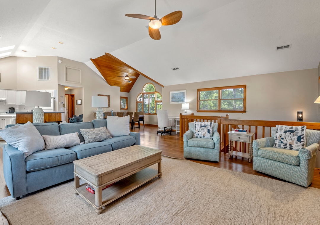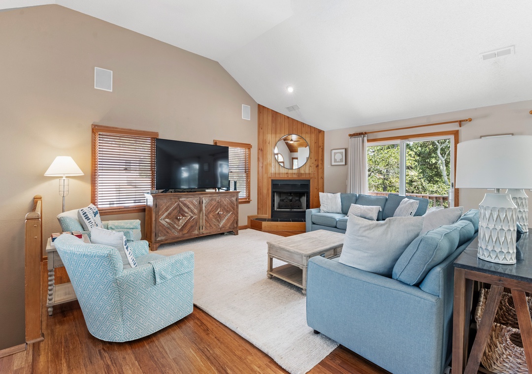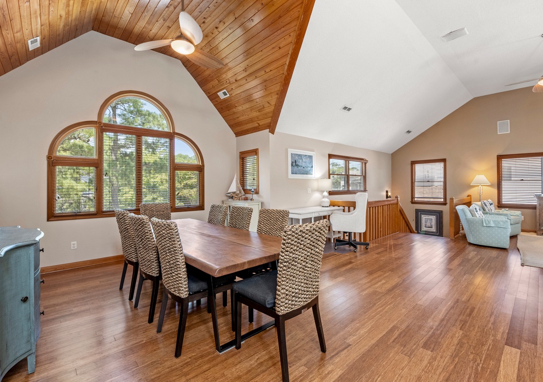 Make your escape to Hide Away Heaven, where your next Outer Banks vacation will be a secluded paradise. In addition to exclusive access to a variety of Corolla Light amenities, your family will enjoy having their own private pool and hot tub right at the house. Two levels of decking, including two screened porches, provide plenty of opportunities for outdoor living. Inside, a spacious great room is beautifully furnished with gorgeous wood flooring throughout. A vaulted ceiling with wood paneling in the dining area along with a stunning arched window add to the warmth and character of this one-of-a-kind home. The fully stocked kitchen has everything you'll need for preparing meals at the house, and the open-concept layout allows the chef in your family to still be part of the group even while cooking. The living area is equipped with a desk, where guests can stay caught up with work or school remotely.