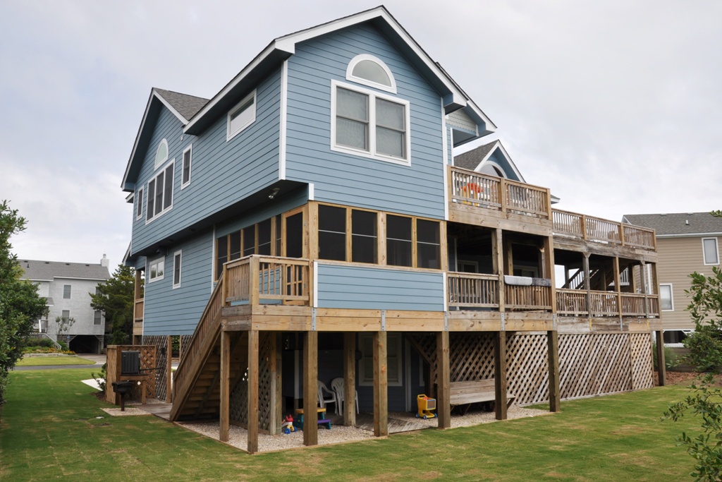 6 bedroom vacation home on the oceanside, hot tub, 3 Master Suites, TVs, DVD player, iPod dock stereo system, porch swing, outside charcoal grill, outside shower. Approx. distance to the beach is 532 ft. Parking for 4-5 cars.