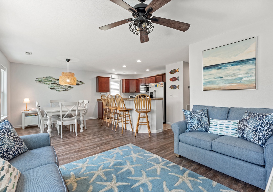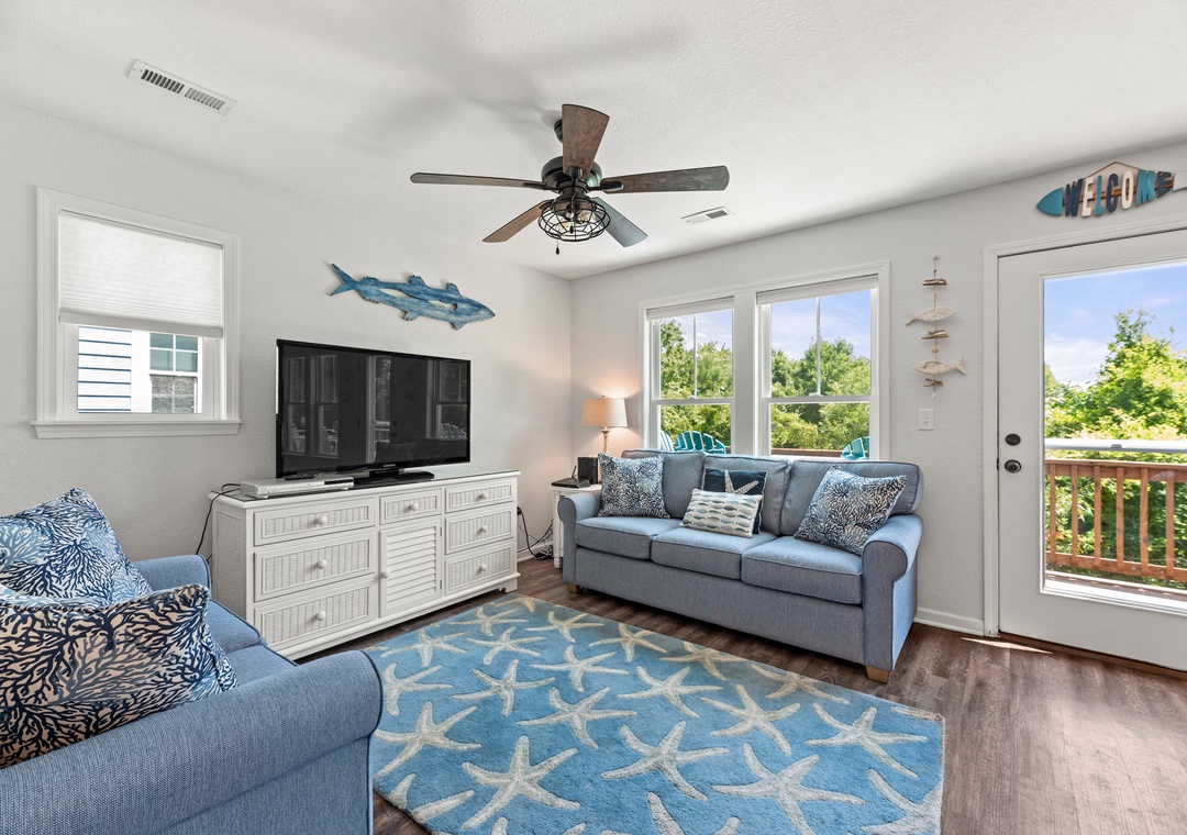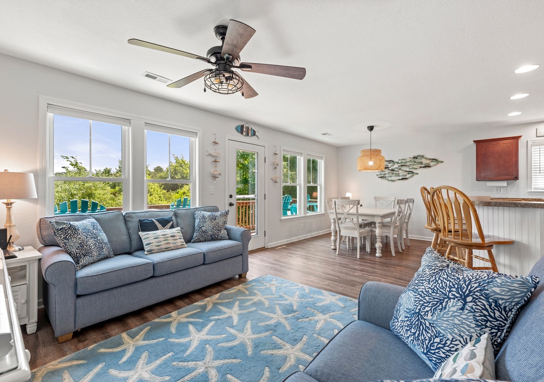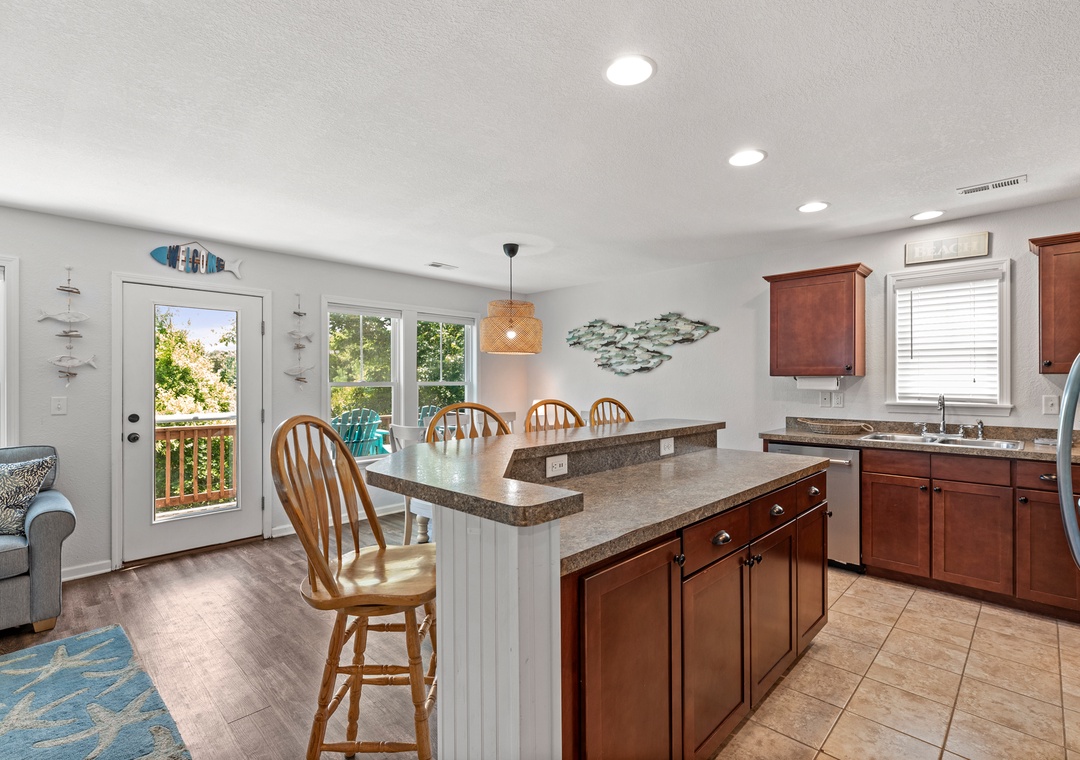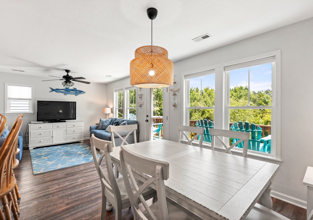 Aqua Adventure is a lovely soundside retreat located in the secluded boating community of Colington Pointe. The open-concept layout, coastal decor and an abundance of natural light make the great room feel bright and airy. Bring home the catch of the day and prepare a seafood dinner in the well-equipped kitchen with stainless steel appliances and island with bar seating. Luxury Vinyl Plank and tile flooring flows throughout the common areas of this dog-friendly home. The primary bedroom is conveniently located on the main level and includes an ensuite bath for plenty of privacy. Two additional bedrooms and a second full bath upstairs will comfortably accommodate family and friends. Outside, start your day on the charming front porch with a cup of coffee, or bask in the sun on the back deck that overlooks the creek bed, surrounded by natural vegetation and wildlife. After a day at the beach, come home and rinse off in the outdoor shower before taking a stroll down the community's waterfront boardwalk at sunset.