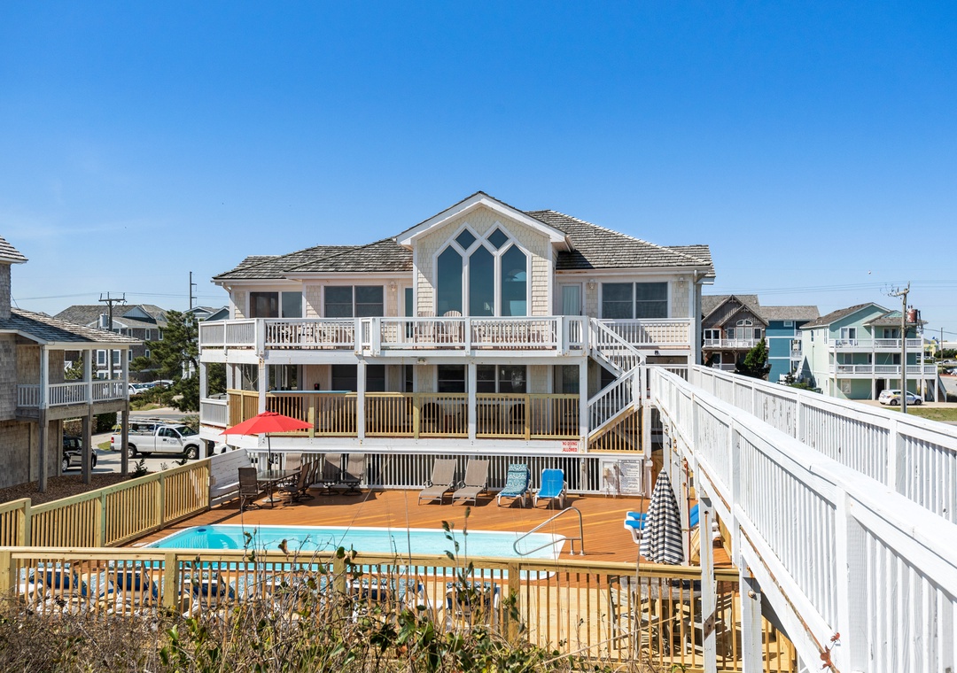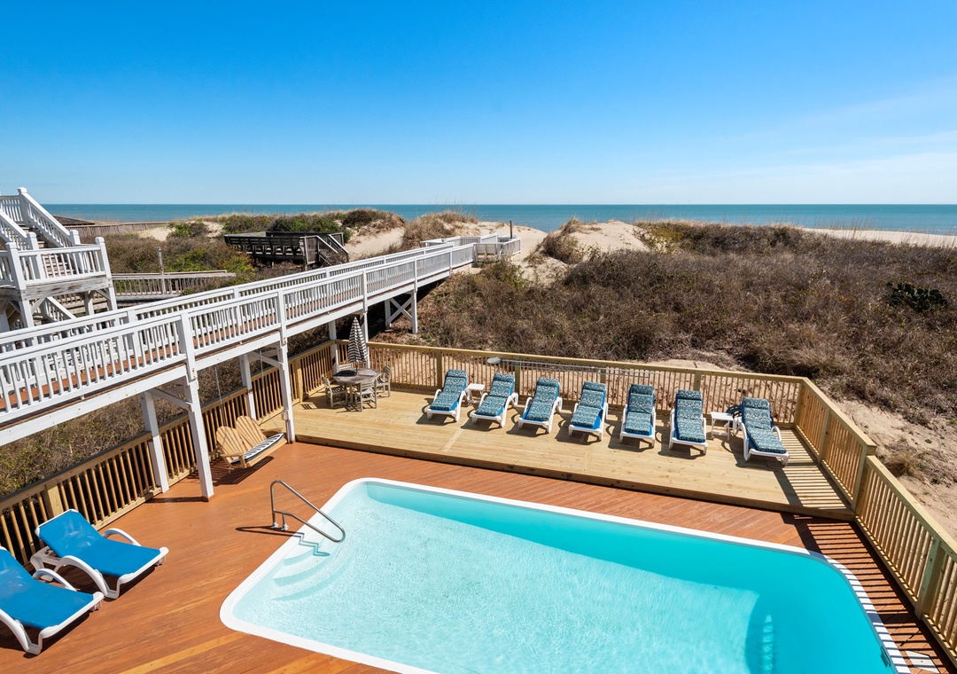 Beach Boys is the perfect Outer Banks oceanfront vacation home, beautifully furnished and very well maintained. Features and amenities include a private pool, hot tub, dry sauna and theater room. The 29' x 11' oceanfront pool is surrounded by one of the largest decks in the Village. This two-level pool deck has plenty of loungers, a swing, two tables with chairs and lots of space for games.