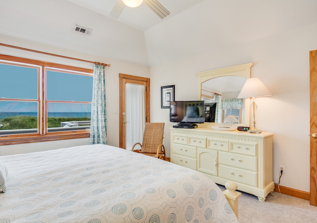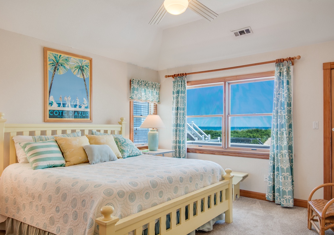 You'll find quality furnishings and upgrades throughout this Nags Head beach retreat. Enjoy spacious common areas on the top and mid-level floors. The top level includes a large living area with 55" Smart TV and refinished hardwood floors. Take in the incredible views of the ocean and beautiful sunrises. Relax on the chaise lounge in the sunroom, where you can even close the French doors for a quiet afternoon nap. The well-stocked kitchen features granite countertops, a grocery pantry, two dishwashers, a large fridge, double oven and microwave. Serve meals for the entire family at the dining table, which can accommodate large groups. There's also additional seating for four more at the kitchen bar. A gas grill is conveniently located outside on the covered porch near the kitchen.