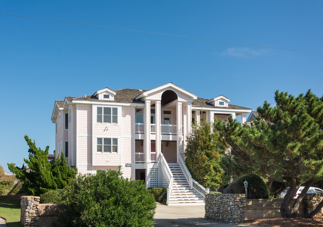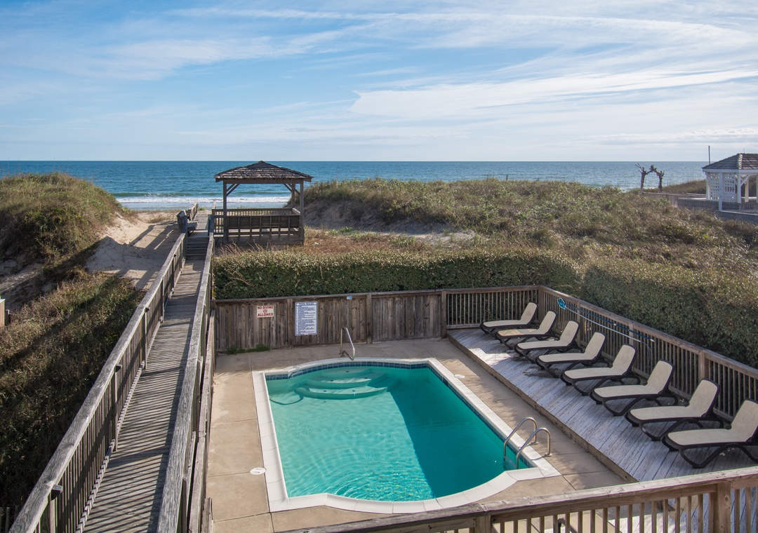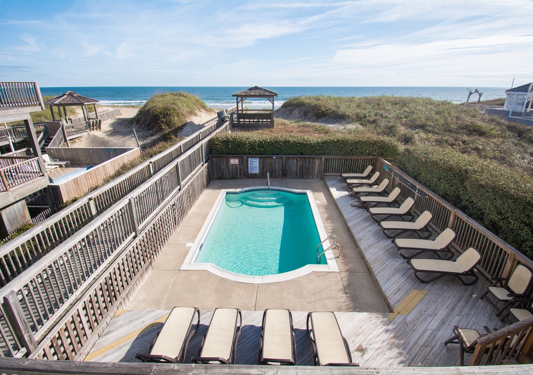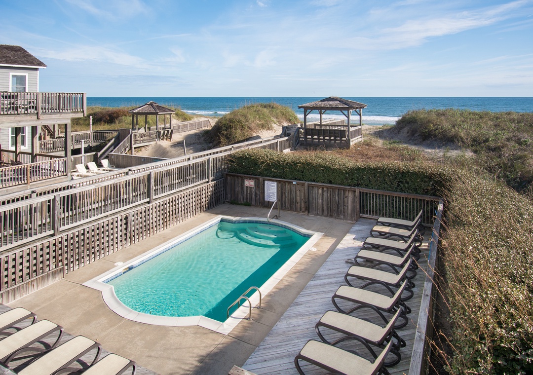 8 bedroom Outer Banks oceanfront in Nags Head. Kitchen & expanded living area on ground level. Private pool, hot tub, Dry Sauna, 3 double jetted tubs, 3 gas fireplaces, 3 refrigerators, 2 dishwashers, 2 ovens, TVs, rec room w/pool table, WiFi, wet bar, kitchenette, card table, den, outdoor grill, 2 outside showers, private boardwalk to beach with covered gazebo.