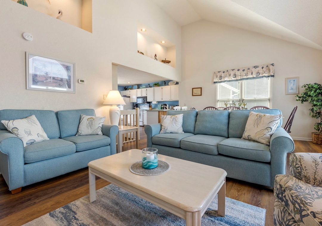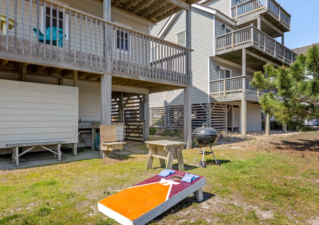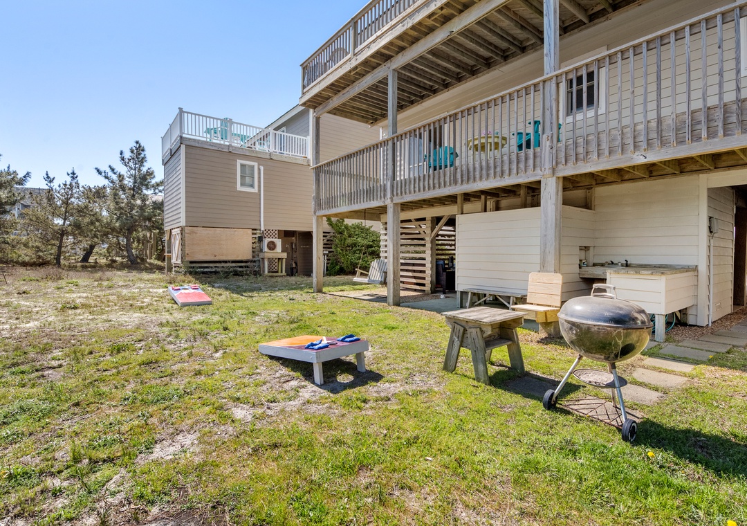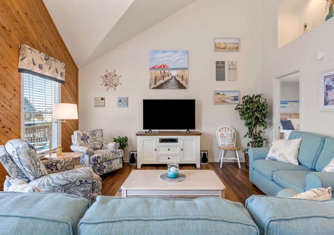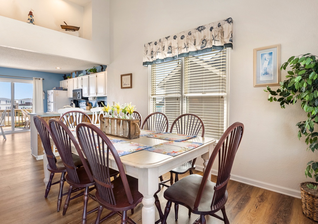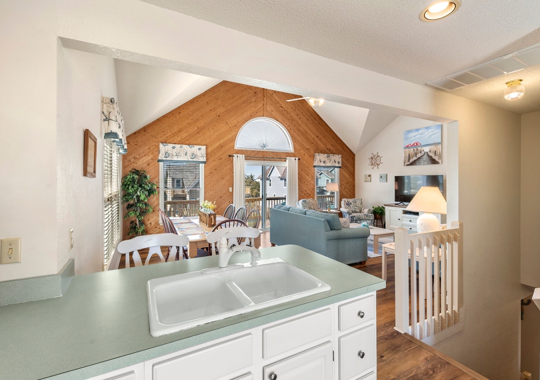 Harrell's Retreat is a recently updated and comfortably furnished oceanside home located in Dolphin Run, a part of the Village at Nags Head community. The coastal-inspired color palette and tasteful beach-themed decor create a delightful atmosphere for casual family fun. The great room boasts vaulted ceilings and an open-concept layout that encourages quality time spent together. The entire top level features stylish LVP flooring throughout, including the spacious primary suite. Downstairs, three more bedrooms and a second full bath will comfortably accommodate family and friends. All bedrooms provide deck access for waking up to a salty ocean breeze. After a day at the beach, the outdoor fun can continue back at the house in the backyard area with cornhole boards. Prepare the catch of the day on the fish cleaning table and fire up the grill for a fresh seafood feast.
