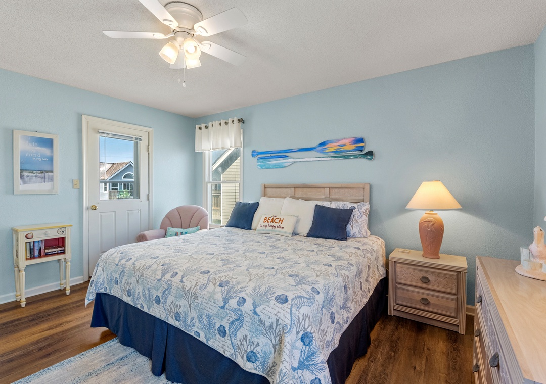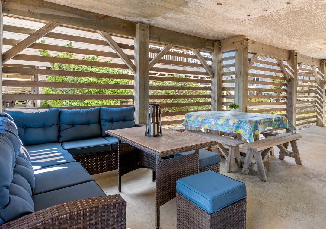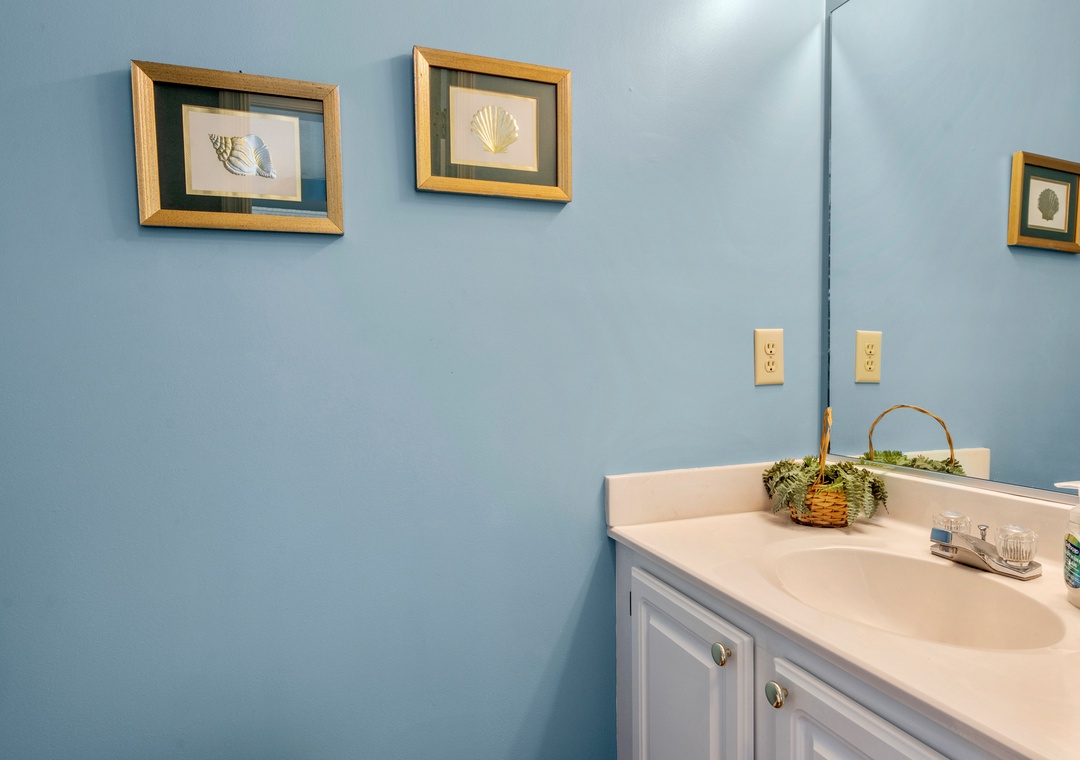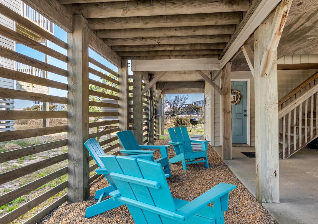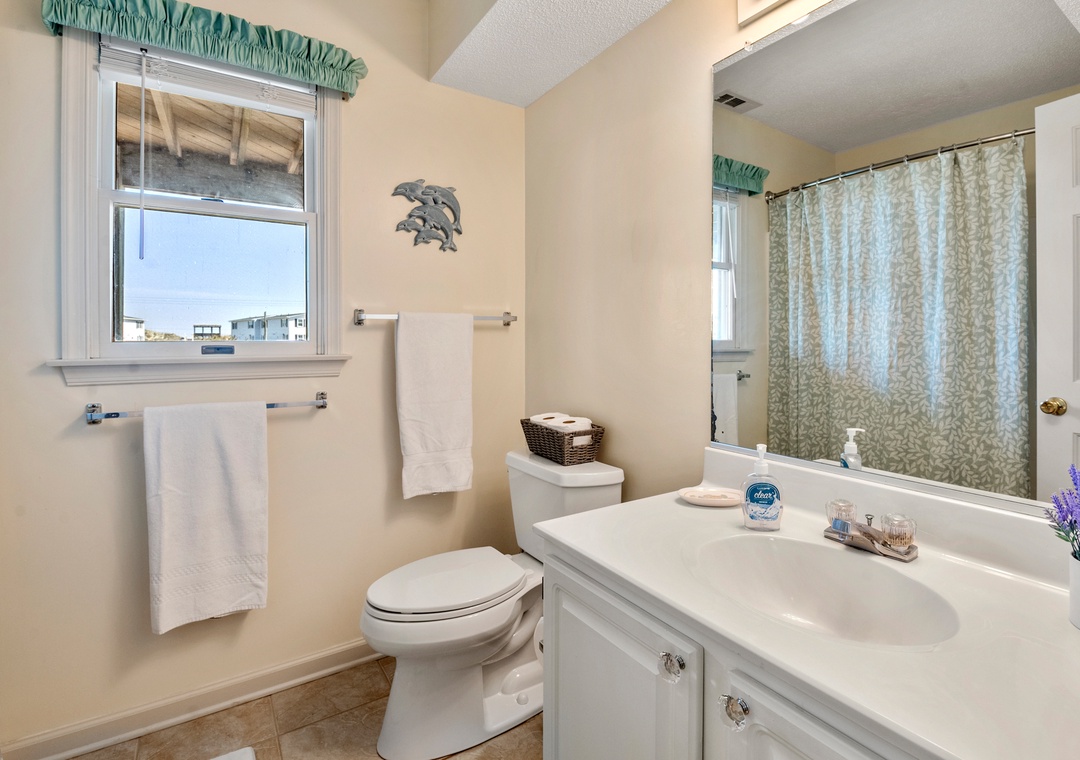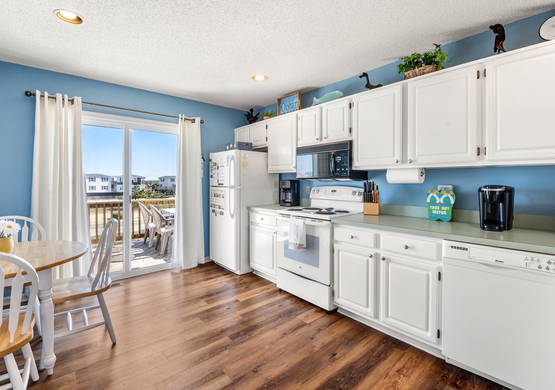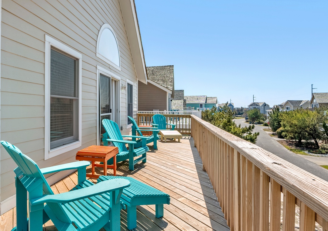 Harrell's Retreat is a recently updated and comfortably furnished oceanside home located in Dolphin Run, a part of the Village at Nags Head community. The coastal-inspired color palette and tasteful beach-themed decor create a delightful atmosphere for casual family fun. The great room boasts vaulted ceilings and an open-concept layout that encourages quality time spent together. The entire top level features stylish LVP flooring throughout, including the spacious primary suite. Downstairs, three more bedrooms and a second full bath will comfortably accommodate family and friends. All bedrooms provide deck access for waking up to a salty ocean breeze. After a day at the beach, the outdoor fun can continue back at the house in the backyard area with cornhole boards. Prepare the catch of the day on the fish cleaning table and fire up the grill for a fresh seafood feast.