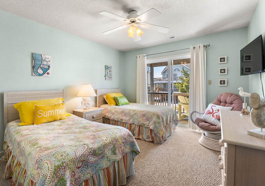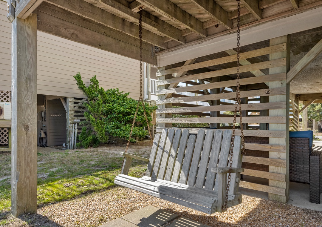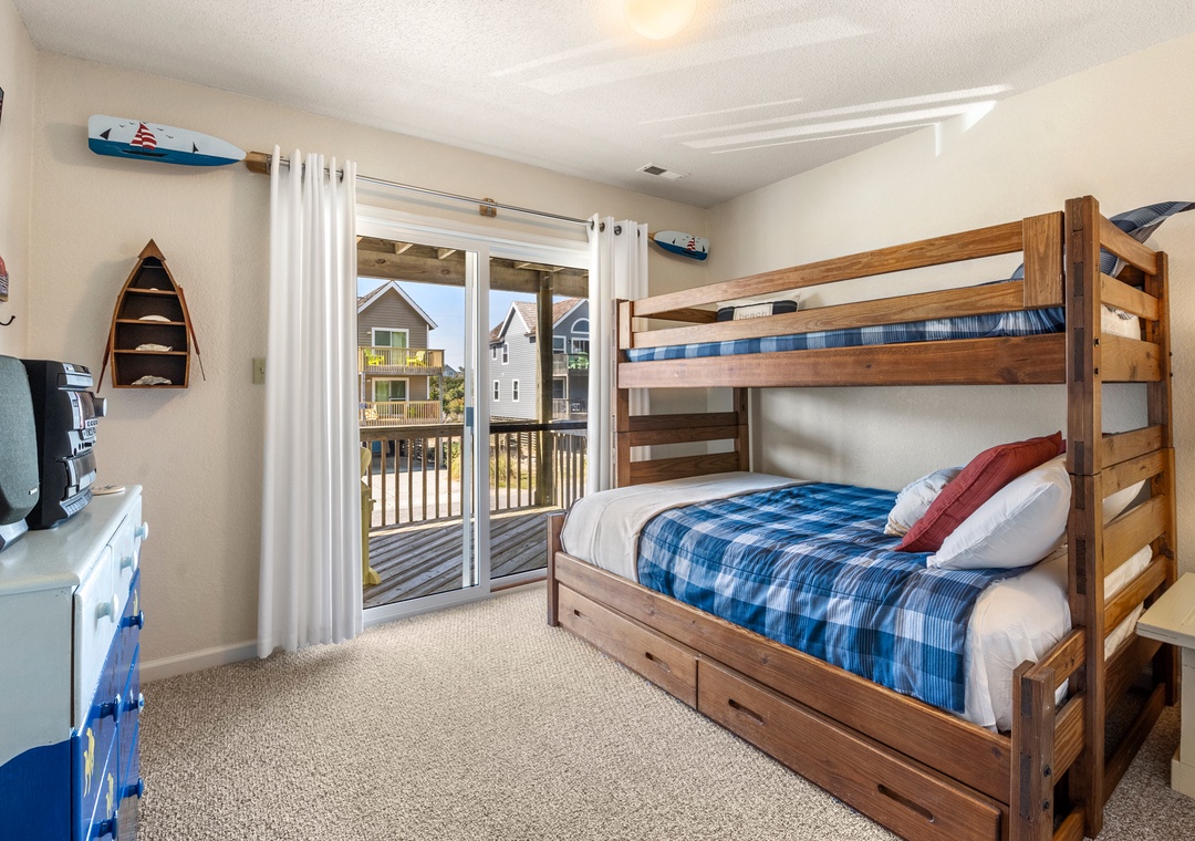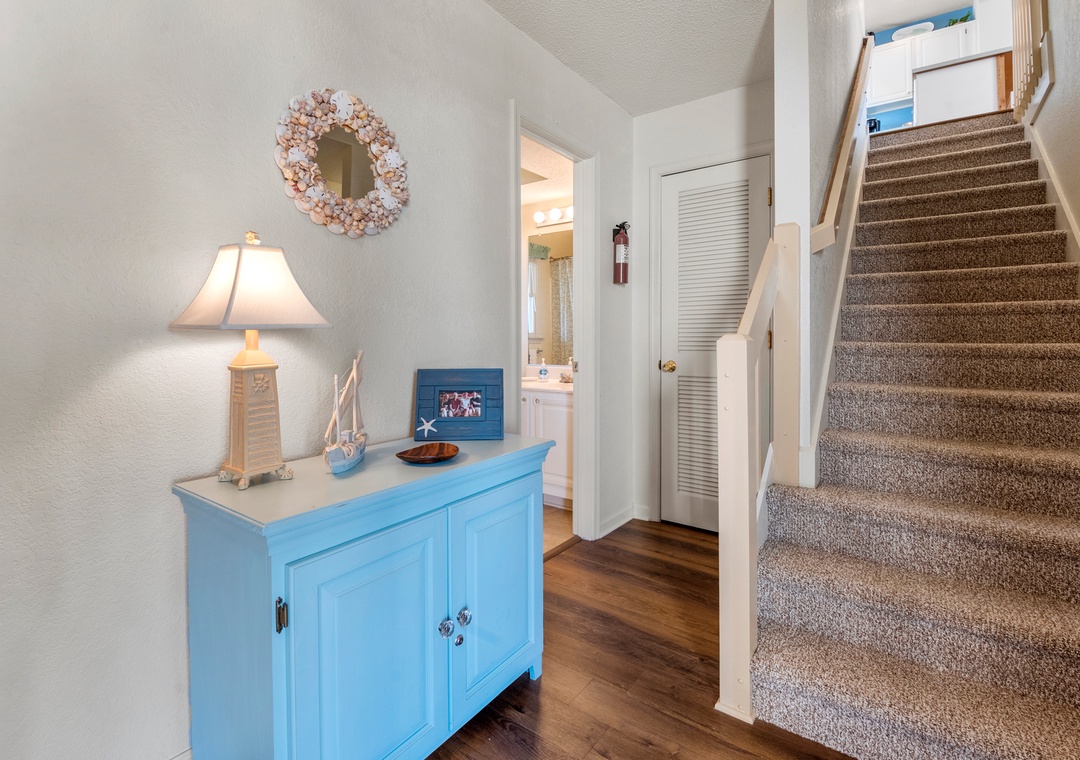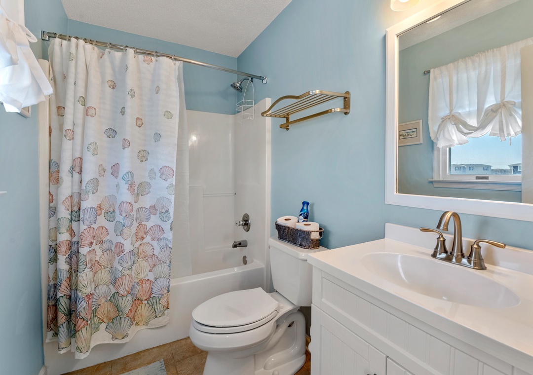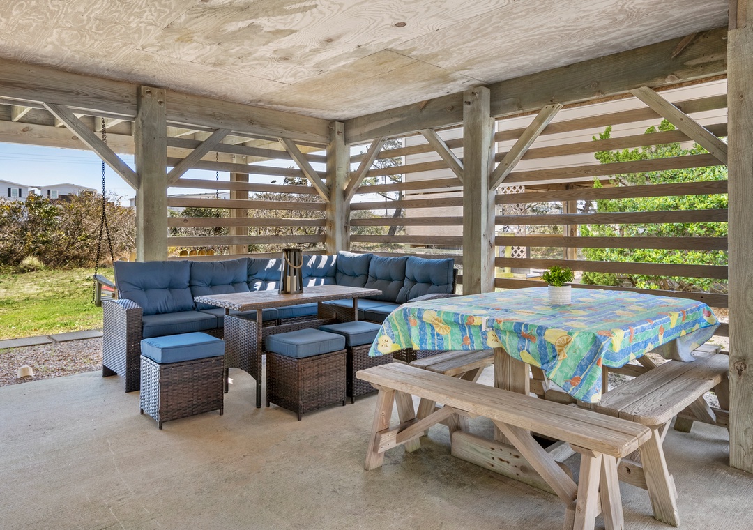 Harrell's Retreat is a recently updated and comfortably furnished oceanside home located in Dolphin Run, a part of the Village at Nags Head community. The coastal-inspired color palette and tasteful beach-themed decor create a delightful atmosphere for casual family fun. The great room boasts vaulted ceilings and an open-concept layout that encourages quality time spent together. The entire top level features stylish LVP flooring throughout, including the spacious primary suite. Downstairs, three more bedrooms and a second full bath will comfortably accommodate family and friends. All bedrooms provide deck access for waking up to a salty ocean breeze. After a day at the beach, the outdoor fun can continue back at the house in the backyard area with cornhole boards. Prepare the catch of the day on the fish cleaning table and fire up the grill for a fresh seafood feast.