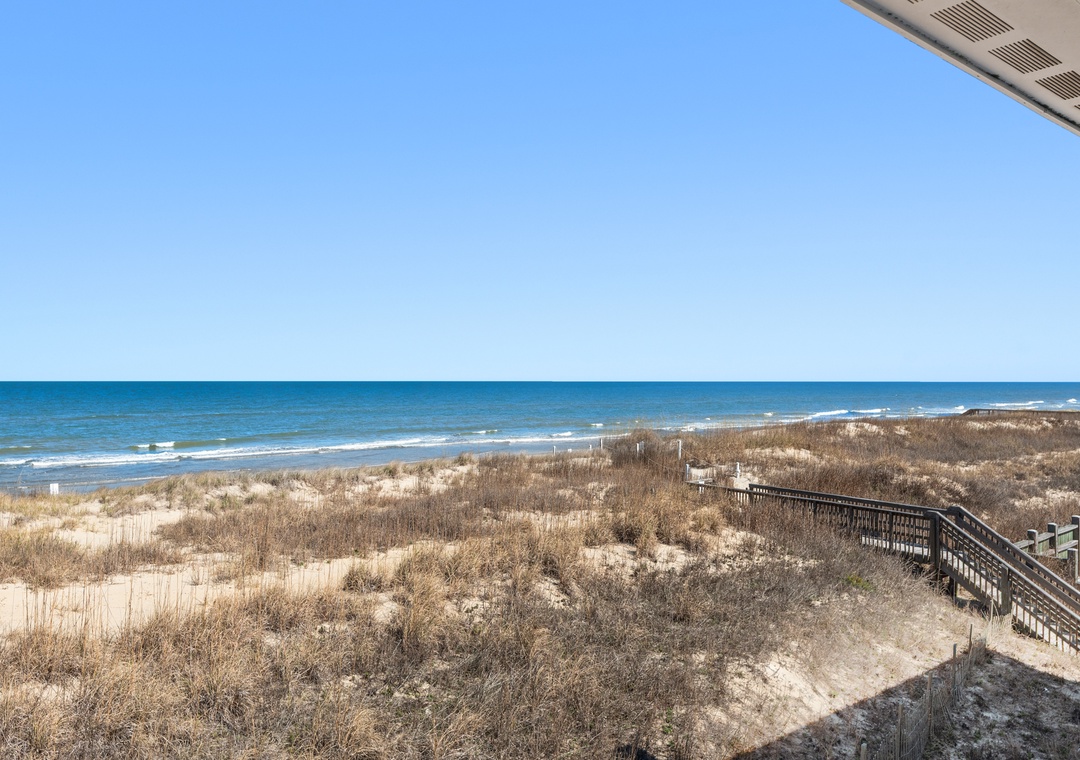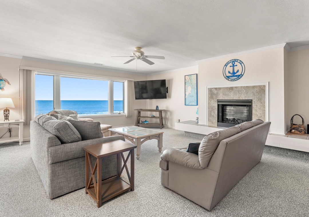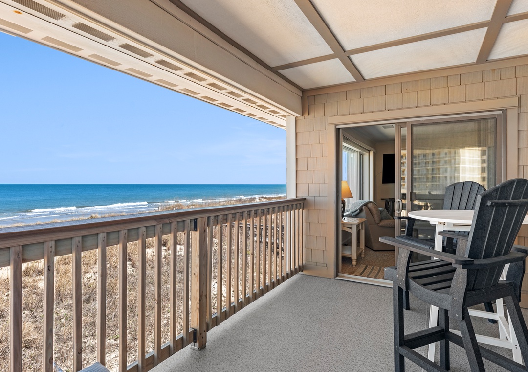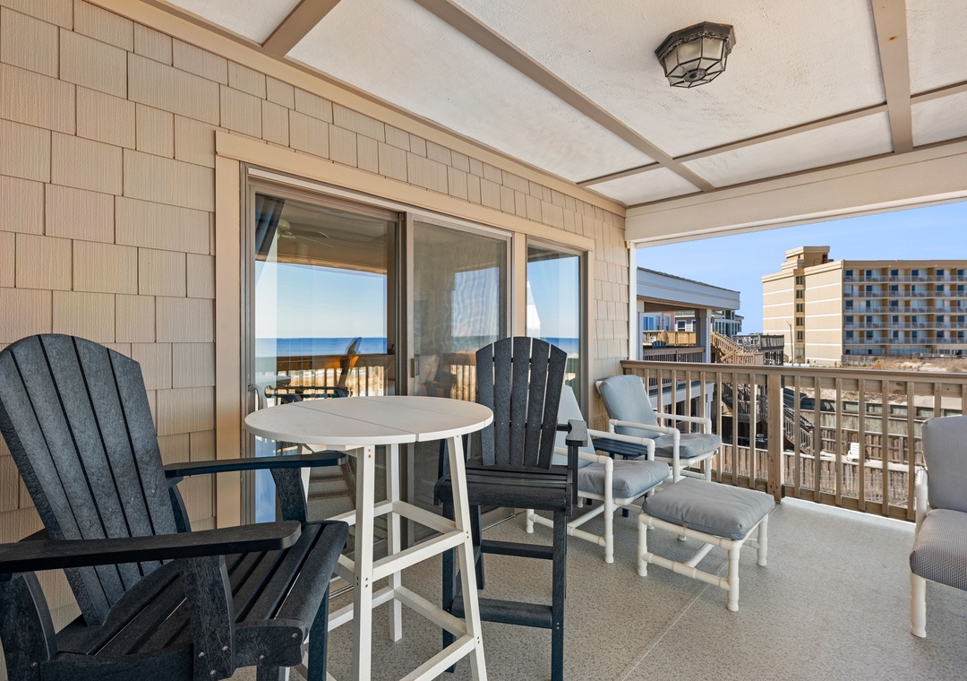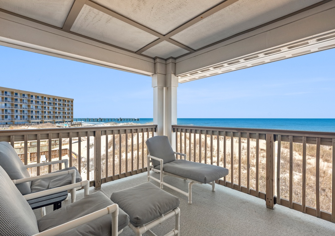 After a day on the beach or lounging by the pool, come inside and relax in the spacious great room, where a wall of east-facing picture windows makes the most of the unobstructed ocean view. This tastefully furnished space features a 65" Smart TV and a comfy new sofa. It leads out to your own private covered terrace with pub table and chairs where you can listen to the crashing waves or simply breathe in the salty ocean air. The chef in your group will appreciate the well-equipped kitchen with maple cabinetry, solid-surface countertops and bar seating. Best of all, the open-concept layout allows them to still socialize and enjoy the ocean view while preparing meals. A variety of books, games and puzzles provide plenty of opportunities for indoor entertainment and spending quality time with loved ones. At the end of the night, retreat to the oceanfront primary king bedroom, which offers an incredible view and deck access so you can wake up to the sunrise over the sparkling Atlantic while laying in bed. The primary also includes a spacious ensuite bath with dual vanities, large jetted tub and walk-in shower. Two additional bedrooms and a full hall bath make The Sandbar perfect for vacationing with family and friends. In addition to basic cable service, the living area and all three bedrooms feature Smart TV's preloaded with all major streaming apps - just pick your favorite and use your own login info! Both bathrooms are equipped with handicap grab bars for safety and accessibility.