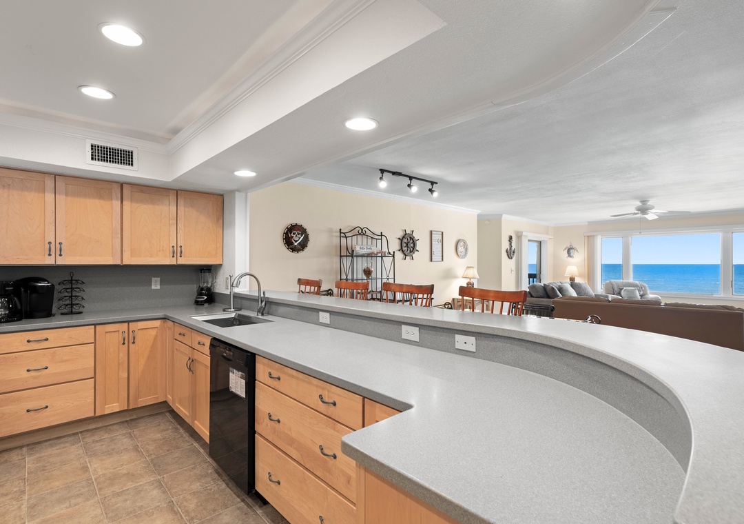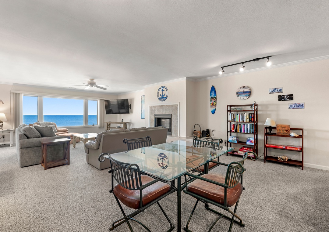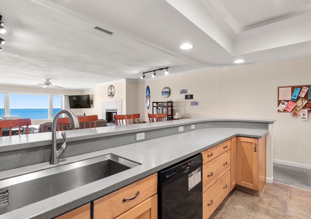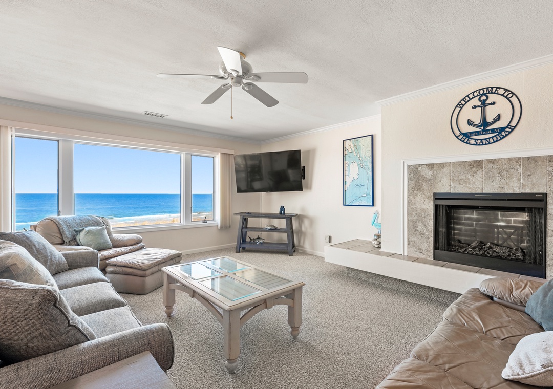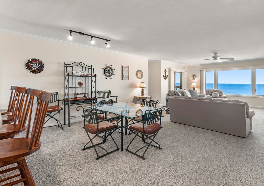 After a day on the beach or lounging by the pool, come inside and relax in the spacious great room, where a wall of east-facing picture windows makes the most of the unobstructed ocean view. This tastefully furnished space features a 65" Smart TV and a comfy new sofa. It leads out to your own private covered terrace with pub table and chairs where you can listen to the crashing waves or simply breathe in the salty ocean air. The chef in your group will appreciate the well-equipped kitchen with maple cabinetry, solid-surface countertops and bar seating. Best of all, the open-concept layout allows them to still socialize and enjoy the ocean view while preparing meals. A variety of books, games and puzzles provide plenty of opportunities for indoor entertainment and spending quality time with loved ones. At the end of the night, retreat to the oceanfront primary king bedroom, which offers an incredible view and deck access so you can wake up to the sunrise over the sparkling Atlantic while laying in bed. The primary also includes a spacious ensuite bath with dual vanities, large jetted tub and walk-in shower. Two additional bedrooms and a full hall bath make The Sandbar perfect for vacationing with family and friends. In addition to basic cable service, the living area and all three bedrooms feature Smart TV's preloaded with all major streaming apps - just pick your favorite and use your own login info! Both bathrooms are equipped with handicap grab bars for safety and accessibility.