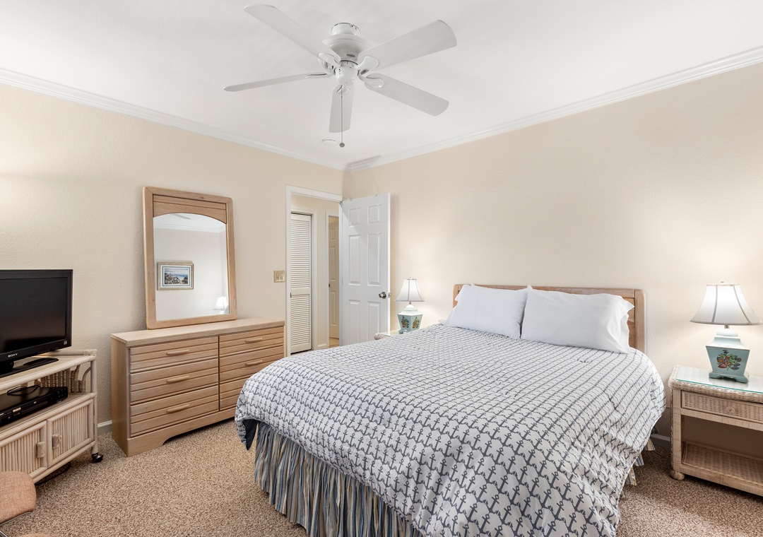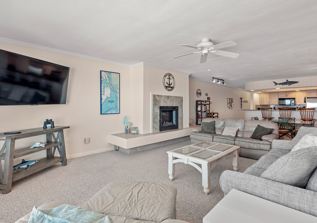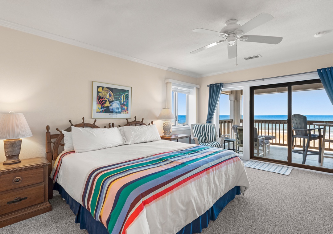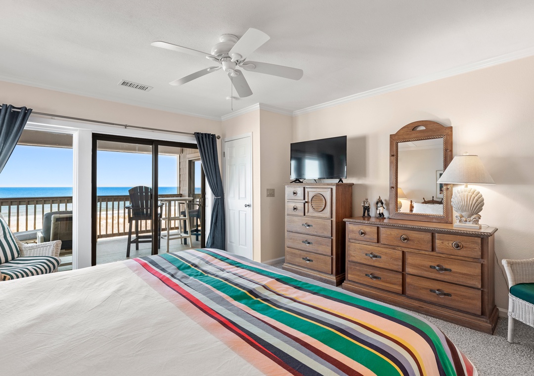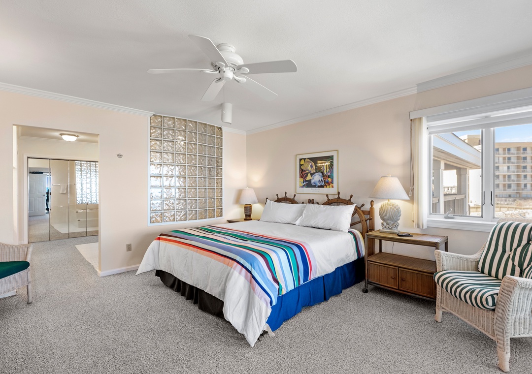 After a day on the beach or lounging by the pool, come inside and relax in the spacious great room, where a wall of east-facing picture windows makes the most of the unobstructed ocean view. This tastefully furnished space features a 65" Smart TV and a comfy new sofa. It leads out to your own private covered terrace with pub table and chairs where you can listen to the crashing waves or simply breathe in the salty ocean air. The chef in your group will appreciate the well-equipped kitchen with maple cabinetry, solid-surface countertops and bar seating. Best of all, the open-concept layout allows them to still socialize and enjoy the ocean view while preparing meals. A variety of books, games and puzzles provide plenty of opportunities for indoor entertainment and spending quality time with loved ones. At the end of the night, retreat to the oceanfront primary king bedroom, which offers an incredible view and deck access so you can wake up to the sunrise over the sparkling Atlantic while laying in bed. The primary also includes a spacious ensuite bath with dual vanities, large jetted tub and walk-in shower. Two additional bedrooms and a full hall bath make The Sandbar perfect for vacationing with family and friends. In addition to basic cable service, the living area and all three bedrooms feature Smart TV's preloaded with all major streaming apps - just pick your favorite and use your own login info! Both bathrooms are equipped with handicap grab bars for safety and accessibility.