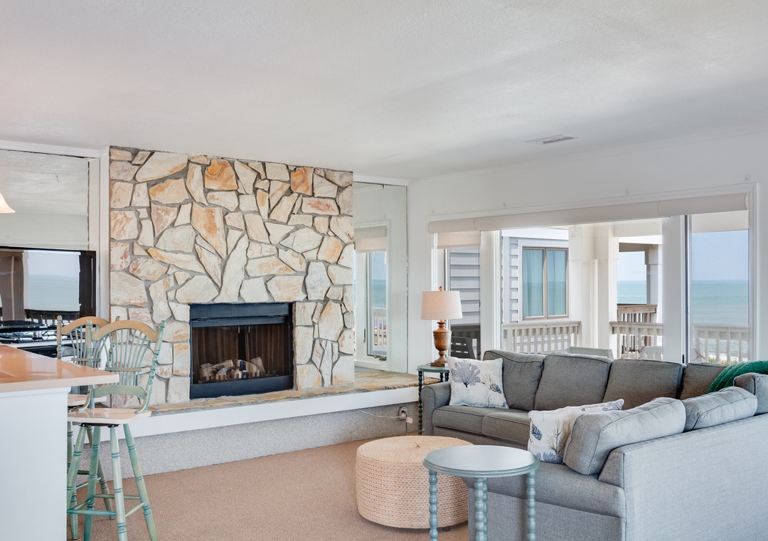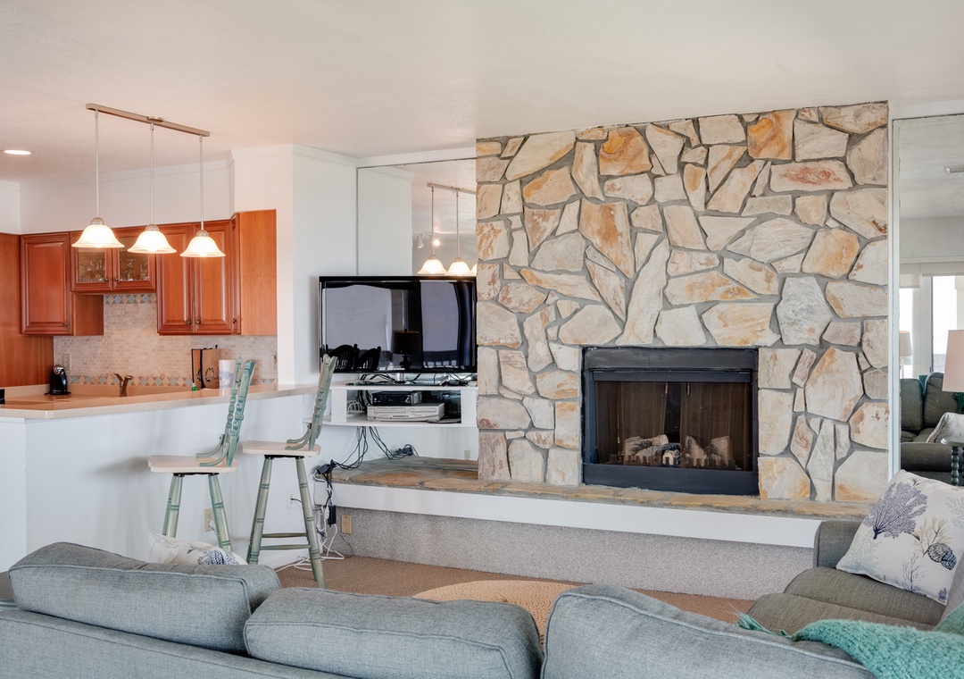 Step inside to discover a comfortable living space adorned with TVs and DVD players, ensuring entertainment for all ages. The inviting stone hearth and fireplace with an electric log provide a cozy atmosphere for cooler evenings.