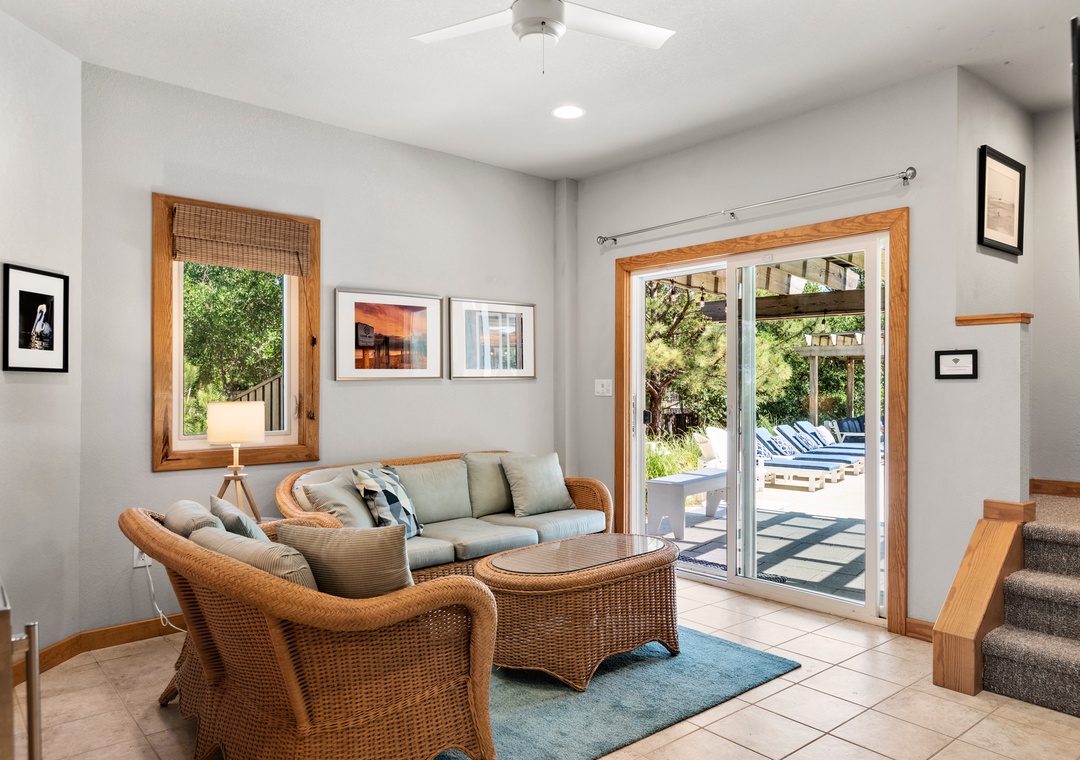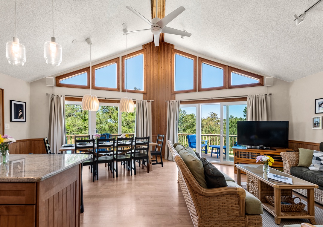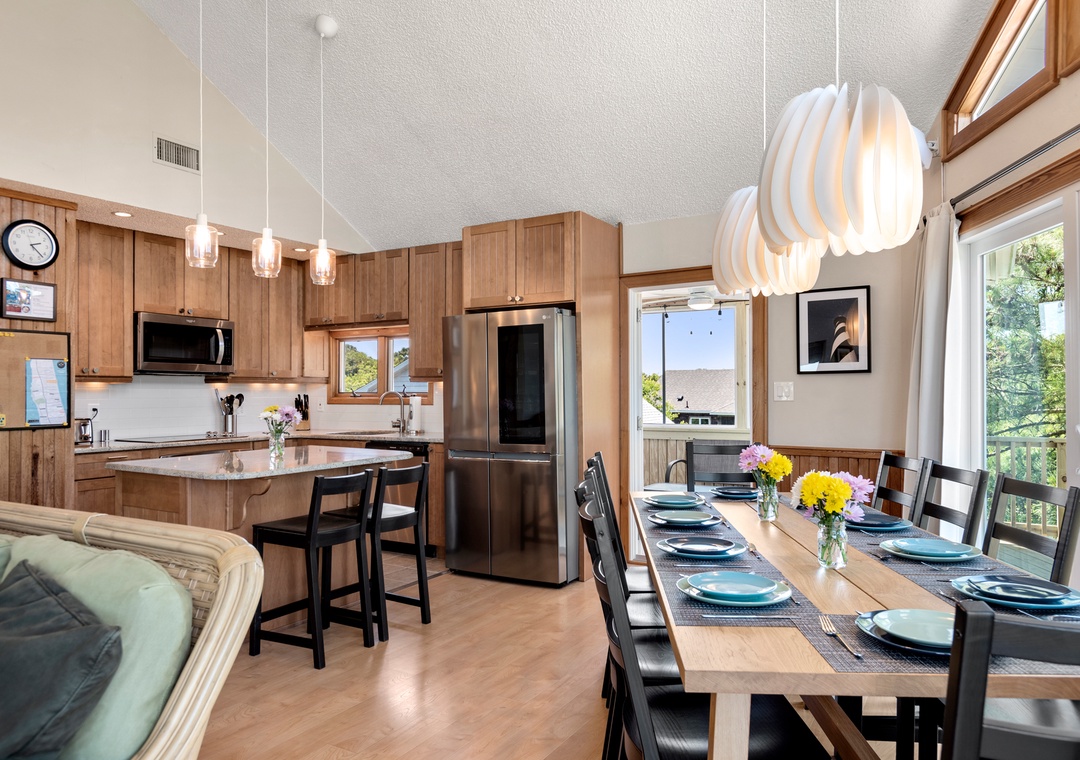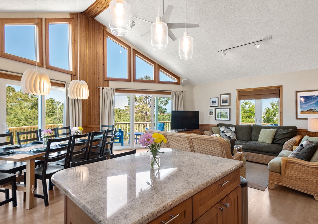 At Duck Side of the Moon, you have plenty of options of how to spend your day: Start the day with a short walk over to Duck Donuts or Tullio’s Bakery and grab fresh donuts or bagels for your gang to enjoy with coffee for breakfast. Then pass the hours with friends and family lounging poolside, listening to music on the outdoor speakers and enjoying al fresco meals in the covered outdoor dining area. Or spend the day playing in the surf at the beach, just a short walk down Plover Drive. For a change of pace, take a stroll over to the upscale shops at Scarborough Faire and other nearby shopping and grab an ice cream or spend the afternoon browsing. Later, you can head over to top restaurants such as Aqua, NC Coast, or Blue Point Grill, all just a short walk away, for a sunset cocktail and fine dining or a casual bite with the best views around. And then come back home and enjoy the evening around the firepit. The wide range of options and spaces at Duck Side of the Moon offer something to please everyone in your group.