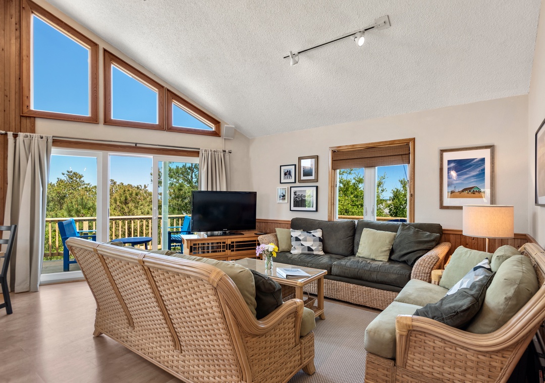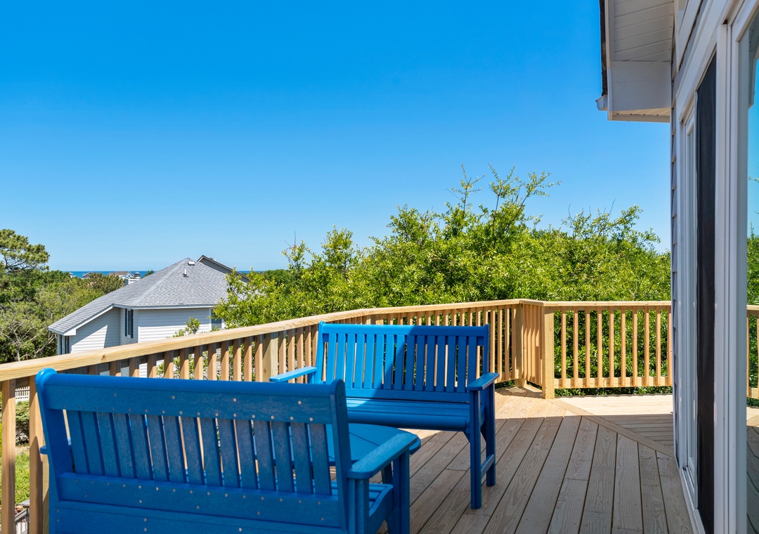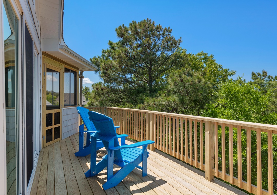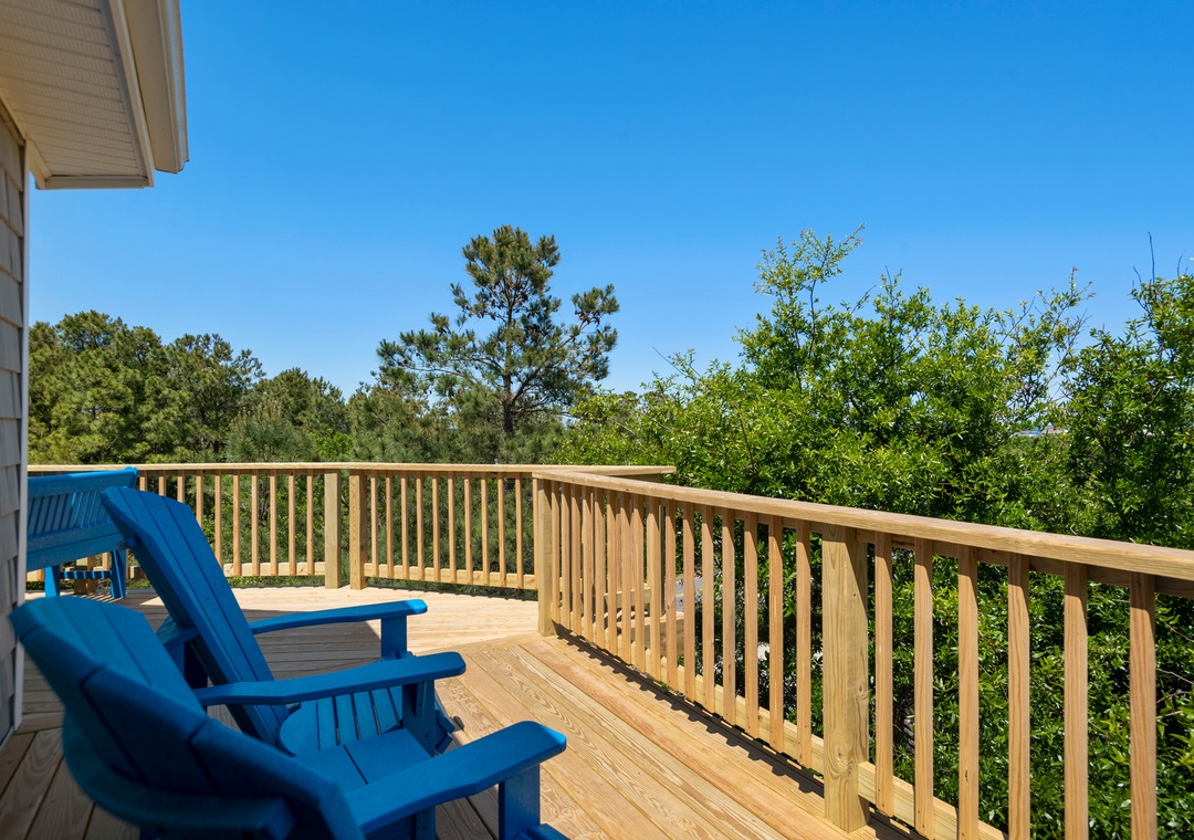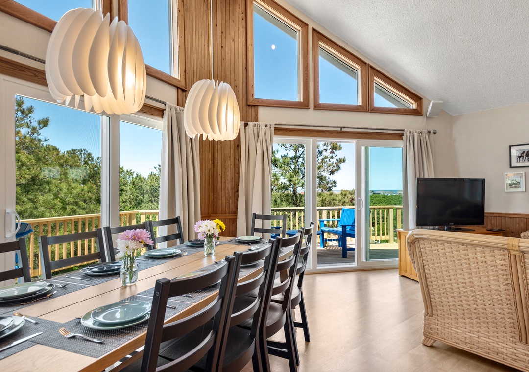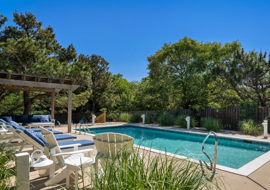 Nestled among the treetops on a hill, Duck Side of the Moon is a six-bedroom home with a perfect location in Duck – a 5-minute walk east to the beach, and an easy stroll west to some of the best dining and shopping anywhere in the Outer Banks in one of the "Best Small Towns in the South", according to Travel & Leisure magazine. Sit on the breezy decks and enjoy the beautiful views of the ocean horizon or take a dip or swim a few laps in the large private saltwater pool. Enjoy the serene enclosed outdoor space with plenty of room to soak up the sun, or spend the afternoon under one of the pergolas with a good book and your favorite beverage.