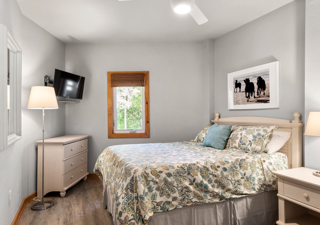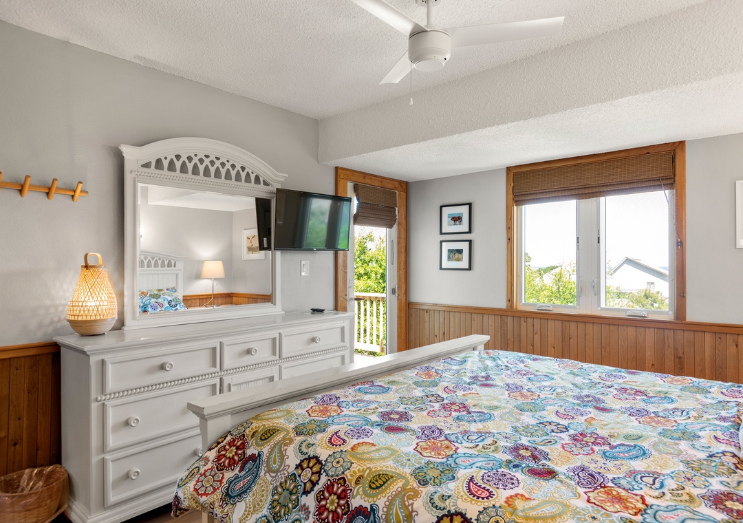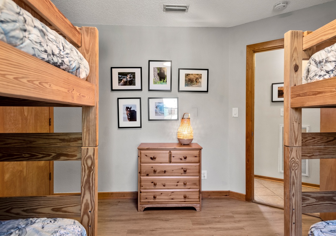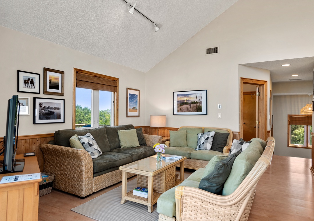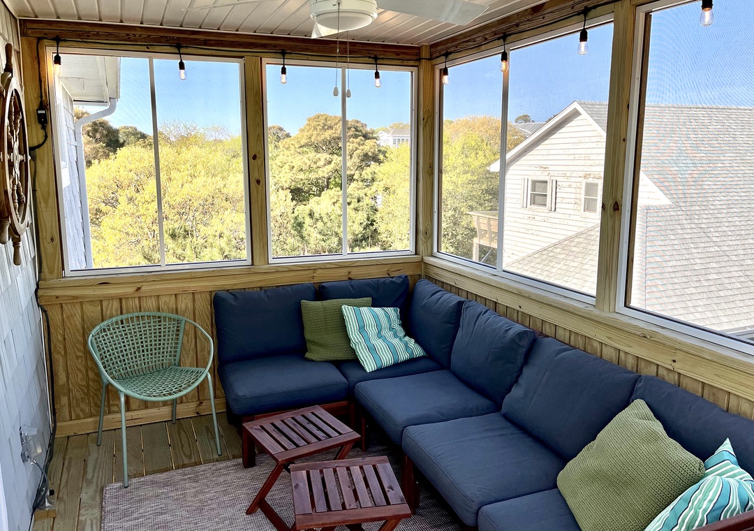 Duck Side of the Moon is beautifully furnished and decorated, with photographs of the Outer Banks by local and visiting artists. Bedrooms and common areas feature Roku TVs, with cable and DVD players as well in common areas. Duck Side of the Moon’s top level has vaulted ceilings and features a kitchen, a sunlit living room, and large dining area that open to wide decks, as well as a bathroom with a relaxing steam shower, a king bedroom with separate deck access, and an enclosed screen porch. The entry-level, just below, has a full bath and 3 bedrooms - one with king bed, one with two full beds, and a perfect room for kids with bunk beds that sleeps four. The lower level -- with direct access to the beautiful pool and outdoor dining and lounging areas -- has an indoor sitting/TV area and separate small kitchen (with dishwasher and an icemaker), plus two queen bedrooms and a full bath. An external freight elevator means that you can take luggage and groceries out of your car and send them up, saving your knees and back the hassle of lugging them up the steps. If you can’t be totally on vacation and need to work or go to school remotely there is high-bandwidth WiFi.