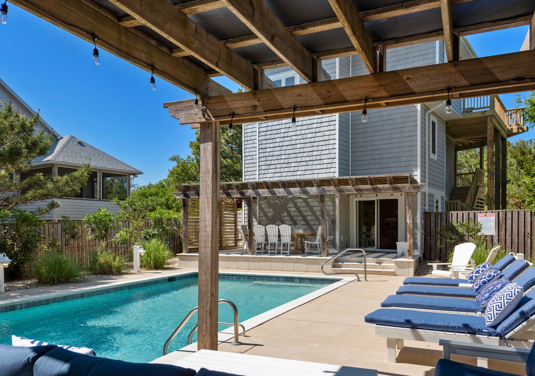 Duck Side of the Moon has been lovingly restored! We choose Duck over and over again for it`s natural beauty, privacy, and the village experience. This house is a reflection of all that -- close to the beach with an easy walk to town and brand new decks that allow you take in the ocean and the live oaks. The house is is well-appointed and features all new flooring from top to bottom. We cooked the whole week and the kitchen provided everything we needed. The real gem of this house is the pool. It is an old-school tiled pool that is very big for beach standards. There are two pergolas that are tripped out in lights for the evening and plenty of lounge and adirondack chairs plus an outdoor dining area. We used the firepit and the grill during our stay -- I`d recommend a grill tray to deal with the ashes -- it`s a charcoal park grill. You will need to bring everything you need for the beach -- we donated six beach chairs to the house but hard to say if they`ll still be on site. We were surprised to find kayaks but the weather was not cooperative during our stay -- we did rent beach cruisers for the week and used them constantly to make a quick ride to the beach or to town. Great house - great location - great poolside!- Reviewed On: 5/1/2021