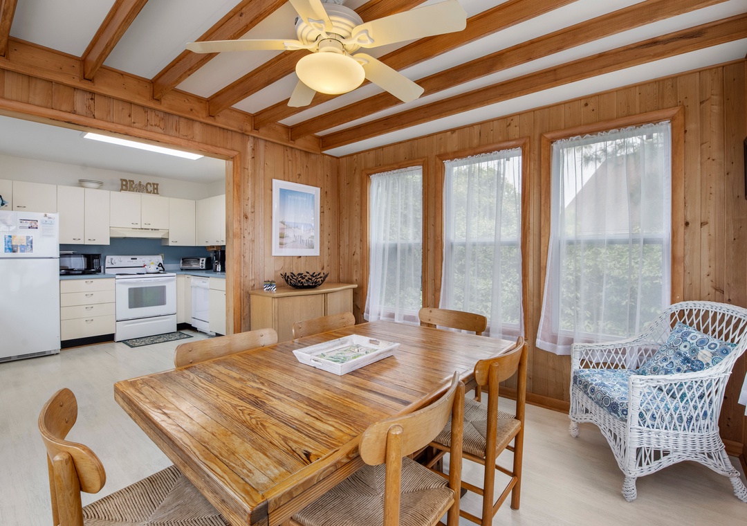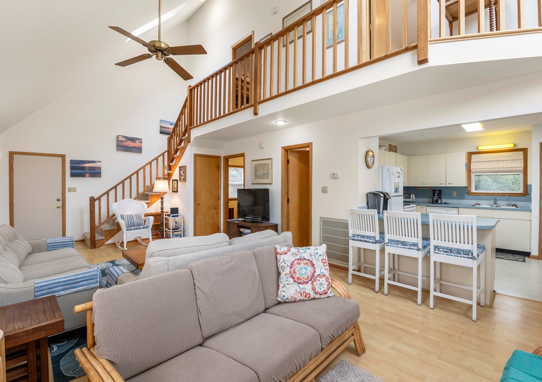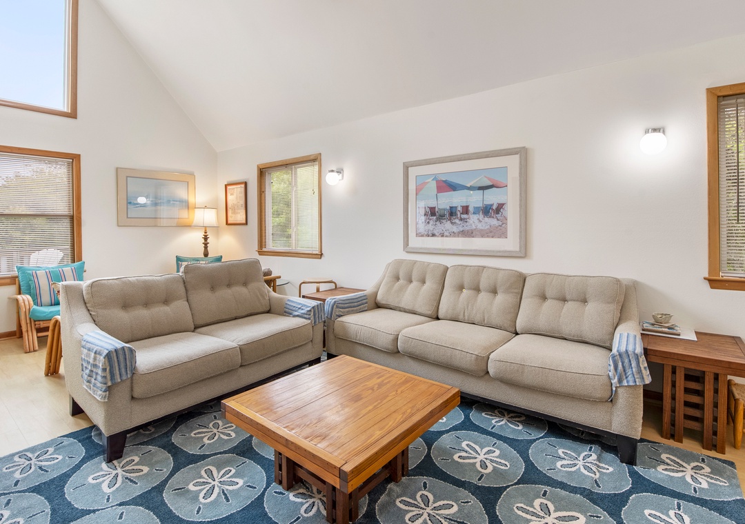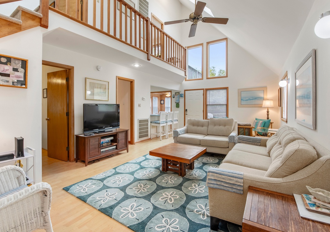 The classic Saltbox design features vaulted ceilings and two stories of windows in the living area for abundant natural light. After a day at the beach, come home and gather in the living area with two seating areas so everyone has a place to relax and mingle. When you're not dining out at one of Duck's fabulous restaurants, the chef in the family can prepare meals in the well-equipped kitchen overlooking the great room. Multiple decks on both the north and south sides of the house provide plenty of room for enjoying the sun, salt air and oceanside breezes.