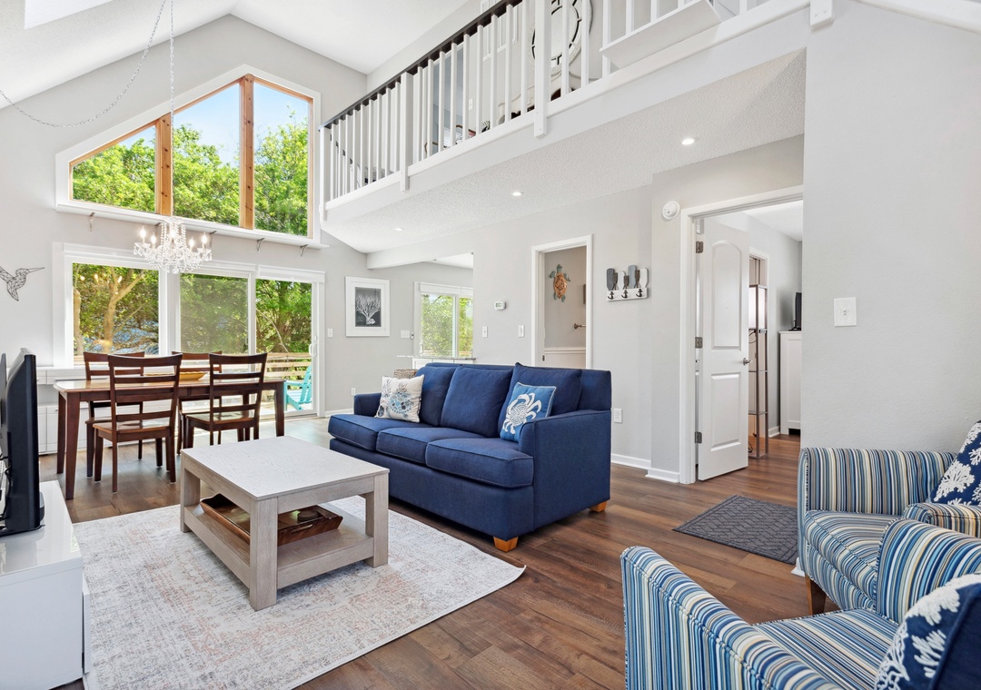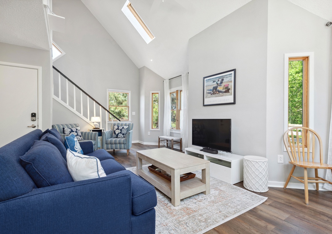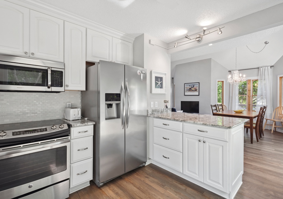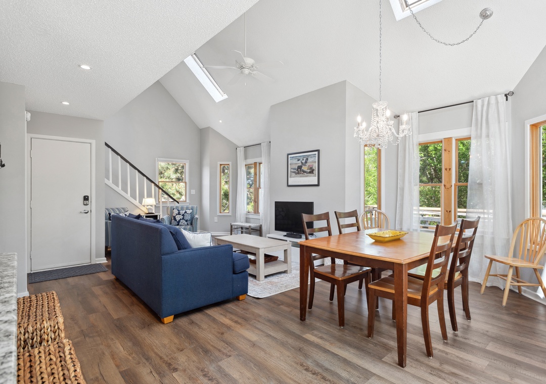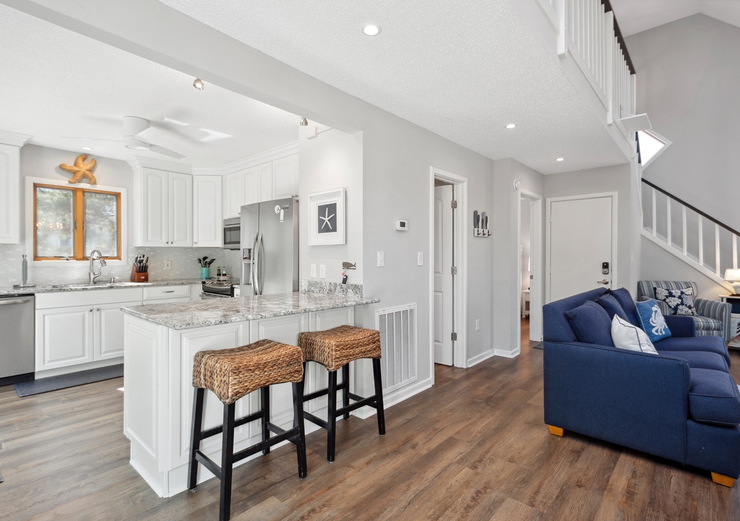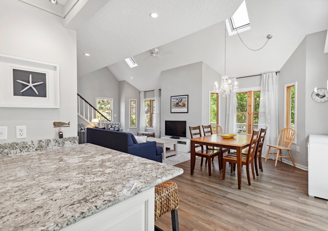After a day at the beach or exploring town, come home and relax in the open-concept living area with vaulted ceilings and skylights that create a bright and airy vibe with abundant natural light. This fabulous combination living/dining space leads out to an expansive wrap-around deck where you lounge in the sun for your daily dose of Vitamin D. Back inside, get dinner started in the brand new kitchen with stainless steel appliances and granite countertops. Gorgeous LVP flooring flows throughout the entire home, including the bedrooms. The main level queen suite features an updated semi-private bath, and two more bedrooms upstairs share a Jack-and-Jill bath. Outside, you'll find a thoughtfully landscaped yard with charming walking path to a raised deck with seating for relaxing under the mature oak trees.
