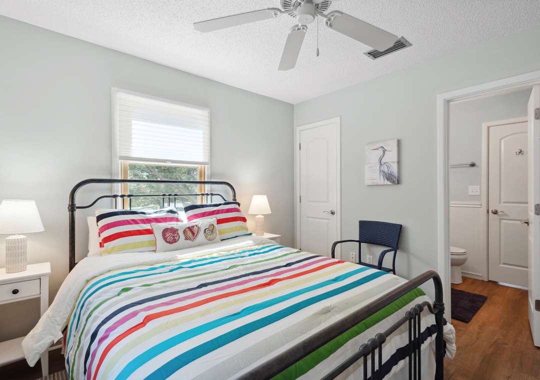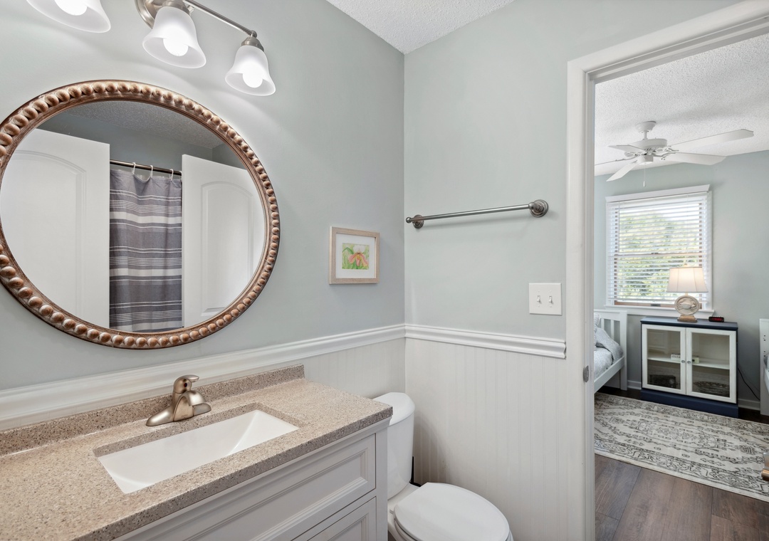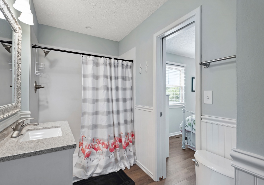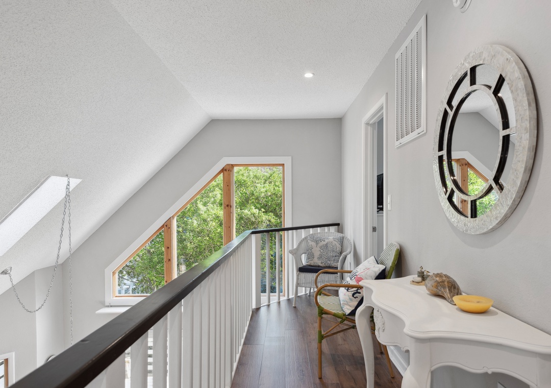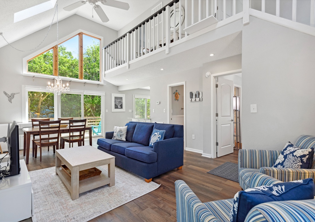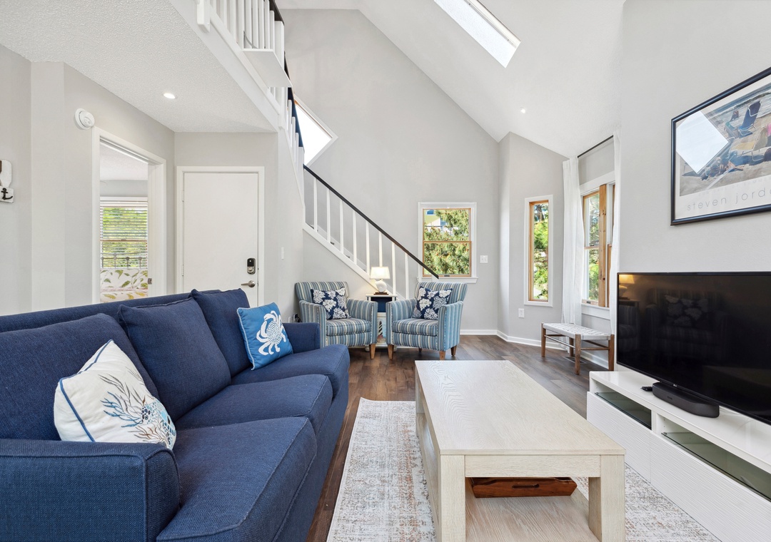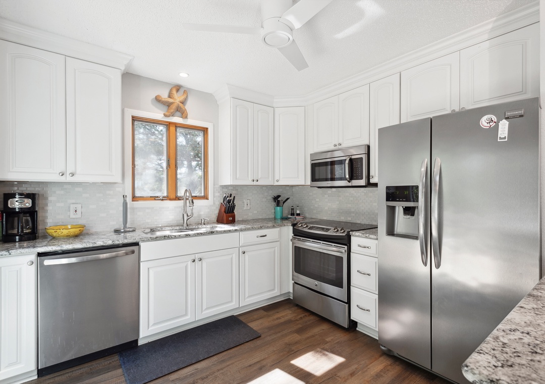 After a day at the beach or exploring town, come home and relax in the open-concept living area with vaulted ceilings and skylights that create a bright and airy vibe with abundant natural light. This fabulous combination living/dining space leads out to an expansive wrap-around deck where you lounge in the sun for your daily dose of Vitamin D. Back inside, get dinner started in the brand new kitchen with stainless steel appliances and granite countertops. Gorgeous LVP flooring flows throughout the entire home, including the bedrooms. The main level queen suite features an updated semi-private bath, and two more bedrooms upstairs share a Jack-and-Jill bath. Outside, you'll find a thoughtfully landscaped yard with charming walking path to a raised deck with seating for relaxing under the mature oak trees.