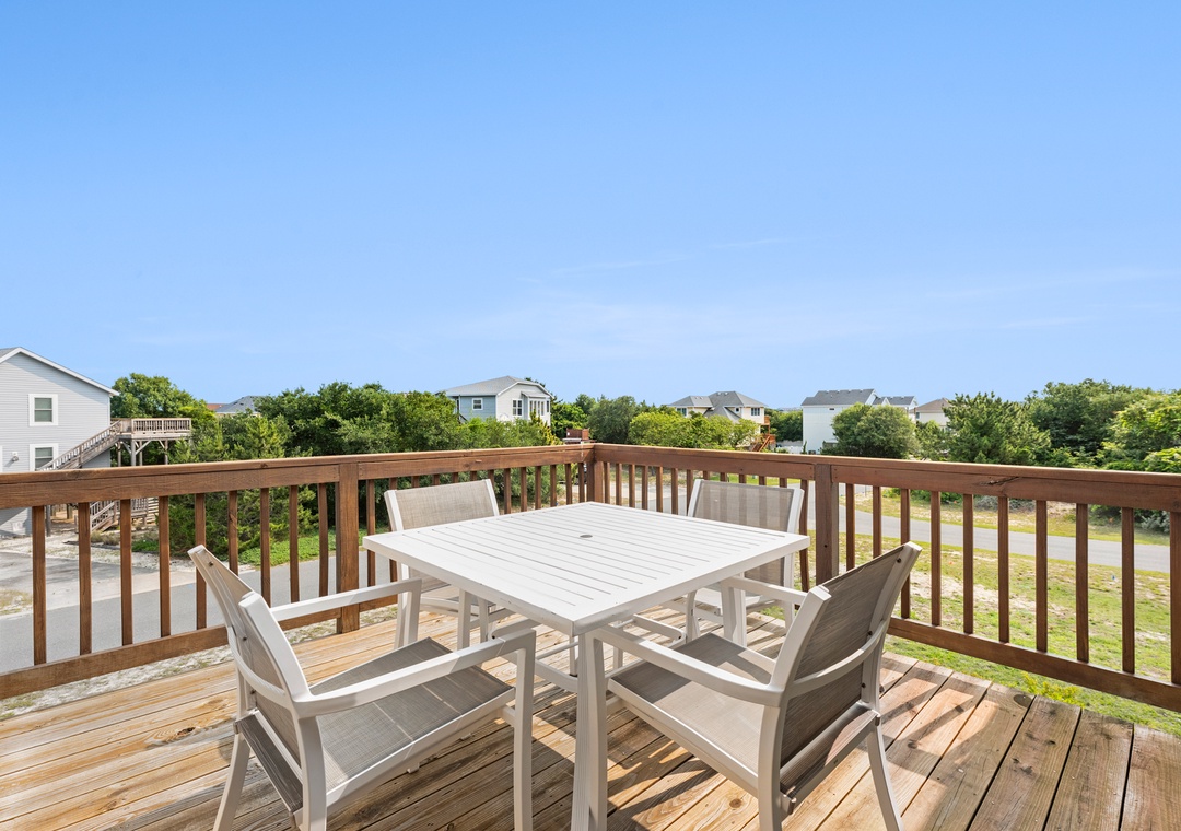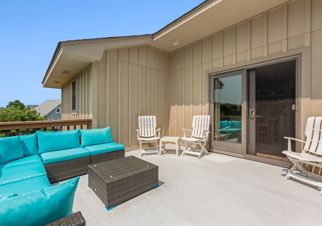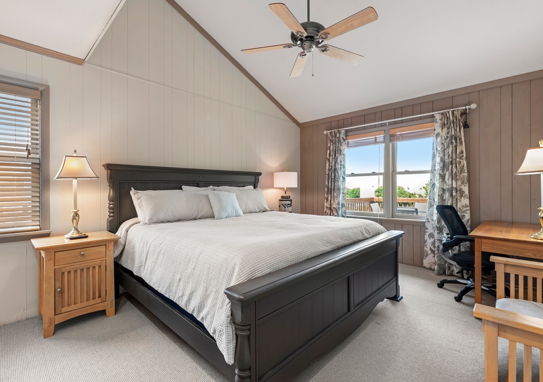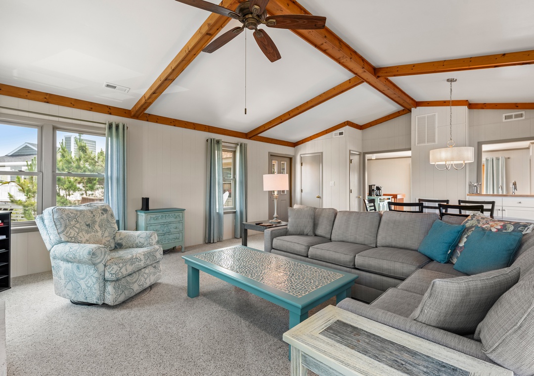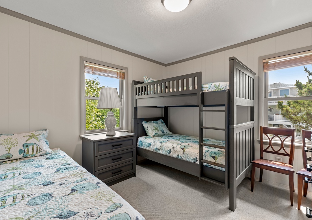 Also on the top level are 4 bedrooms, one being a king bedroom with a private bathroom and three others sharing access to two hall bathrooms. This property offers ample space for a fun-filled family beach getaway!