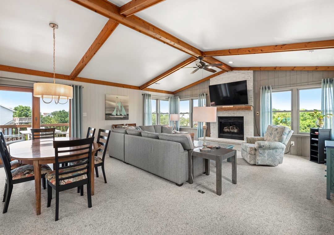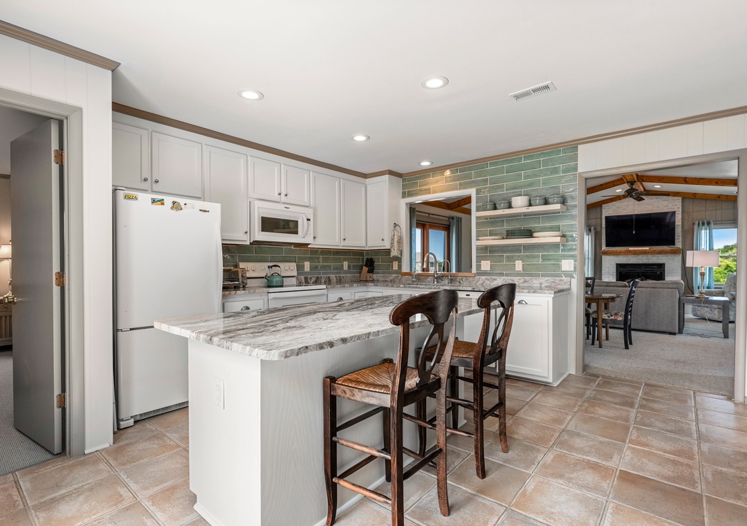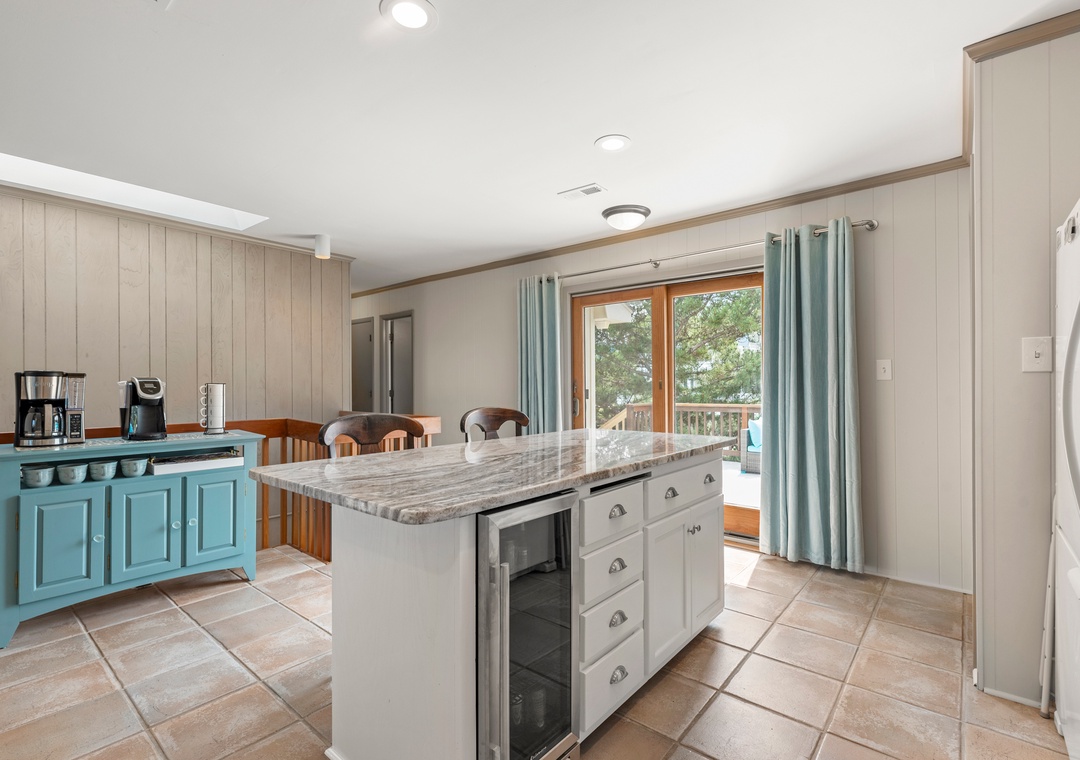 Upstairs, the top level features a spacious family room with a sectional, swivel recliner chair, and a smart TV. The open-concept design leads you to a kitchen with white cabinetry, granite countertops, an island with seating for two, an undercounter beverage fridge, coffee bar, dishwasher, and garbage disposal. Enjoy meals around the long dining room table and dry bar.