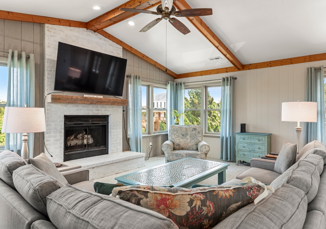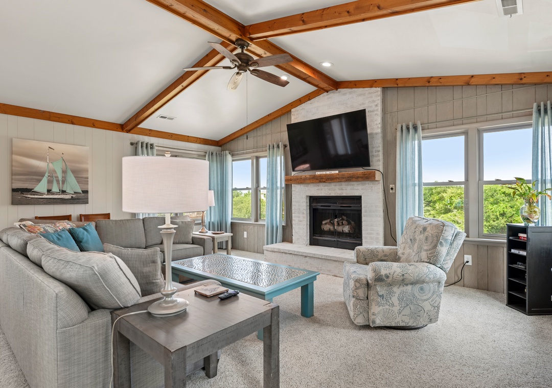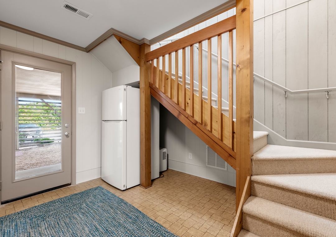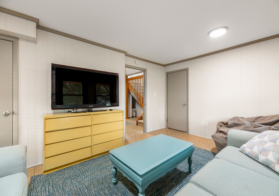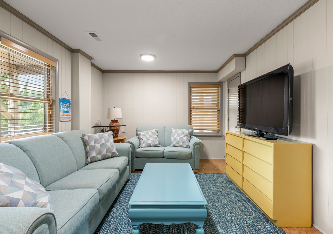 This two-level home features a ground level where you'll discover a media room equipped with a large TV, board games, a sofa, loveseat, and a Lovesac. There's also a full-size fridge for extra storage, a laundry area with hooks for your beach towels, and a convenient half bath.