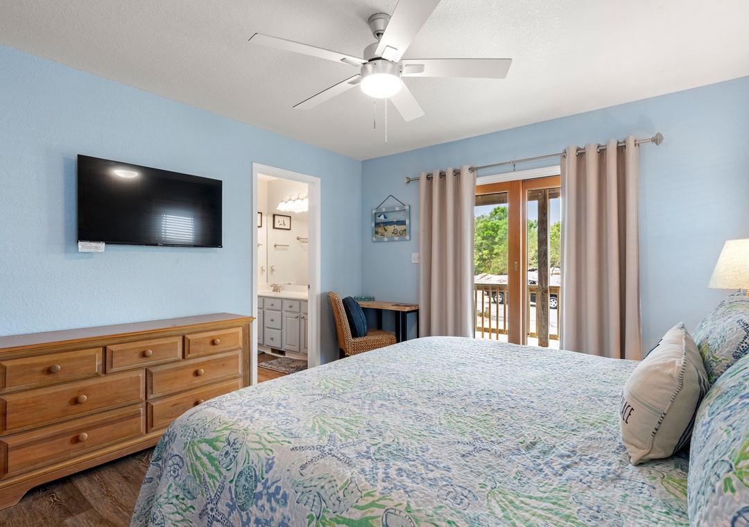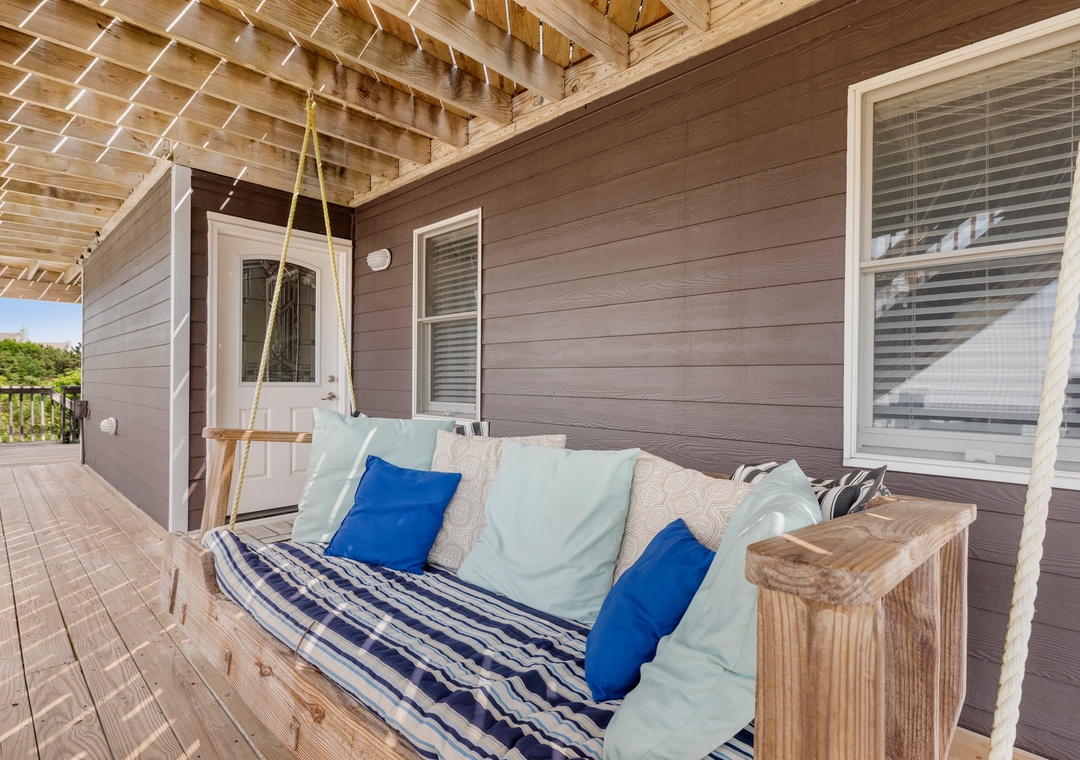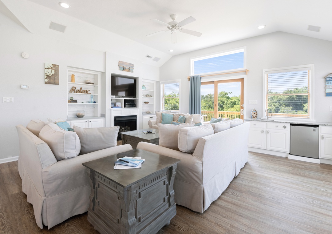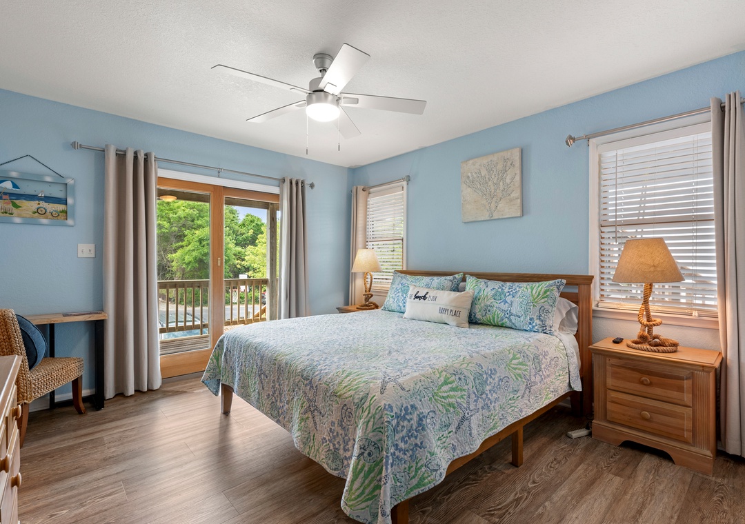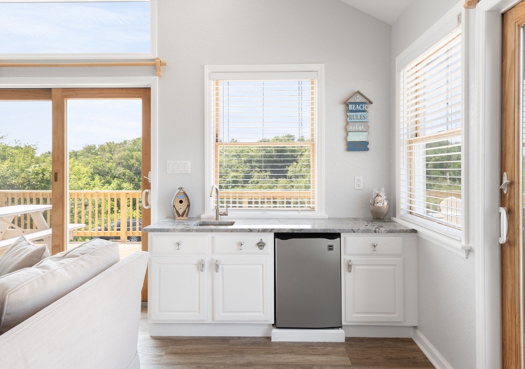 With over 1,000 square feet of decking, there's no shortage of outdoor living space at Salty Duck. Curl up with a book on the comfy porch swing bed or soak in the hot tub after a long day of fun in the sun. The reverse floorplan and open-concept layout upstairs take full advantage of the water views. The living area is tastefully furnished with coastal accents and plenty of seating. A wet bar is perfect for mixing cocktails to enjoy outside on the deck during sunset. All four bedrooms are conveniently located on the mid-level, two of which are ensuites. Brush up on your billiard skills in the game room, which provides direct access to the pool area. A second bar downstairs that includes an additional full-size fridge, perfect for convenient poolside drinks and snacks.