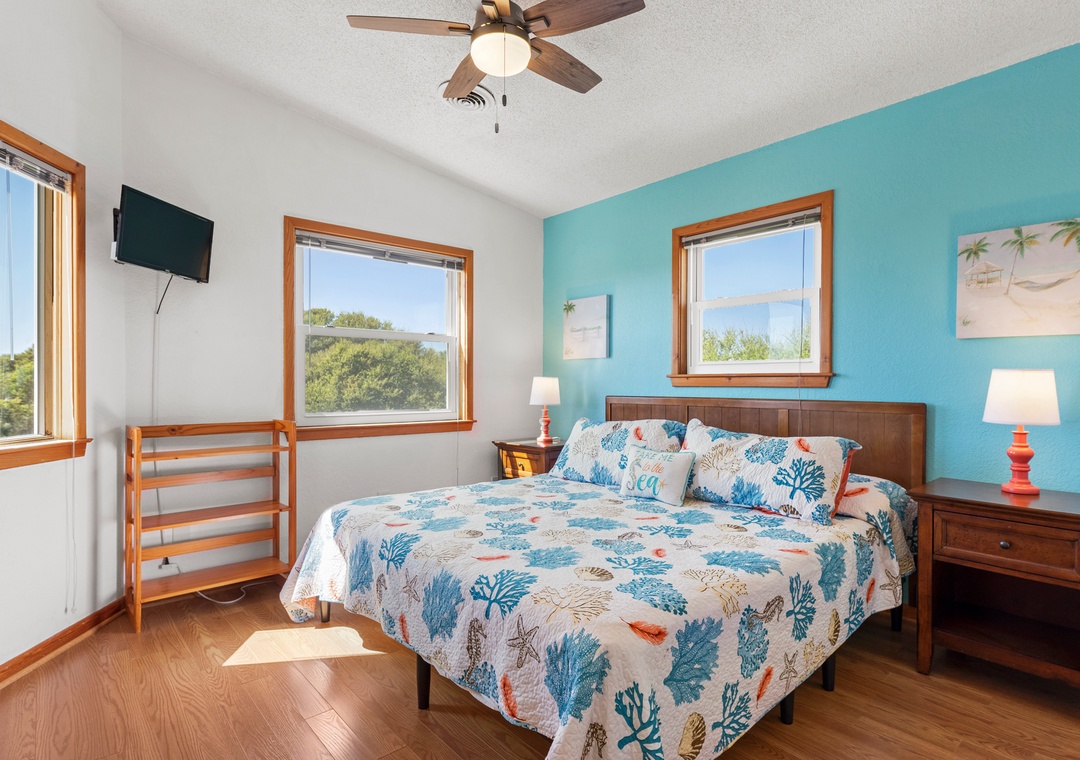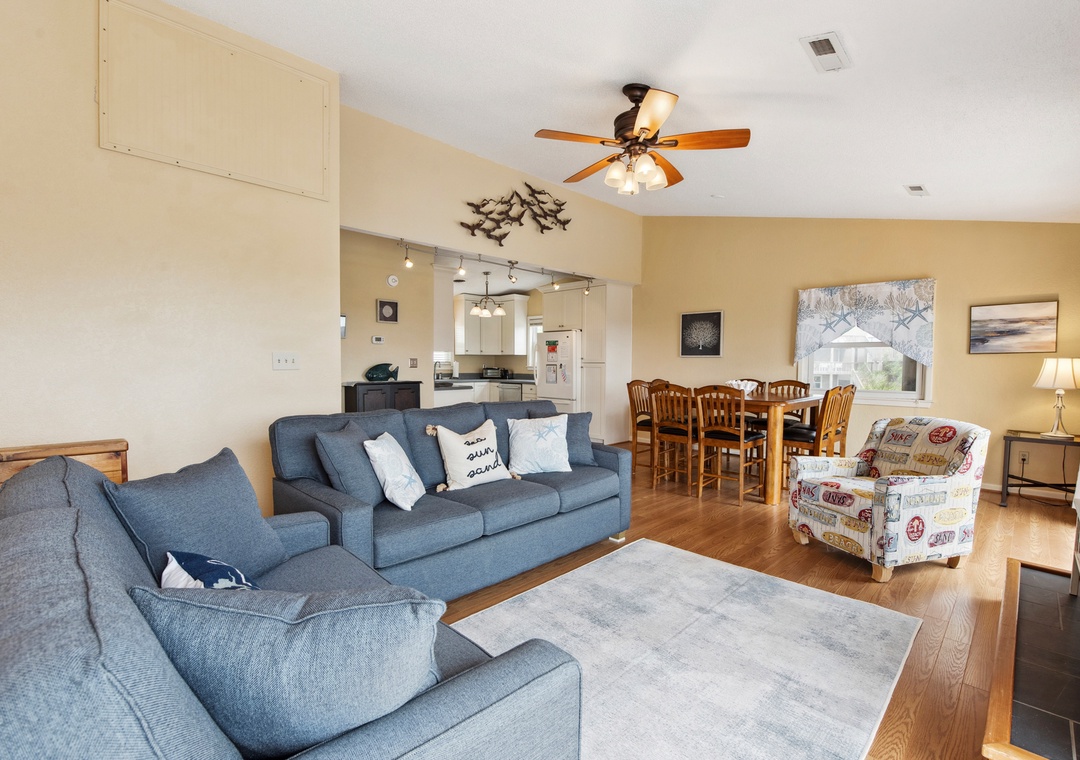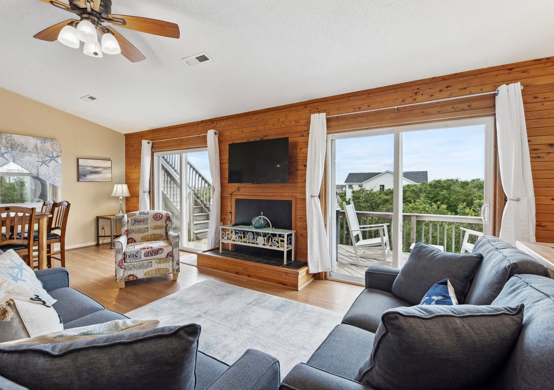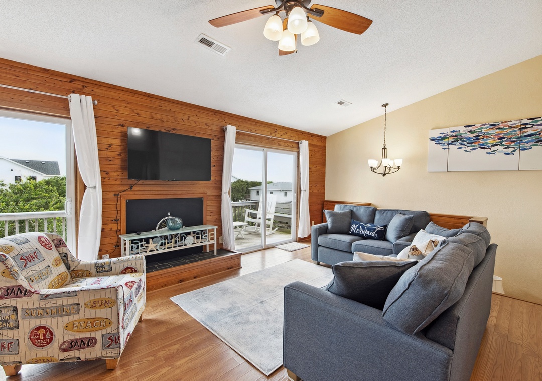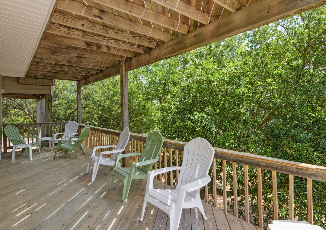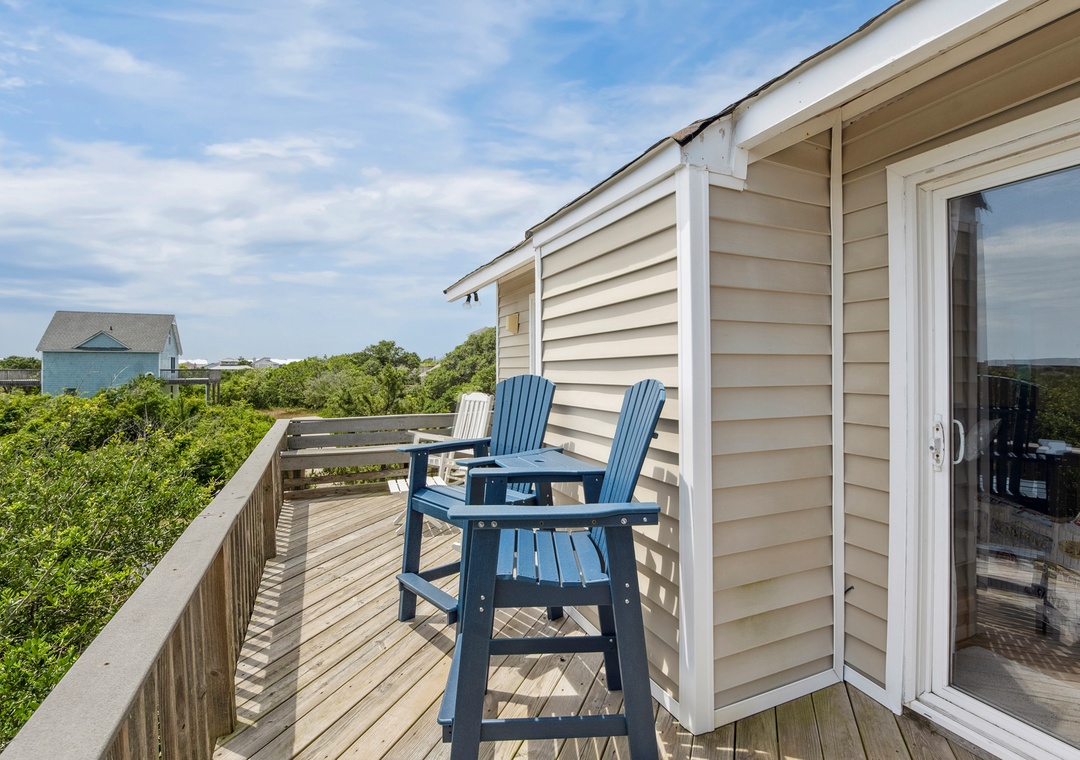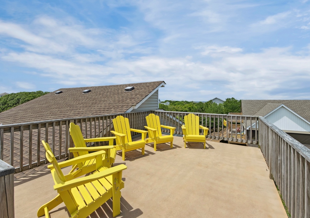 Imagine the perfect summer day taking in the sun on the private rooftop deck while enjoying the panoramic ocean and sound views. Or check out the evening sunset and nighttime stars while lounging in the Adirondack chairs and listening to the waves. Tucked under the rooftop deck on the top level is a fabulous spacious screened porch where you can enjoy your family meal. A comfortable outdoor sofa is perfect for enjoying a cocktail or having a family game night. The screened-in porch connects to an outdoor deck, accessible from the living room's two sets of sliding doors. These sliders let in lots of natural light to the great room in this reverse living home. This top-level features an open, well-appointed kitchen, a great room with a high cathedral ceiling, and a King Bedroom En suite. The second level features a main entry hallway which leads to 3 bedrooms and a full bath. The second queen bedroom has a private half bath and a sliding door to a covered private deck offering plenty of seating. The third bedroom has two twin beds and plenty of closet space. The fourth bedroom sleeps four comfortably in two sturdy bunkbeds. Each bedroom is equipped with a Smart TV. The ground level features an enclosed outdoor shower and a large laundry utility room.