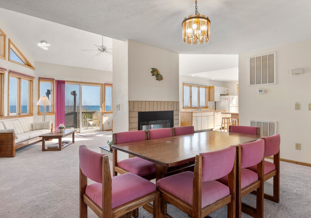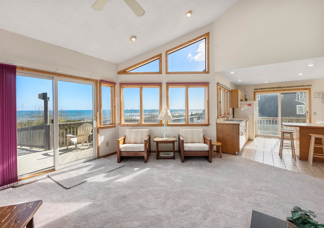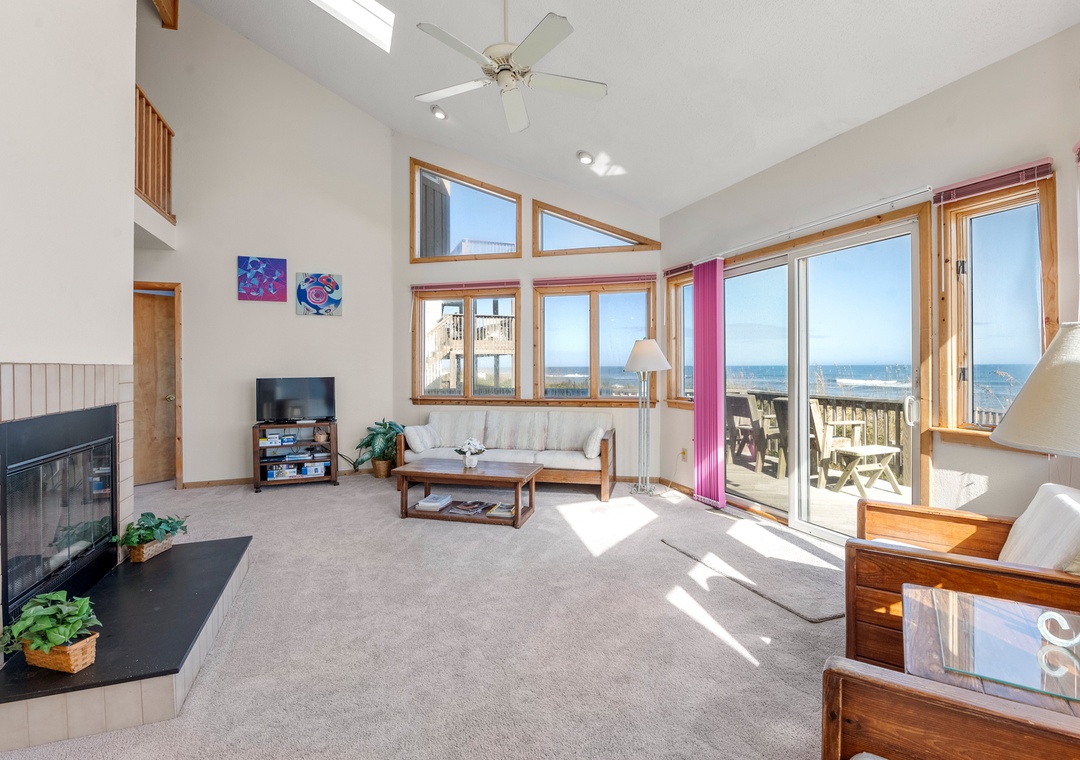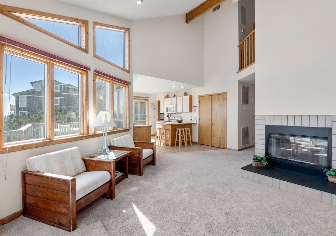 Back at the house, the thoughtfully designed open-concept layout in the great room allows everyone to admire the unobstructed ocean view. Unique features include soaring vaulted ceilings, transom windows, and a two-sided wood burning fireplace. When you're not dining out at one of Duck's fabulous restaurants, prepare meals at the house using the well-equipped kitchen. It's situated right off the great room with a breakfast bar overlooking the living area, so you can still mingle and enjoy the spectacular view while cooking.