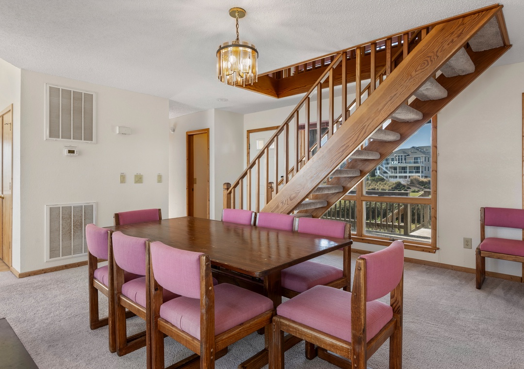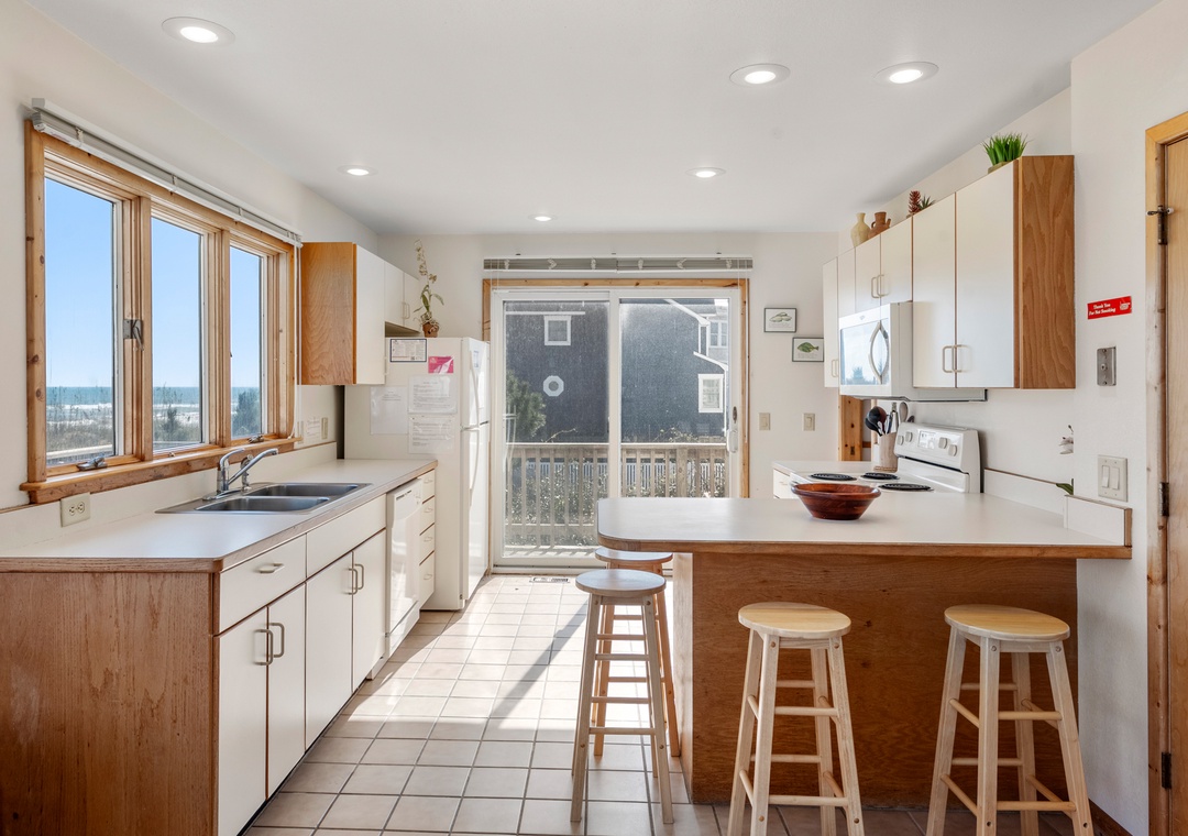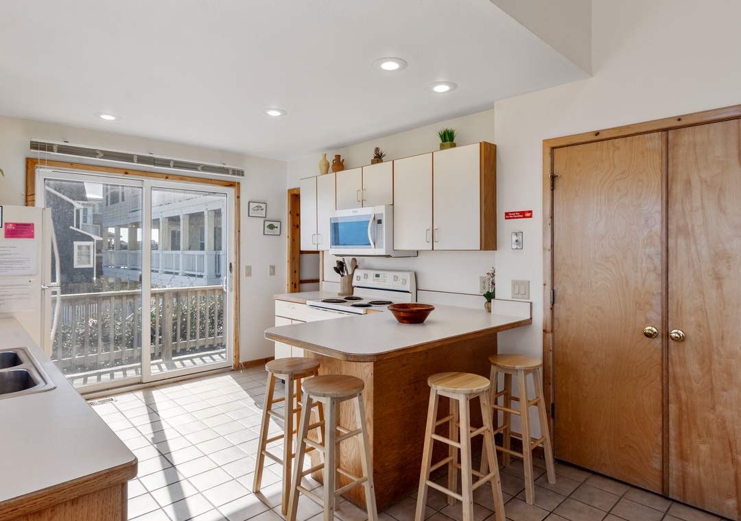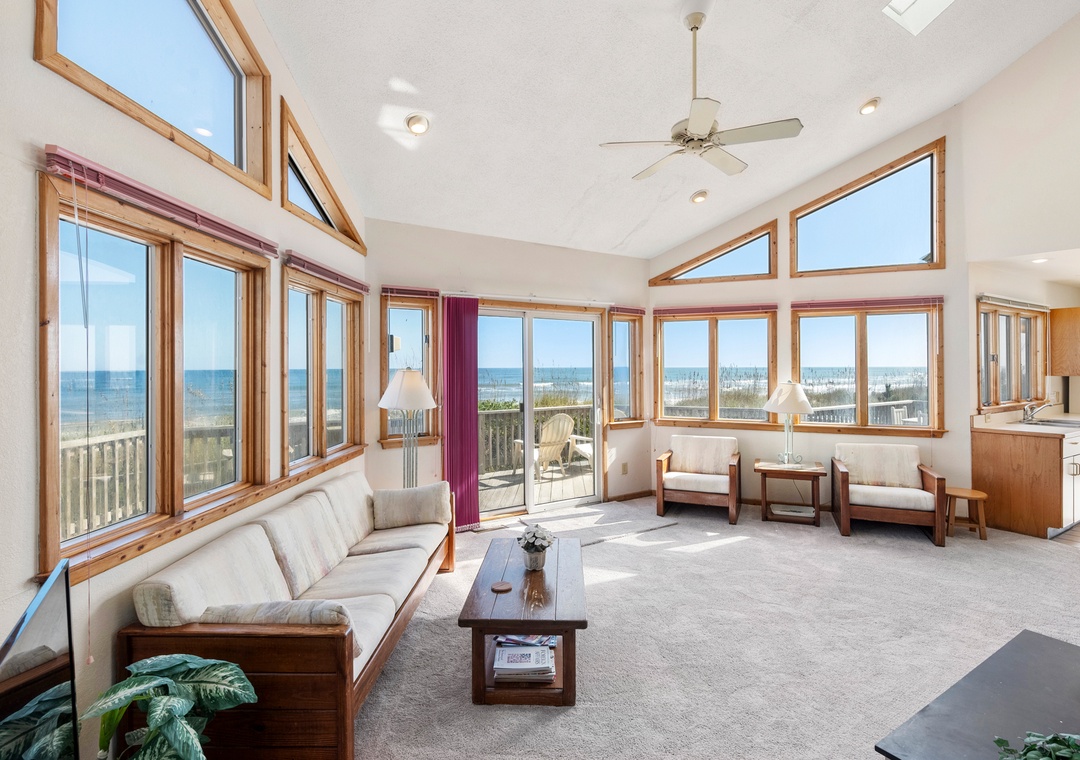Back at the house, the thoughtfully designed open-concept layout in the great room allows everyone to admire the unobstructed ocean view. Unique features include soaring vaulted ceilings, transom windows, and a two-sided wood burning fireplace. When you're not dining out at one of Duck's fabulous restaurants, prepare meals at the house using the well-equipped kitchen. It's situated right off the great room with a breakfast bar overlooking the living area, so you can still mingle and enjoy the spectacular view while cooking.